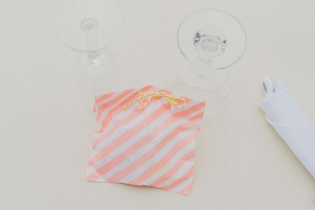 “I made a lot of the decor as well such as flowers from of dyed coffee filters, and bunting garlands and table squares from vintage sheets. We searched flea markets and thrift stores for months to find all of the containers for the centrepieces and little ceramic figurines to put next to each one. Phillip and I made our cake topper too. He painted it and put it all together and I put the clothes on the little people. We made it in a ‘Small World’ inspired style since we got engaged on that ride at Disneyland in December 2013!”