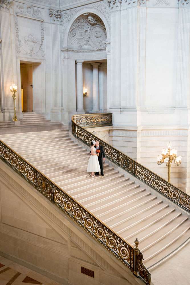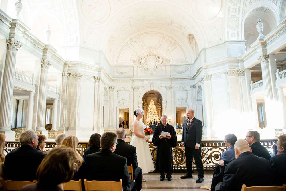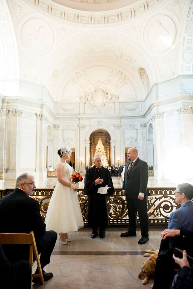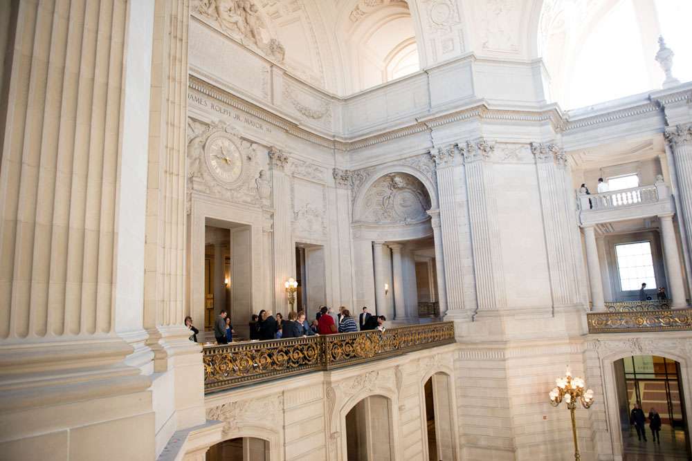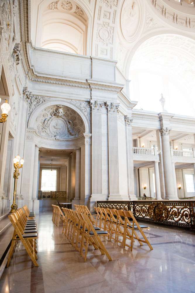 “Our ceremony was held on the 2nd floor Mayor’s balcony of San Francisco City Hall, overlooking the rotunda and grand staircase. The space is beautiful on its own, and we didn’t need any additional decorations. Judge Breyer kept things short and sweet, which was perfect for us. We met with him a few weeks before the ceremony and rather than writing traditional vows, he requested that we each send him a paragraph about why we loved the other person. The rules were that we both had to submit something, and had to send it to him without telling the other what we’d written so that he could read them aloud for everyone to hear for the first time during our ceremony. Both paragraphs brought smiles, tears, and laughs from our guests.”