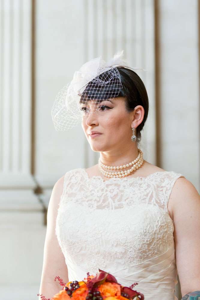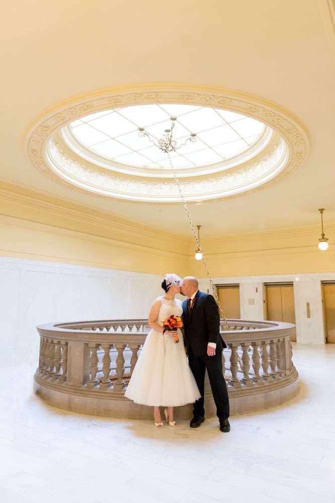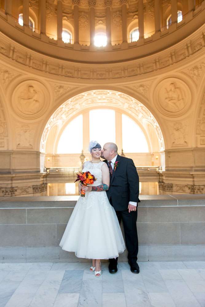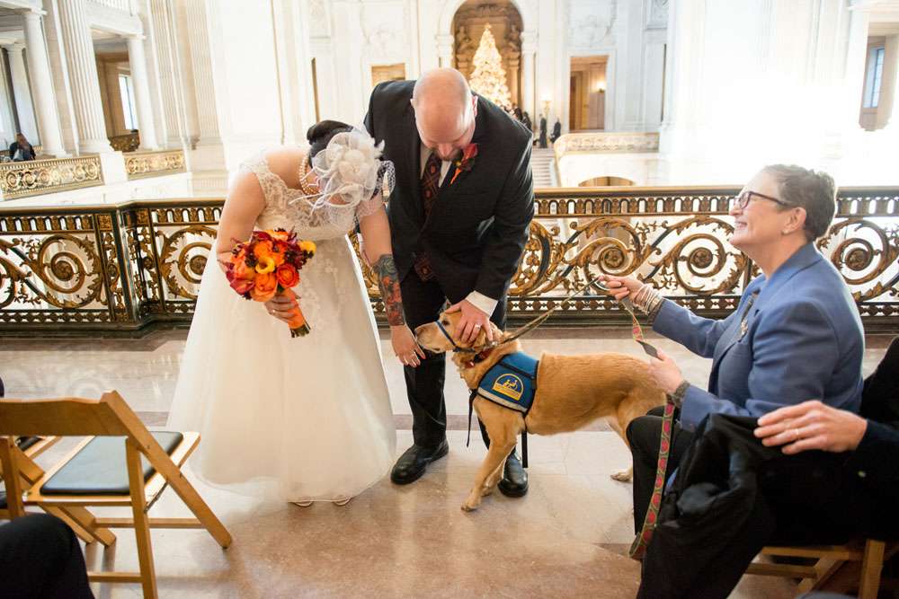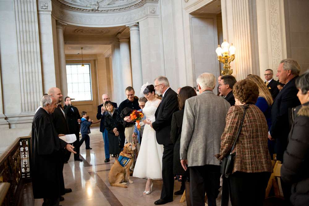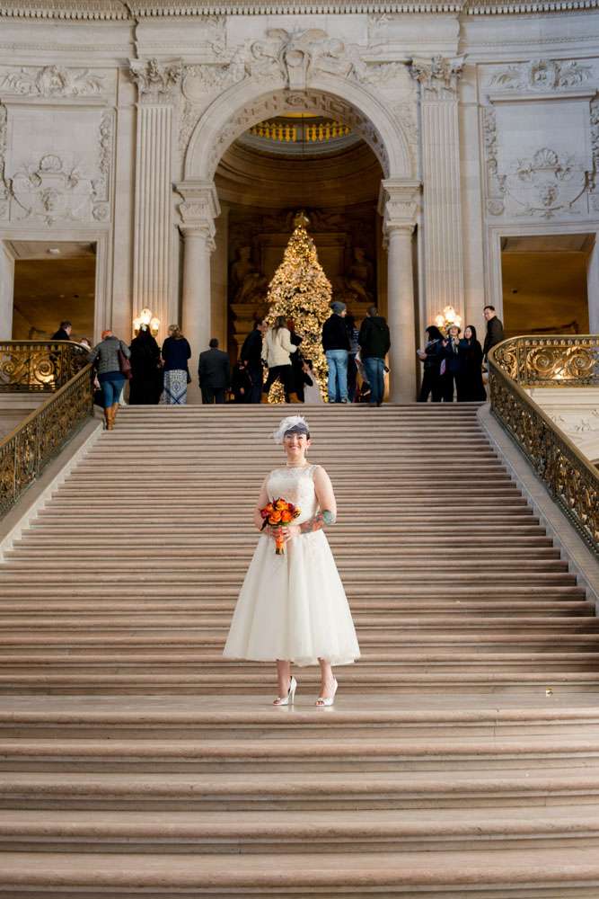 “Our ceremony was held on the 2nd floor Mayor’s balcony of San Francisco City Hall, overlooking the rotunda and grand staircase. The space is beautiful on its own, and we didn’t need any additional decorations. Judge Breyer kept things short and sweet, which was perfect for us. We met with him a few weeks before the ceremony and rather than writing traditional vows, he requested that we each send him a paragraph about why we loved the other person. The rules were that we both had to submit something, and had to send it to him without telling the other what we’d written so that he could read them aloud for everyone to hear for the first time during our ceremony. Both paragraphs brought smiles, tears, and laughs from our guests.”