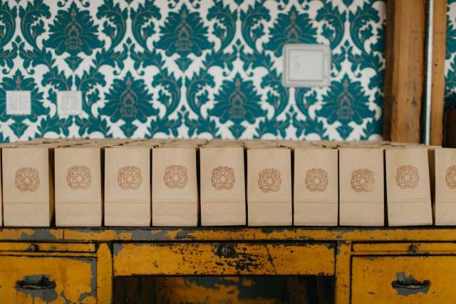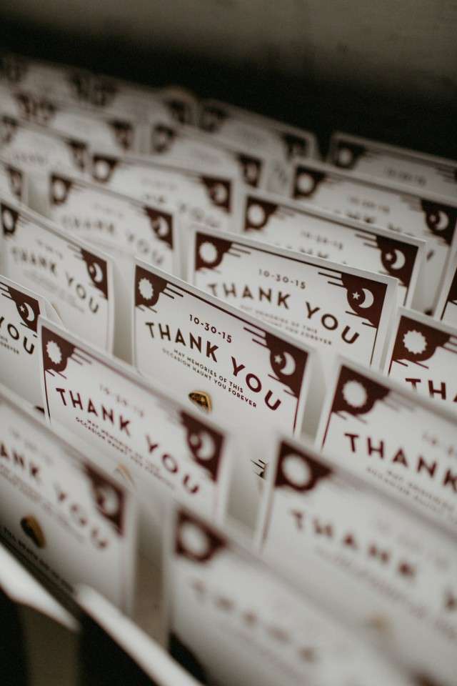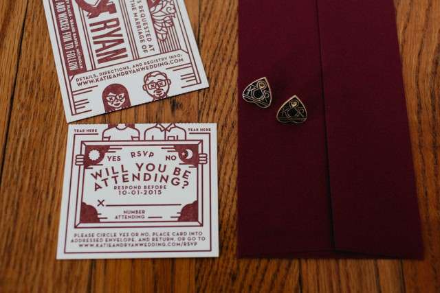 “One of our main goals was to create a memorable experience for our guests. Starting with the invites, the guests would RSVP by tearing a card off the main invite, decapitating printed illustrations of us.