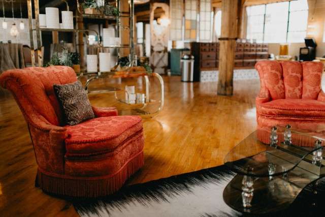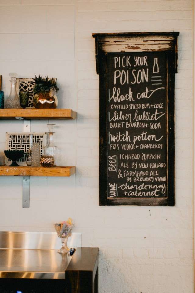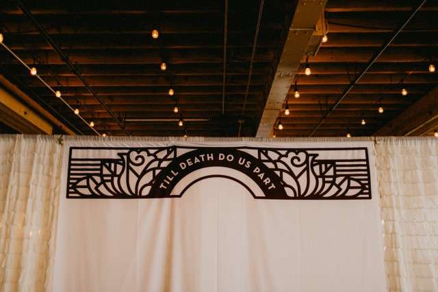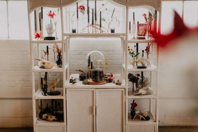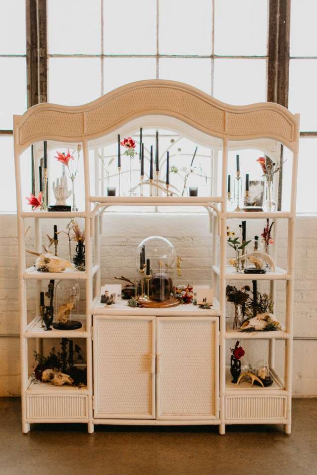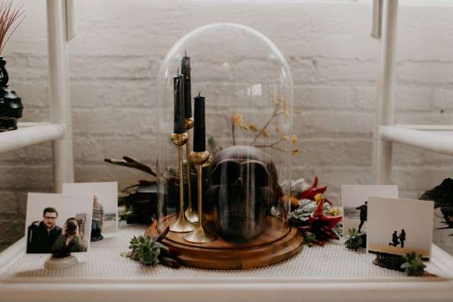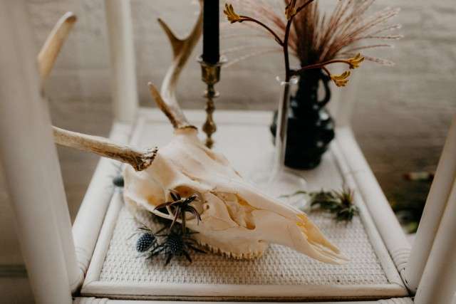Another unique aspect of the wedding was the décor. The bride’s vintage business, Odin’s Vintage Vault, supplied the skulls, antlers, vintage candlesticks, glass beakers, and domes to decorate the venue and led wedding signs were used to anchor the space and add a low, atmospheric glow that tied everything together.