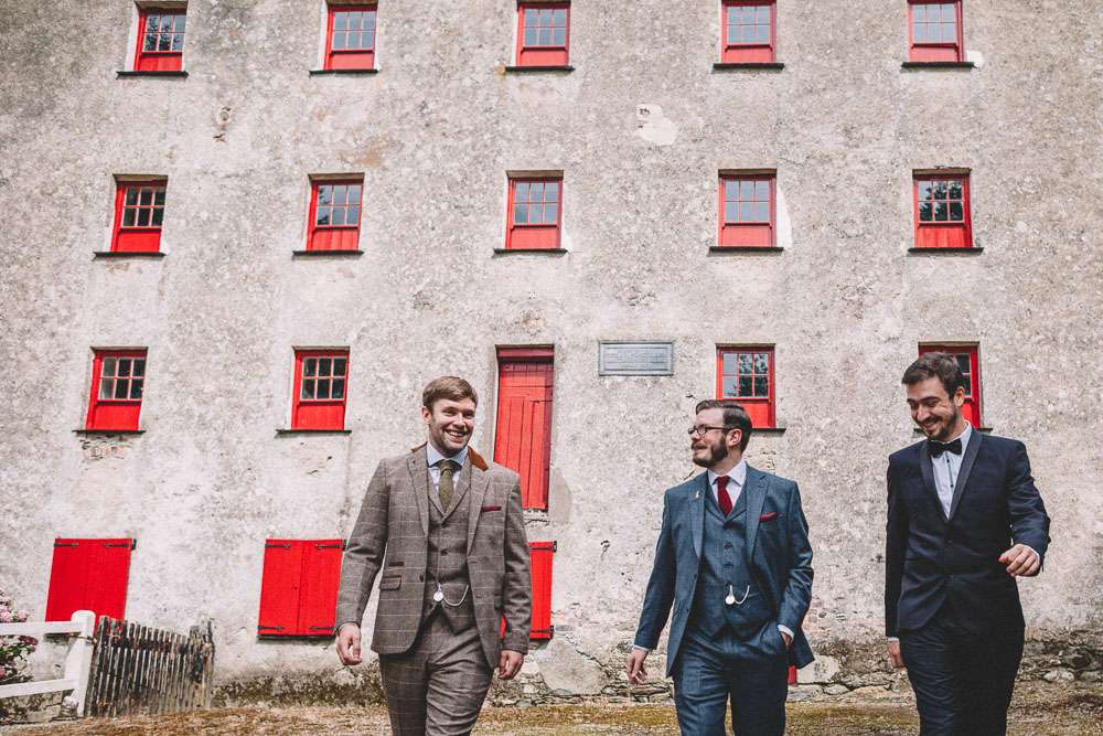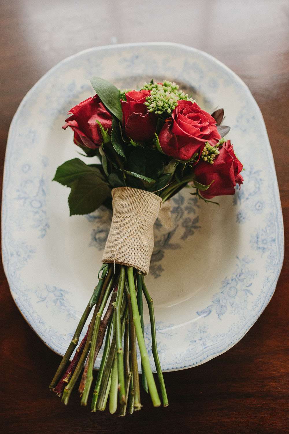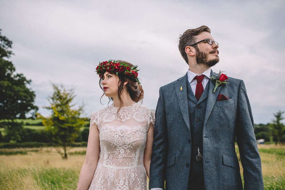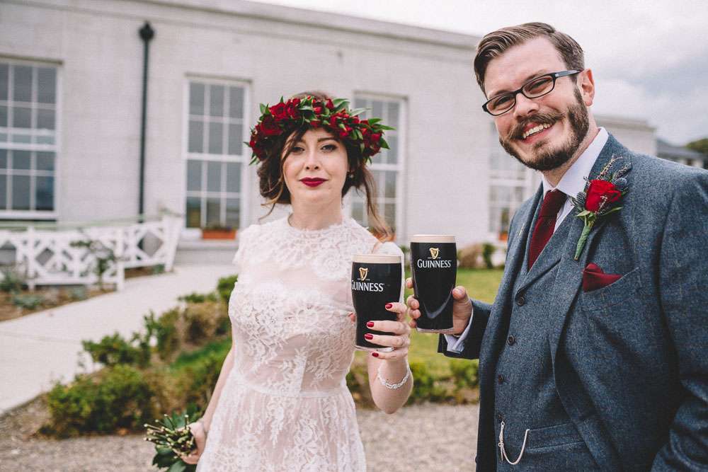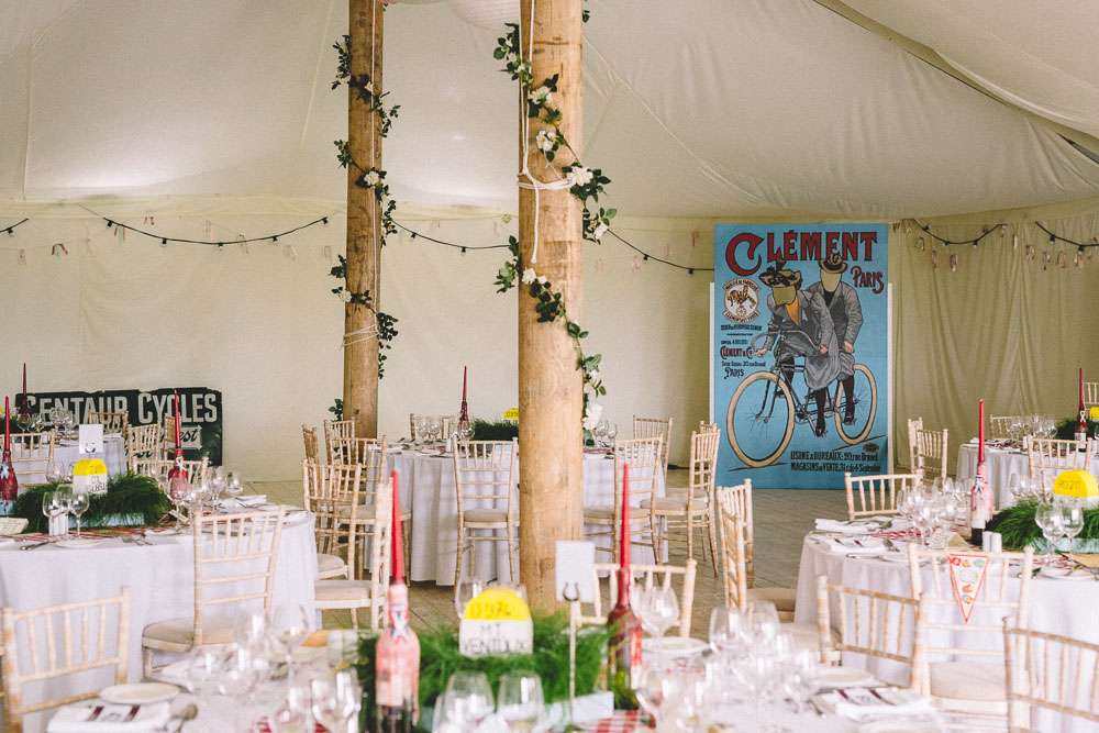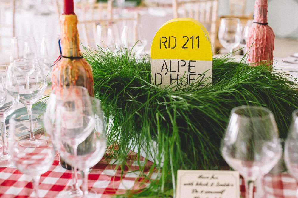 Isolde and Mark were married in Ireland in August. Their wedding had a vintage Tour de France theme! “We often cycle together and love driving through France”, explained the bride. “Our yearly holiday involves driving from London to Provence and camping where ever we can. We didn’t stick to the theme slavishly though – my dress wasn’t very french looking – just what suited me. I love red roses and didn’t want pastel flowers so we went with those instead.”