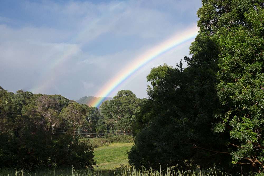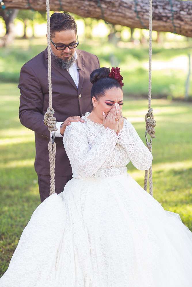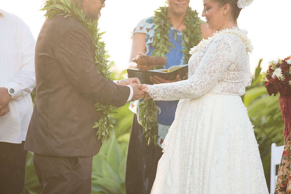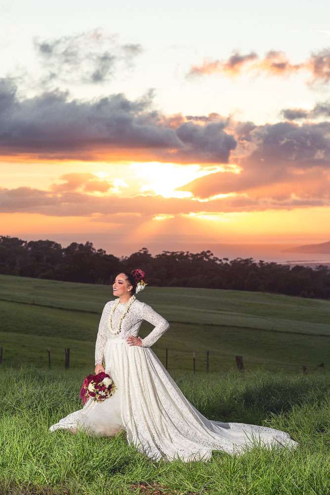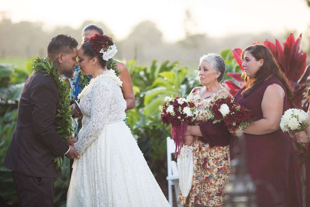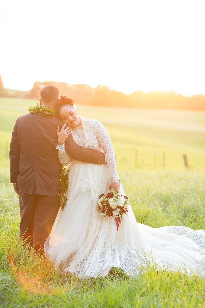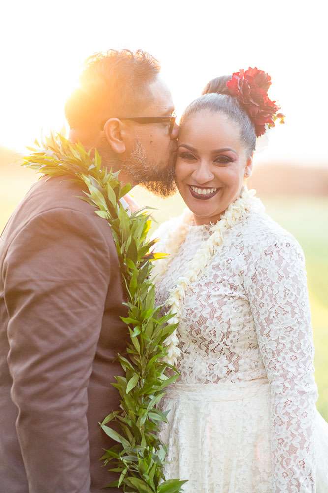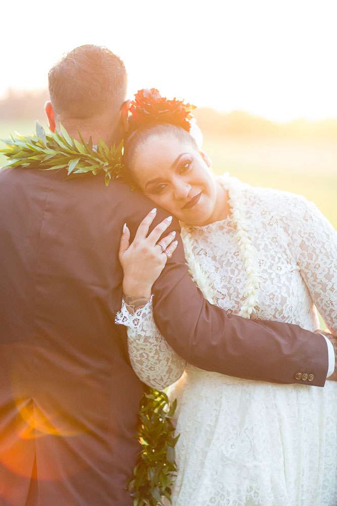 The wedding was held at Ka Hale Olinda in Makawao. “Being in the entertainment business, Kanoa and I chose the venue because it overlooked Rainbow Bridge, one of the last places Jimi Hendrix performed at in the 70s”, she continued. “Our ceremony was very personal for us, as our officiant, Pulama, is Kanoa’s cousin and we’ve spent a great deal of time with her. She also helped me write out and learn how to pronounce a section of my vows in Hawaiian as a surprise to Kanoa. I was so nervous about that! I didn’t want to mispronounce anything or offend Kanoa’s family by saying the wrong word by accident! Kanoa and I gave each other leis (a Hawaiian tradition that sometimes replaces rings), which are now dried and hanging in our bedroom. We also did ‘honi’, our foreheads press together and we inhale each other’s exhale. This is also a Hawaiian tradition that bonds us together by sharing ‘ha’ (Hawaiian for ‘breath’, the source of life.)
