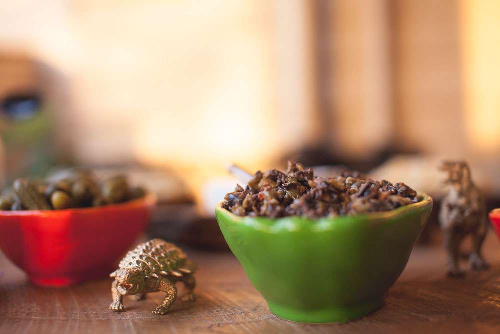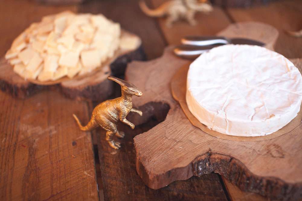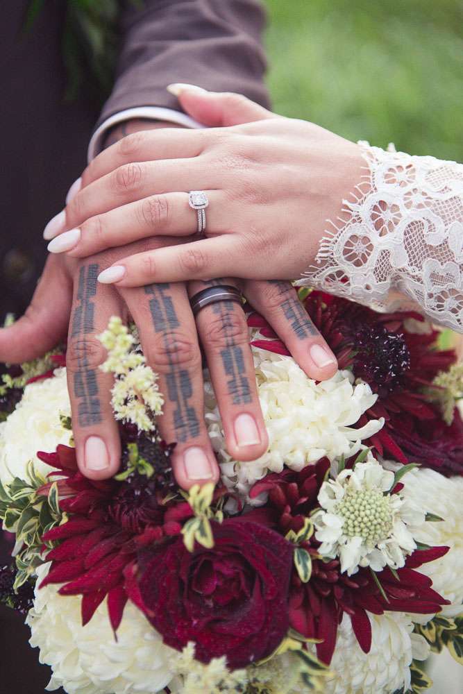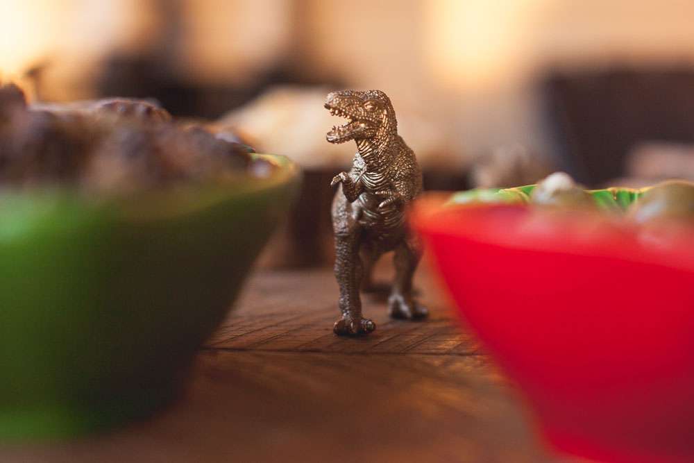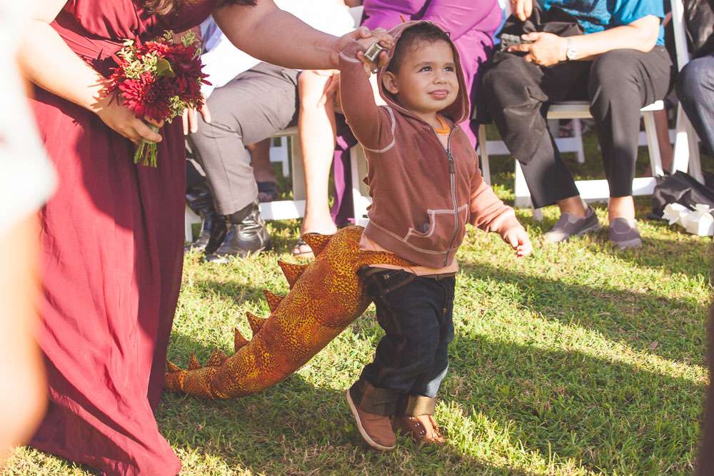 “I’ve always felt like I was born in the wrong era”, she said. “I would’ve loved to be the age I am now in the mid 60s/early 70s. I tried to incorporate that vibe when designing my wedding dress. My favourite movie is The Virgin Suicides; I love the modest yet gloriously romantic dresses in that film. I also promised my mom that I would cover all of my tattoos for our ceremony, hence the higher neckline and long sleeves (which I absolutely adore). As far as the other details of the wedding theme, Kanoa pretty much gave me free reign. Autumn is my favourite season, so I tried to stick with the vintage theme and incorporated dark reds and rich fall colours. The dinosaurs just sorta happened on their own!”
