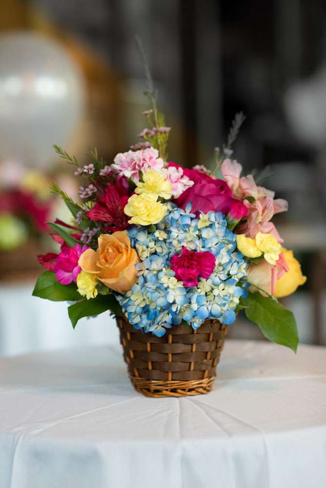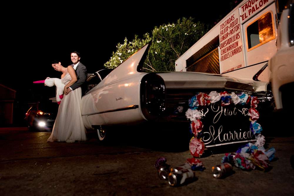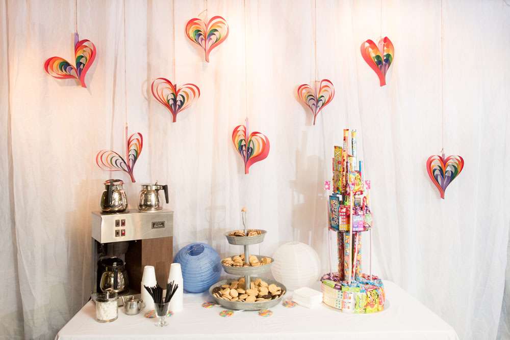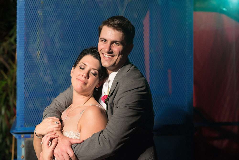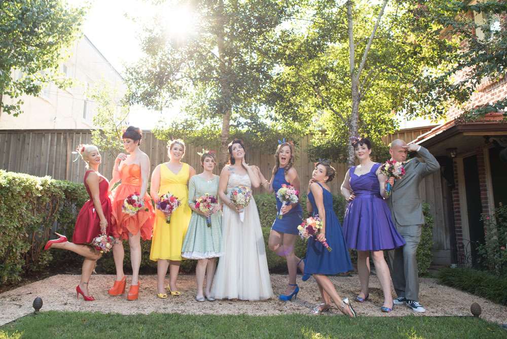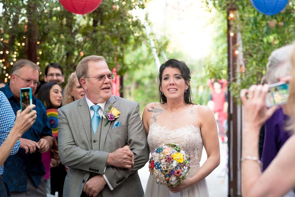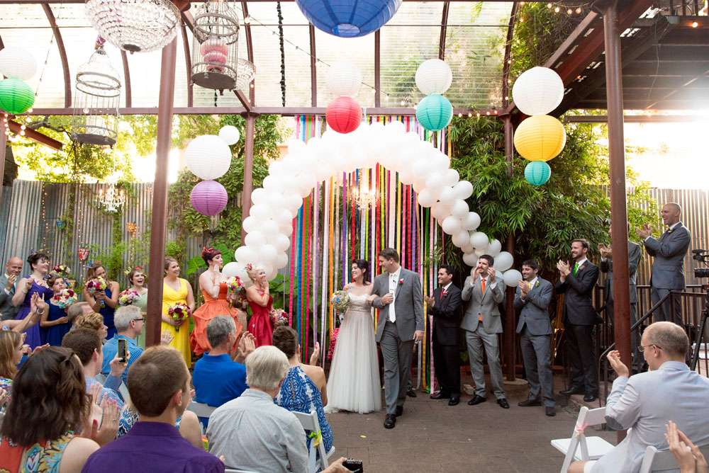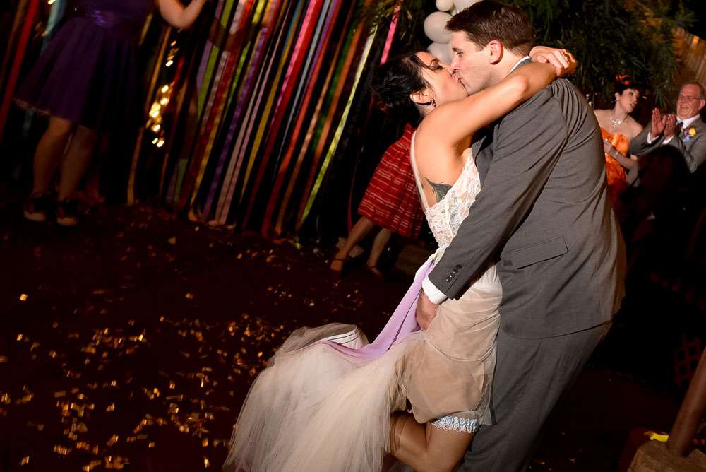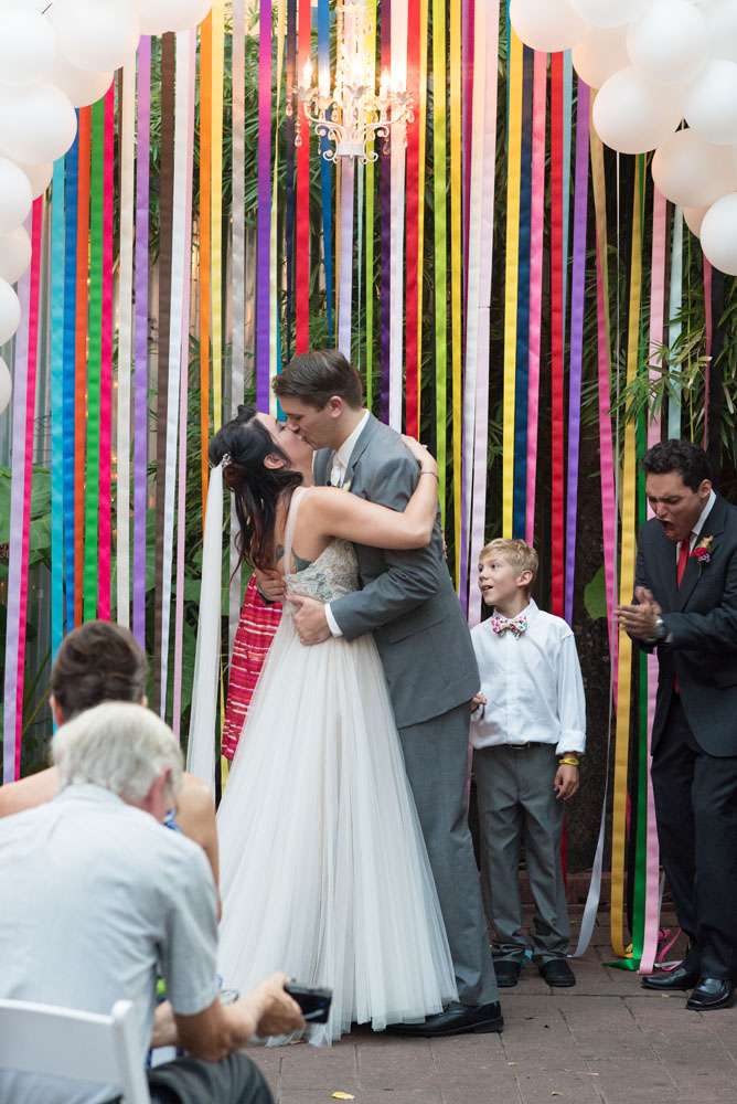 Lauren and Ray’s September wedding had a colourful carnival theme! “Our wedding was a rainbow carnival”, explained the bride. “We wanted to bring out the happy, colourful kid in everyone that was there. Ray also wanted a BIG party. Some of our most fun details were the stuffed animals that we bought to give away as prizes. There was also a fire-breather and an aerialist. Part of our ‘entertainment’ was both of us (and the wedding party!) getting dunked by friends and family in an actual dunk tank to raise money for the honeymoon!”