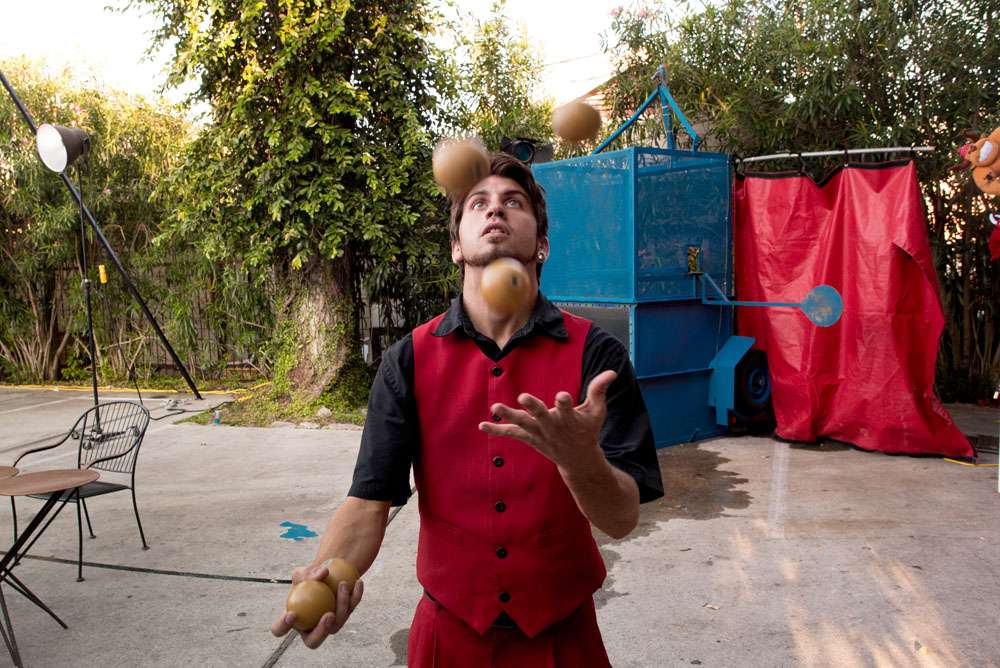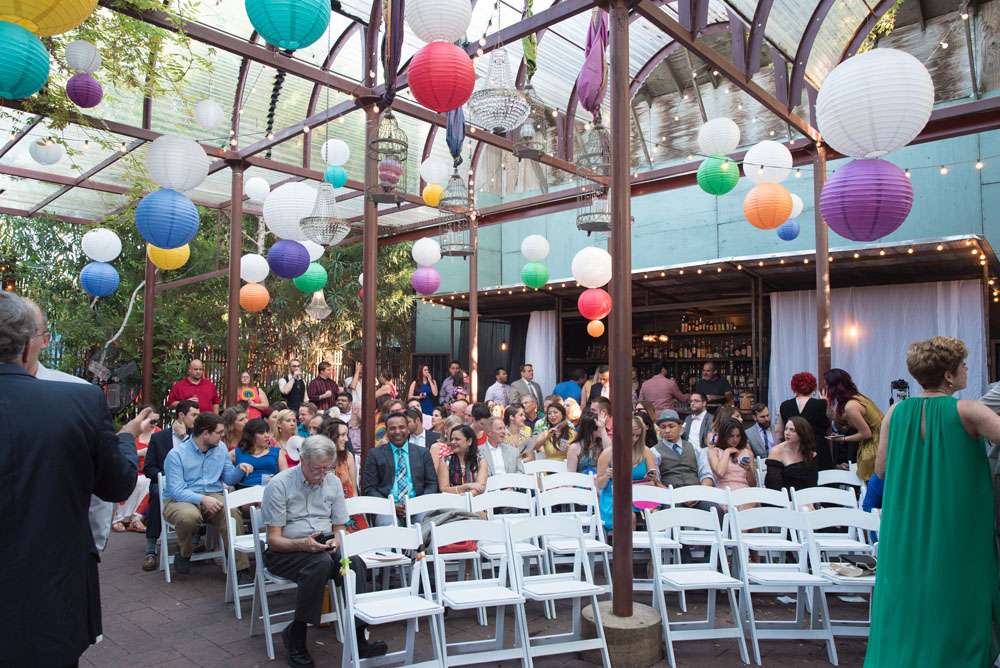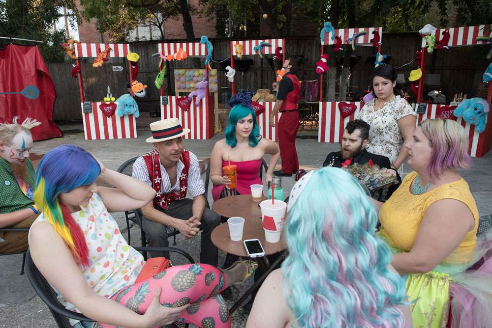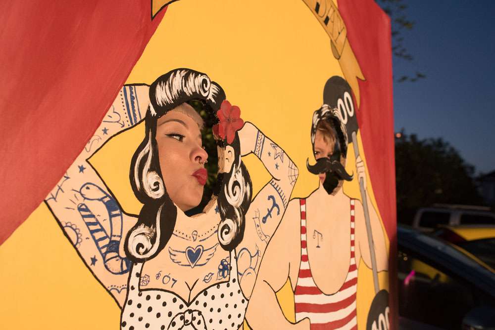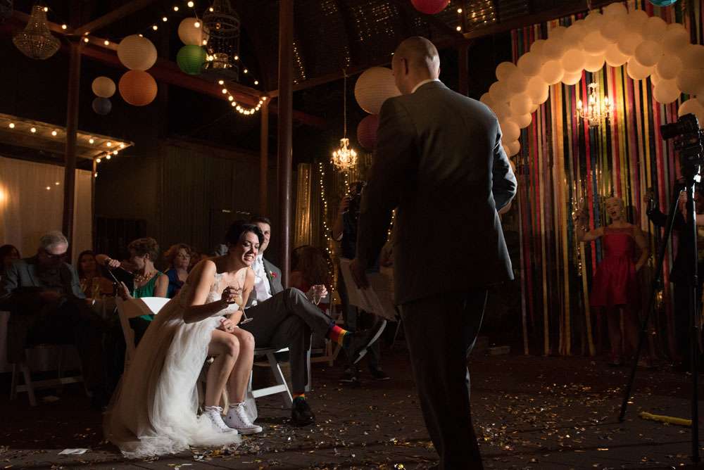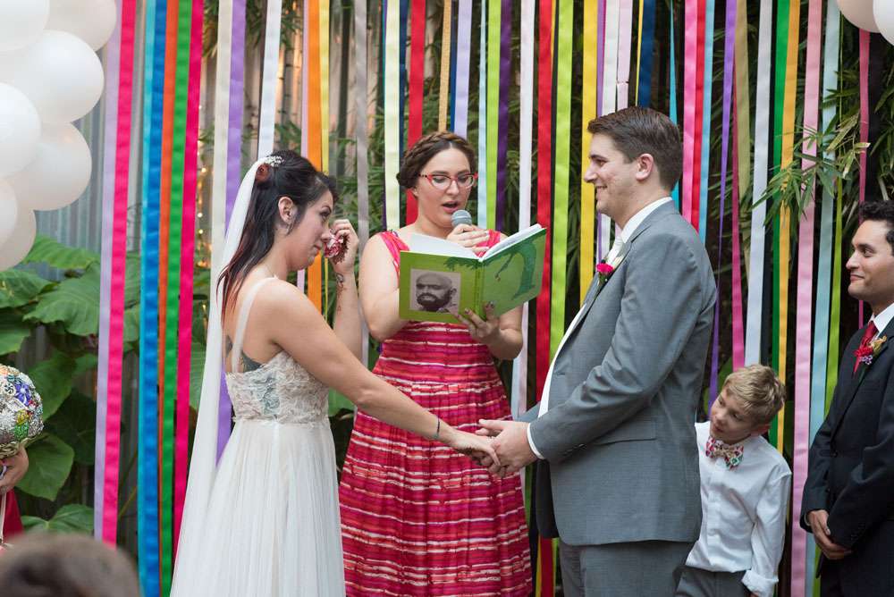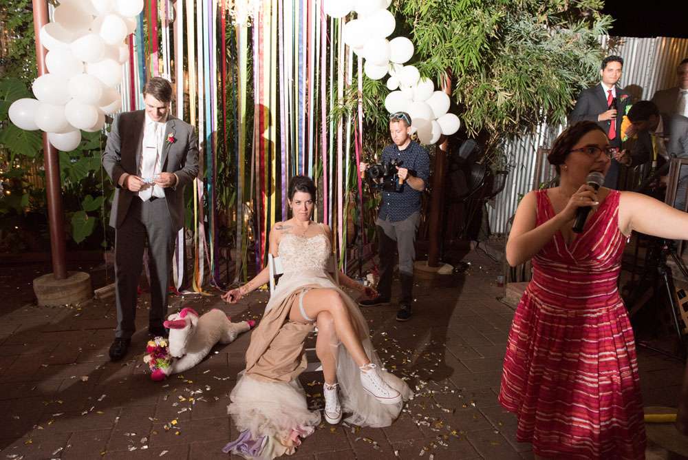 The ceremony was super emotional. “I cried the whole time!”, the bride laughed. “Somebody’s Getting Married from The Muppets Take Manhattan played while people took their seats and I walked down the aisle with my father to Sea of Love of Cat Power with full on waterworks. It was THE moment and it was hitting me all at once. Our officiant was a friend ours in the burlesque community. She typically hosts shows but this was her first wedding. She read her script from the inside of a copy of The Giving Tree (my favourite childhood book). We wrote our own vows too which were based on unconditional love, support, acceptance and striving to be the best versions of ourselves. We wanted the ceremony to be short and sweet and right afterwards the carnival games and entertainment began!”