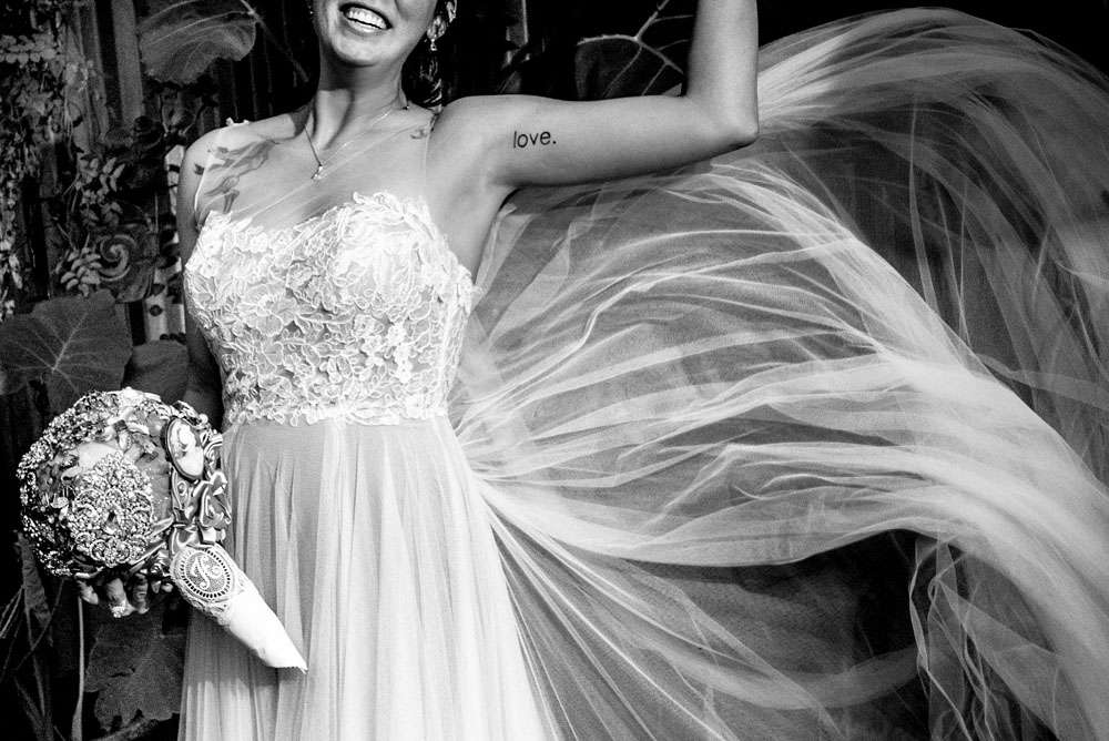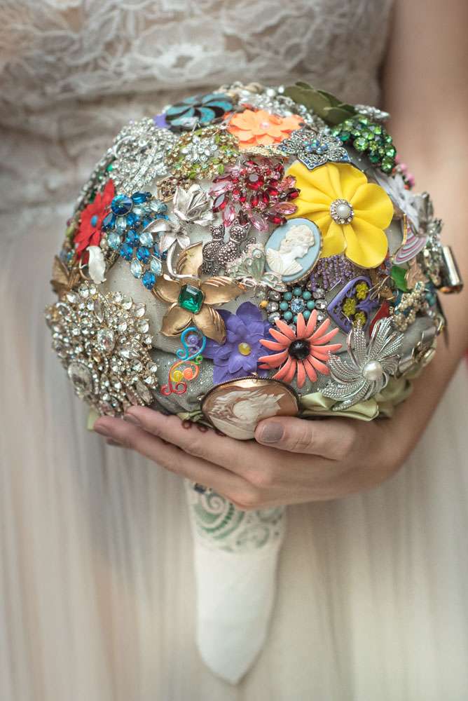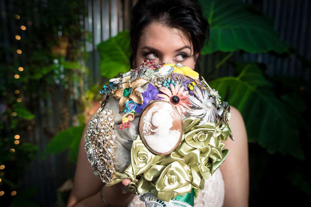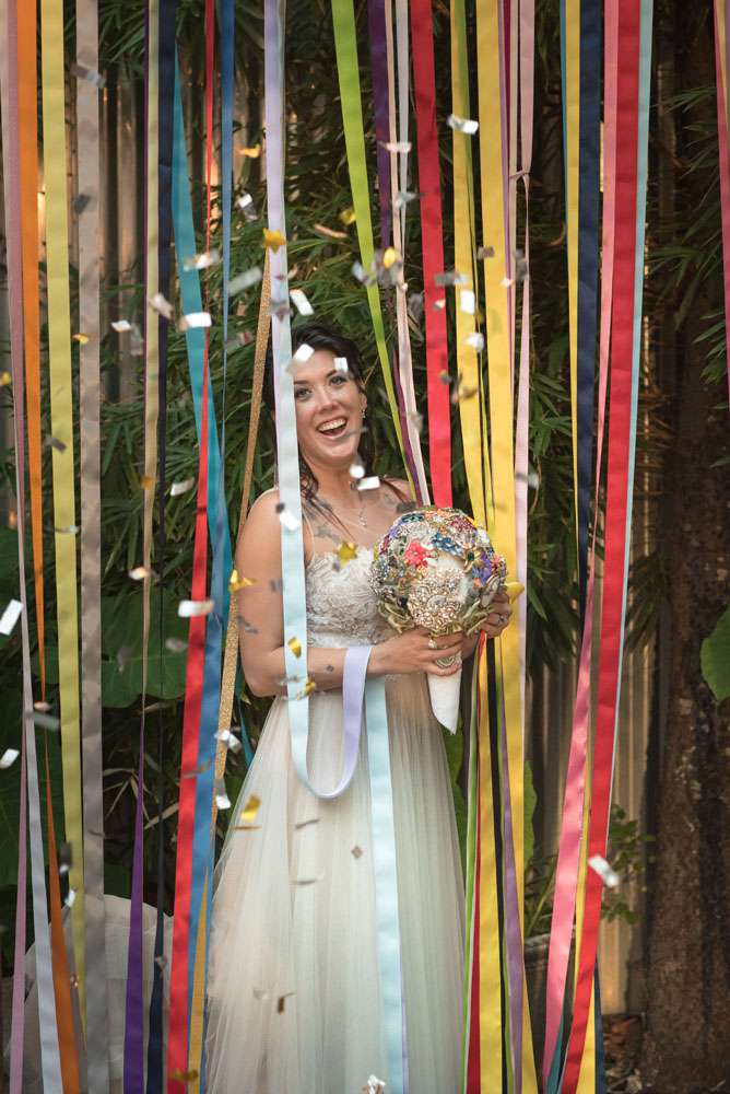 “Almost everything was DIY including the decorations and the building of five carnival booths and games”, she continued. “Our friends helped a ton contributing lots of handmade things too. My brooch bouquet was very special as I was able to represent grandparents that we’ve lost by using their brooches, military pins and jewellery in it.”