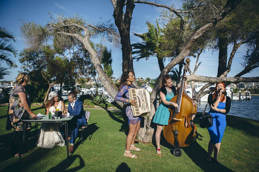 “We had Velvet Betty, which is a vintage caravan that has been converted to a bar, set up at the ceremony site. They had set up giant games around for everyone and were serving our guests as they arrived. We had a band called The Sirens playing during and after the ceremony to entertain the guests. They are a three-piece band comprised of an accordion, double base and singer.”