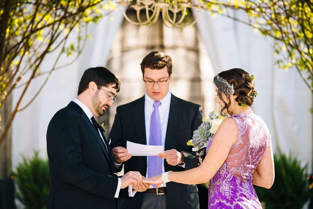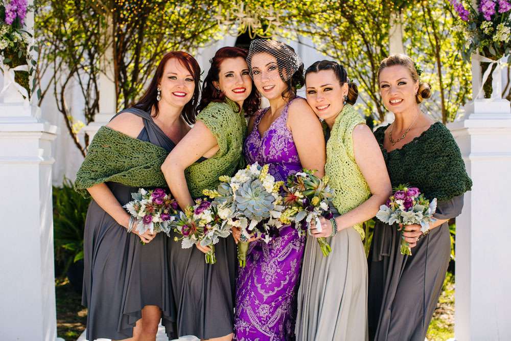 There was no traditional white for this bride, she wore an incredible purple dress! “My dress was purchased from Sunna Bridal on Etsy. My shoes were white sparkly heeled sandals from Blue by Betsey Johnson, and the flowers in my hair were handmade with bobby pins and plastic succulents by me and my bridesmaids. My veil was my ‘something borrowed’.”