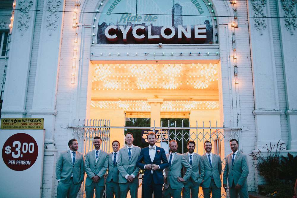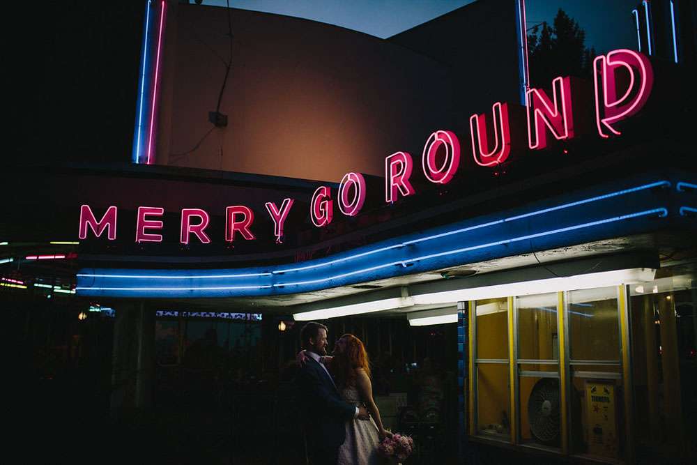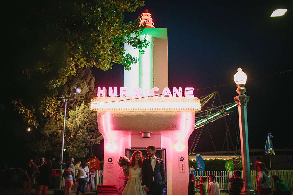 Max and Kristen were married at the groom’s family home, followed by their reception at a local amusement park! “We have a love for 50s fashion and general art and design aesthetics”, said the bride. “Lakeside Amusement Park supplied an art deco flare and an offbeat reception venue that we had always dreamed of having as a backdrop to our celebration.”