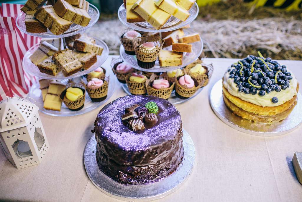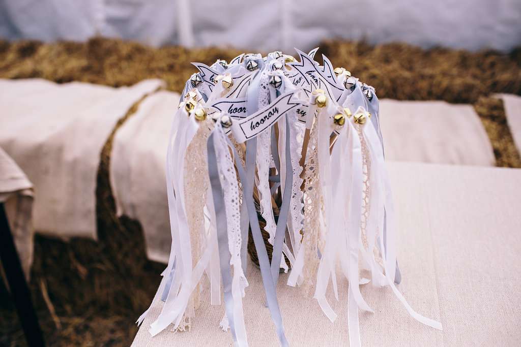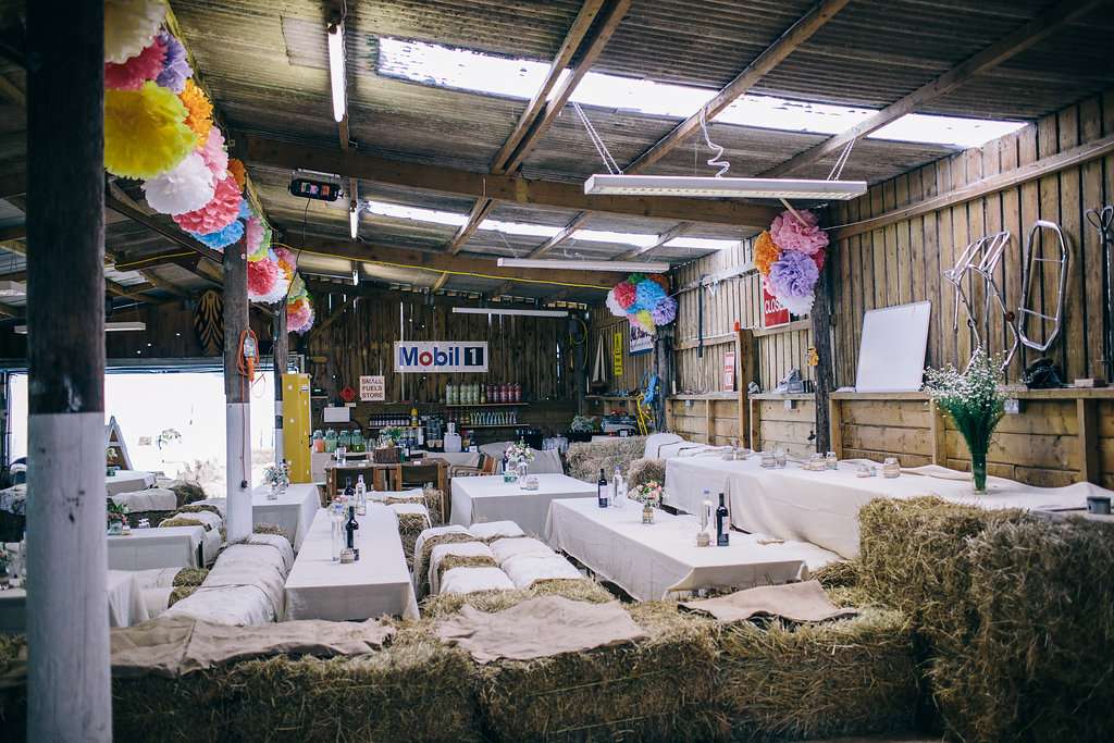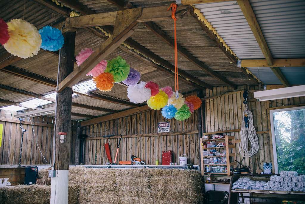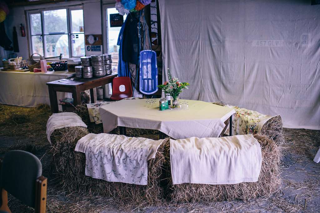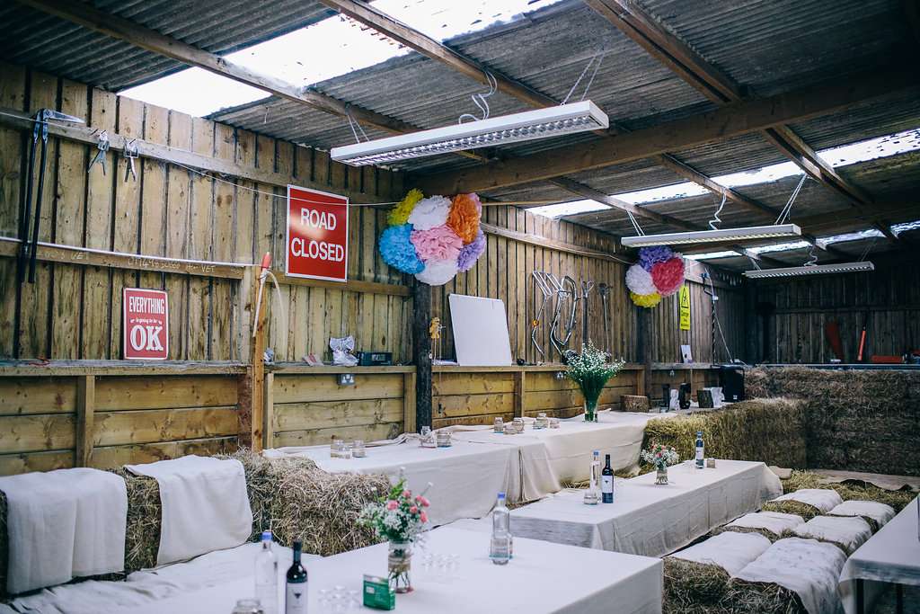 “Our guests bought homemade cakes for the desert table. We made pom poms over the course of many evenings with friends. The tables were old school tables sourced from eBay (which we sold afterwards!) and covered in dust sheets and chintzy bedspreads. We also had hay bales for seating and to create a bit of structure around the barn. We even grew our own hay in the land next to our barn.”