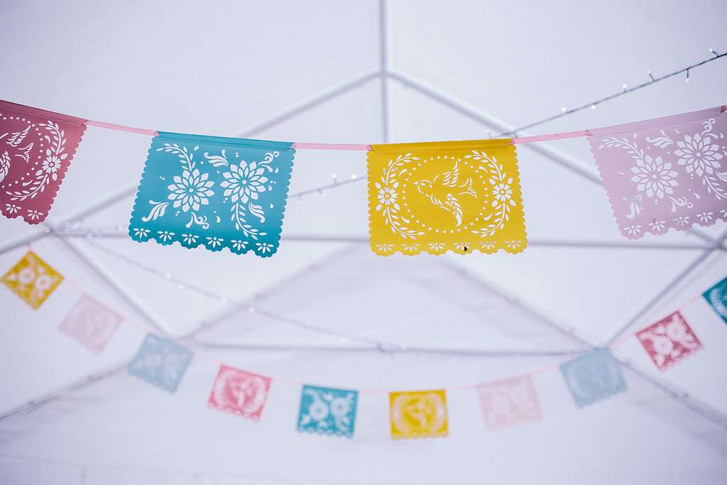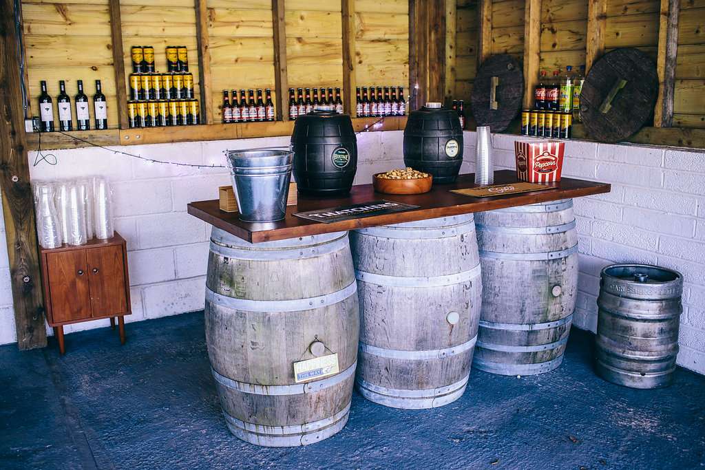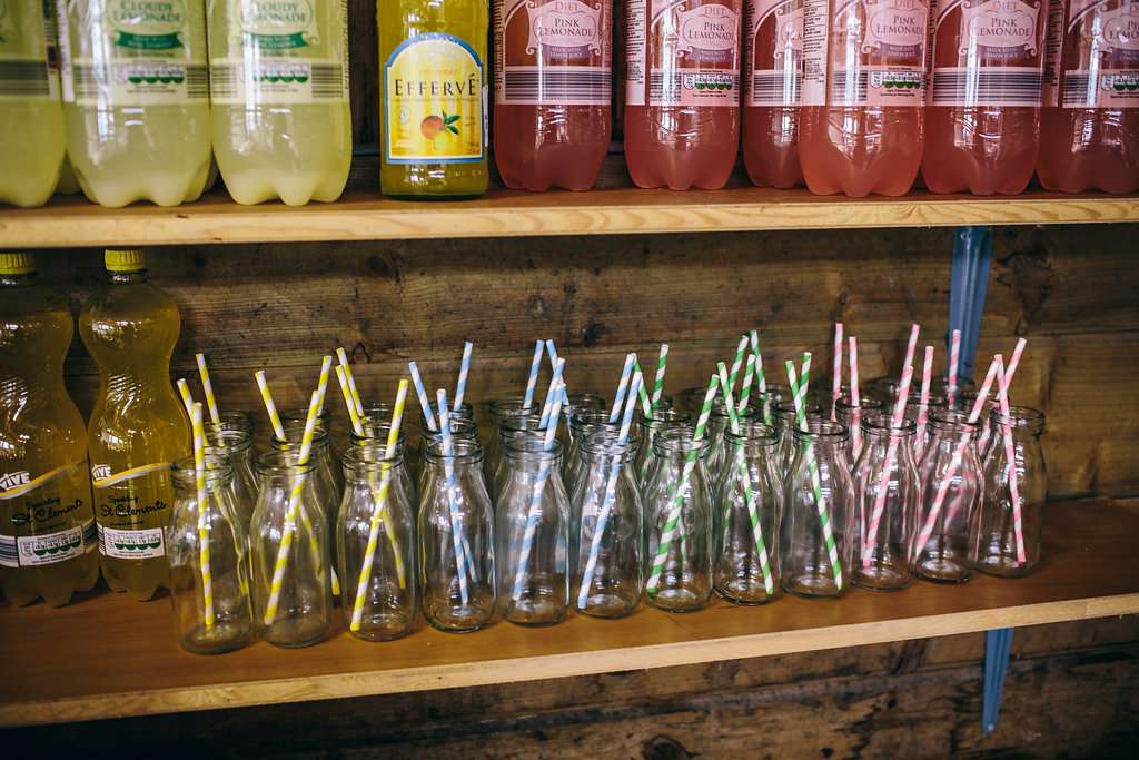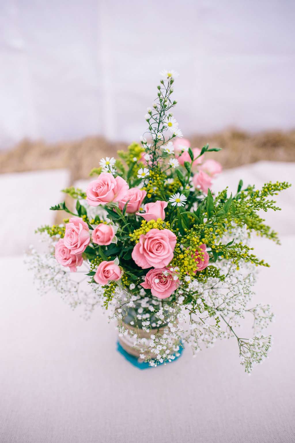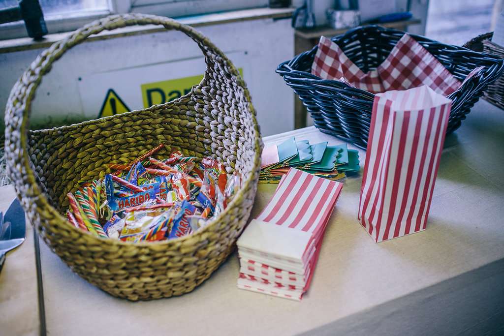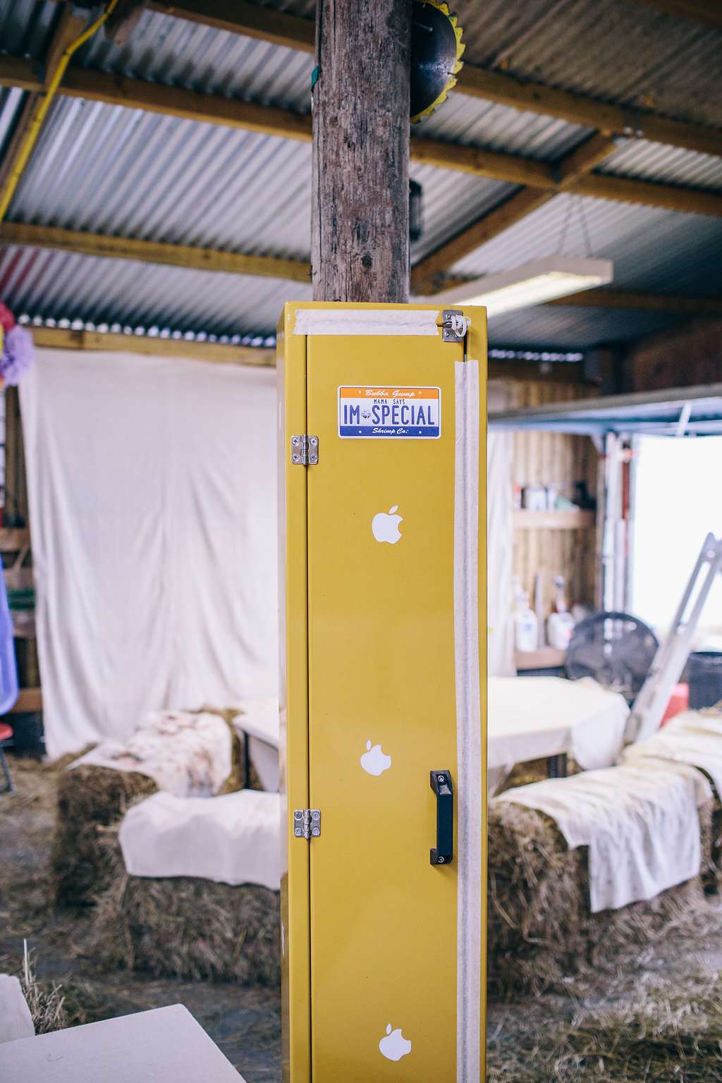 “Our guests bought homemade cakes for the desert table. We made pom poms over the course of many evenings with friends. The tables were old school tables sourced from eBay (which we sold afterwards!) and covered in dust sheets and chintzy bedspreads. We also had hay bales for seating and to create a bit of structure around the barn. We even grew our own hay in the land next to our barn.”