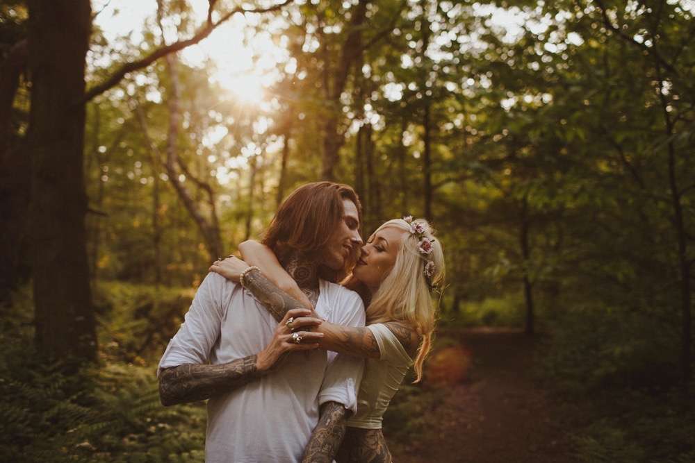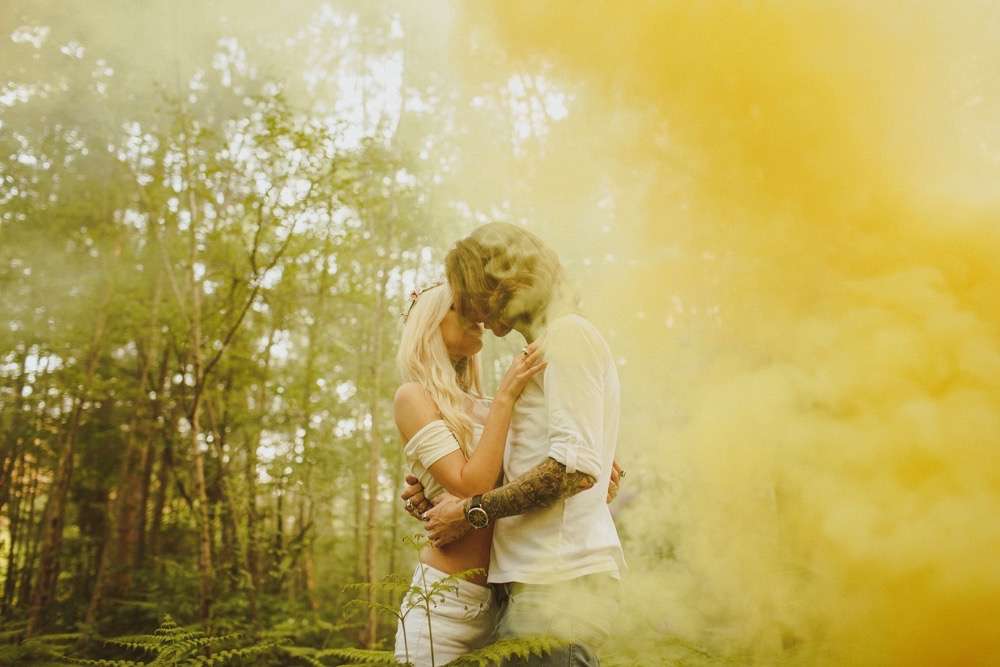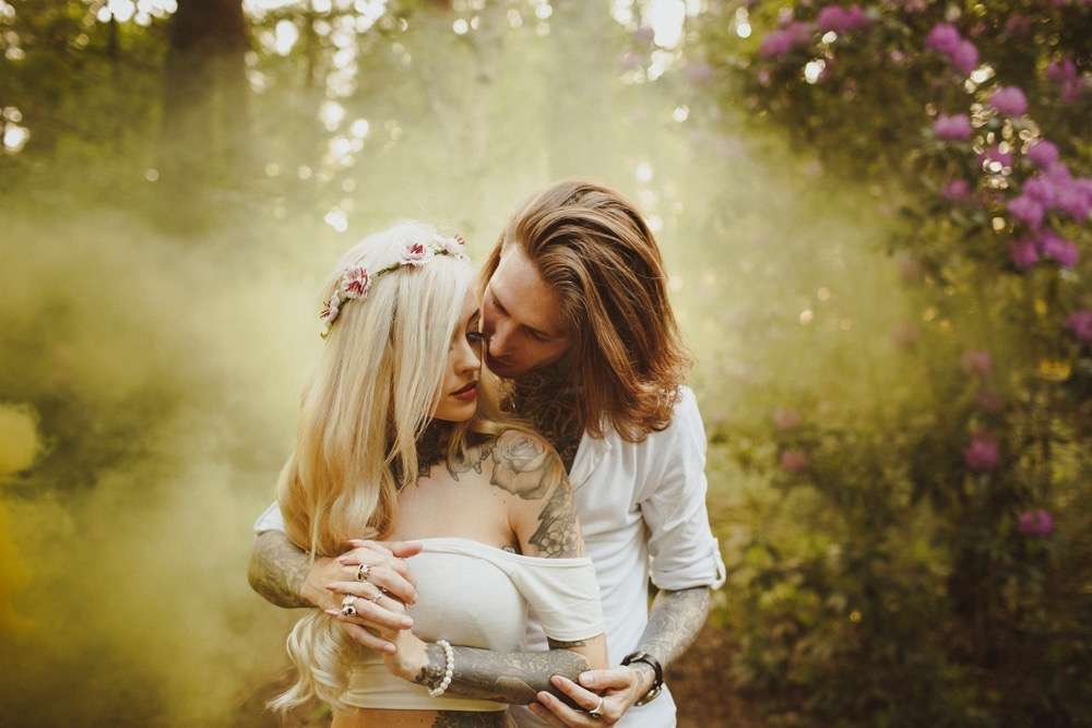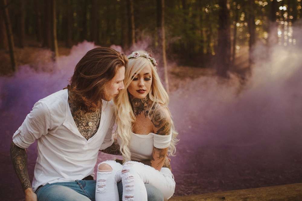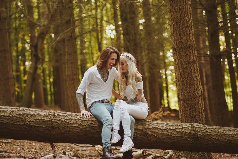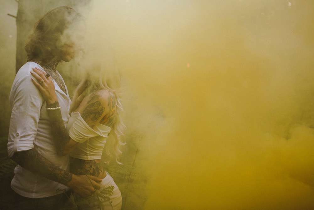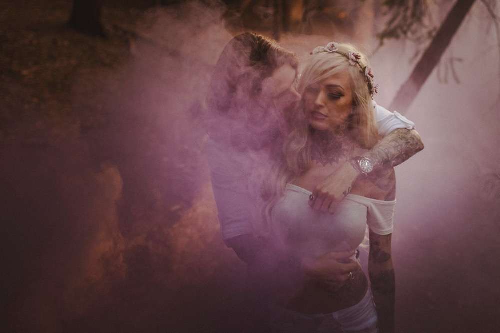 “Our engagement shoot took place at Oxshott Woods, Surrey”, said Jody. “It had a woodland fairytale theme. We wanted our photos to have a unique quality about them and to represent something classic but also with an edge (like us!) We wanted to add something that made the natural backdrop more magical with the coloured smokebombs.”