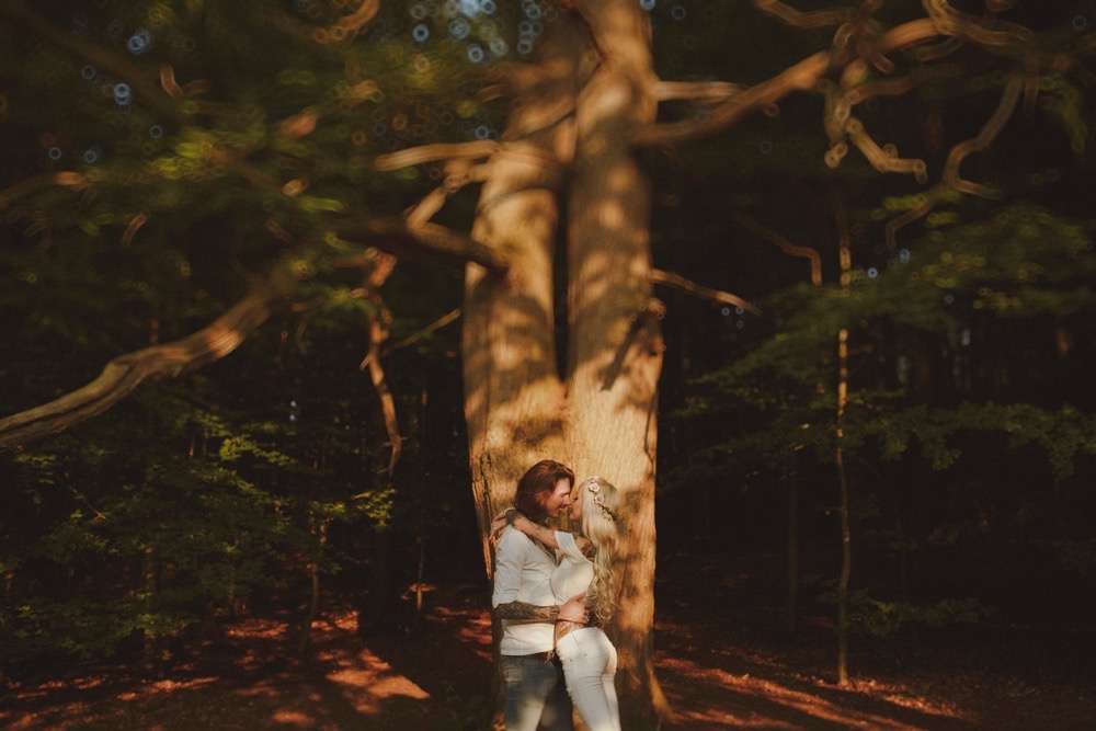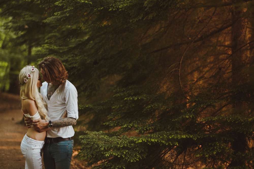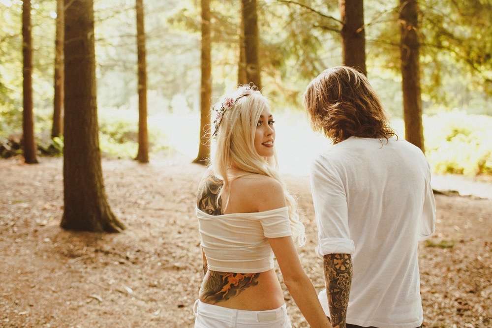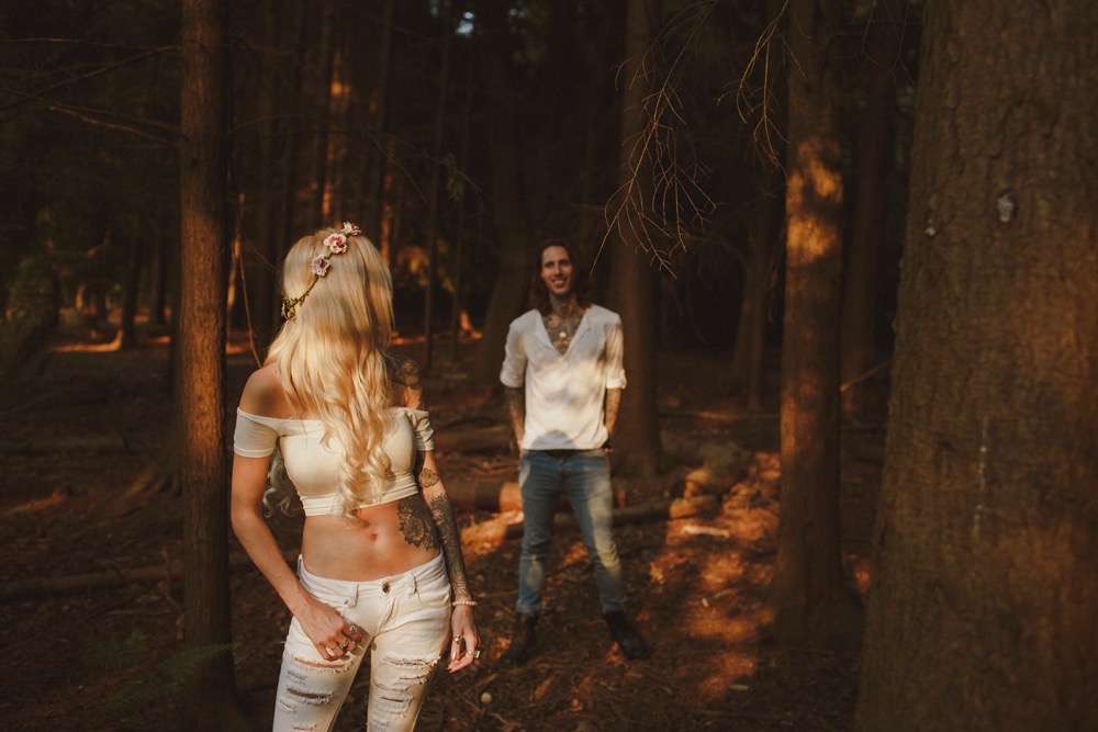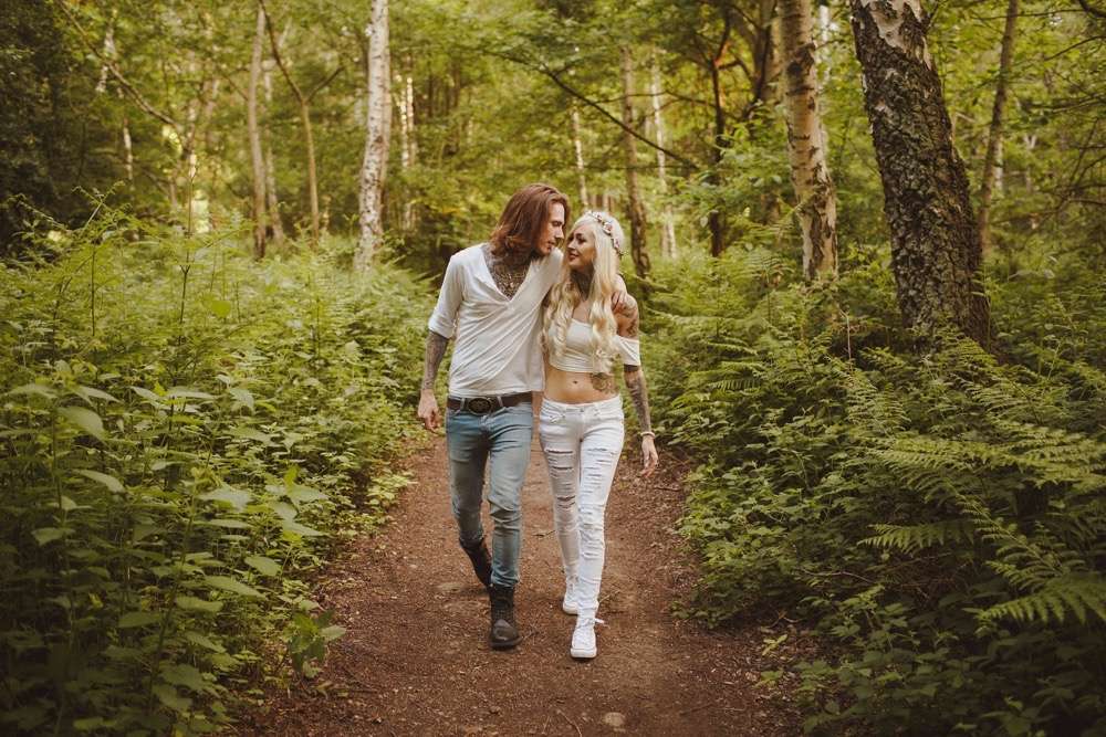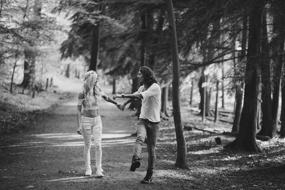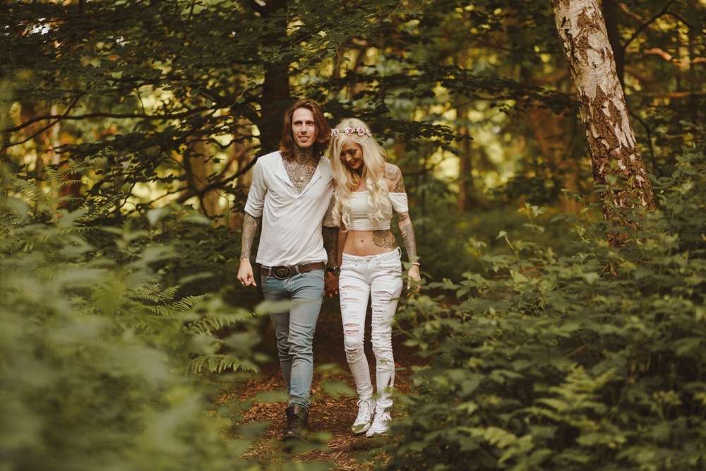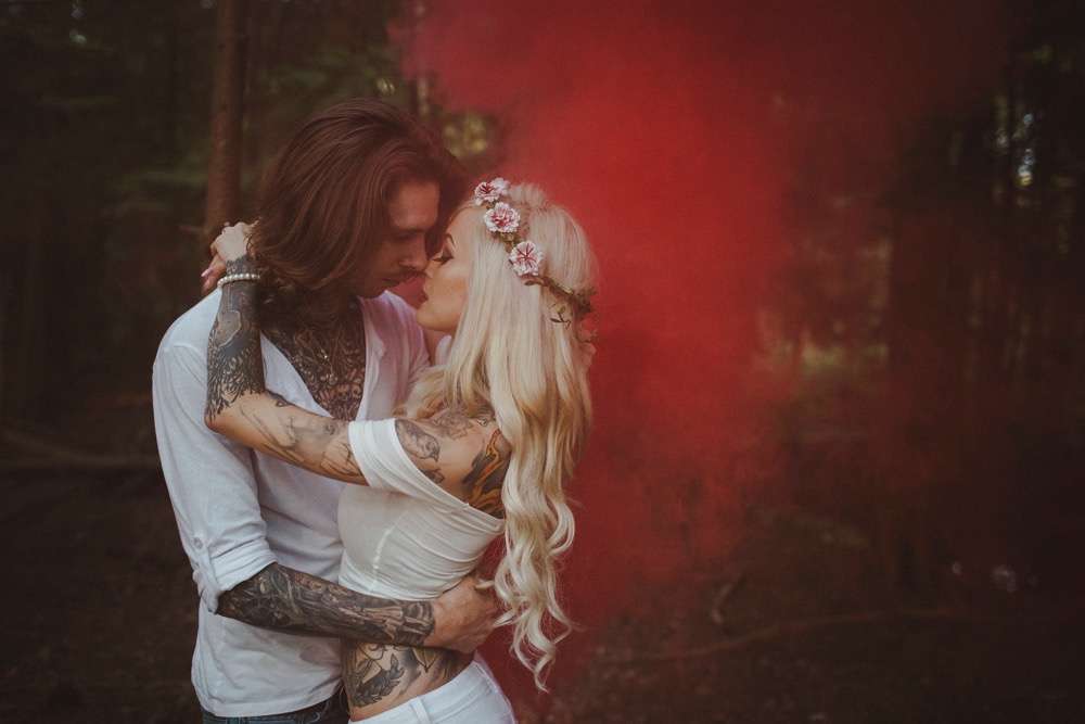 “Our engagement shoot took place at Oxshott Woods, Surrey”, said Jody. “It had a woodland fairytale theme. We wanted our photos to have a unique quality about them and to represent something classic but also with an edge (like us!) We wanted to add something that made the natural backdrop more magical with the coloured smokebombs.”