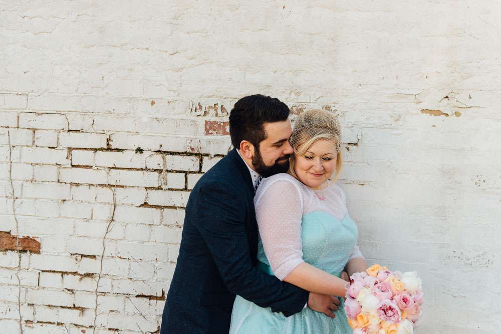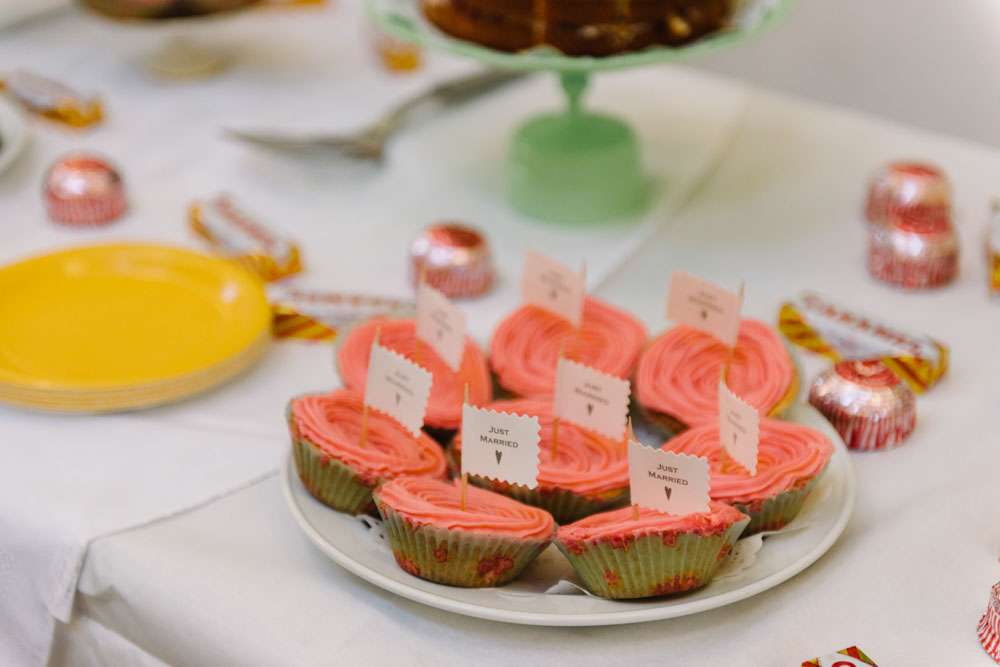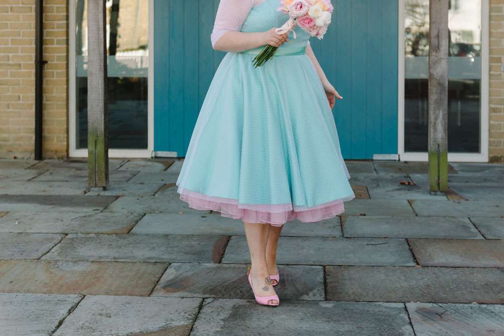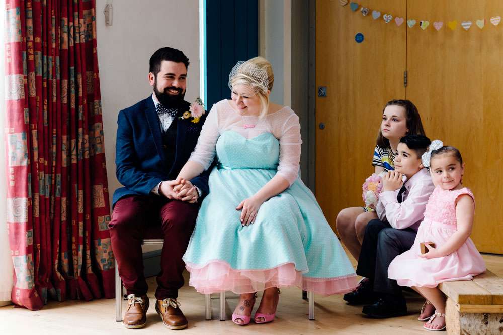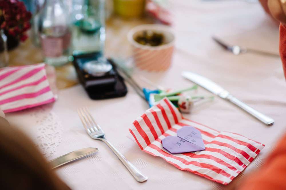 Fee and Steve’s fabulously colourful, budget friendly wedding took place at Hemingford Abbots Village Hall in Cambridgeshire. “We wanted a fun day that we were both involved in”, Fee explained. “We didn’t wait it to just be about the bride, but both of us equally. Lots of colour was involved, and guests were requested to leave office attire at home! We both wanted to have a day that was about us, so we ensured that we included as much about us as possible. Early on in the planning we trawled wedding blogs, but mainly just looked at Rock n Roll Bride as we found that is was the only blog that included low budget weddings, and weddings that encompassed different themes.”