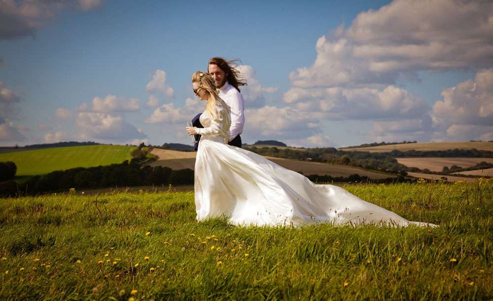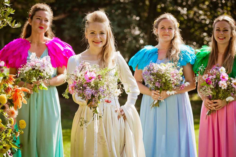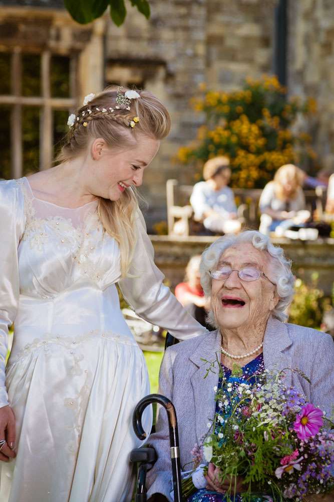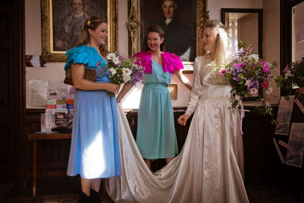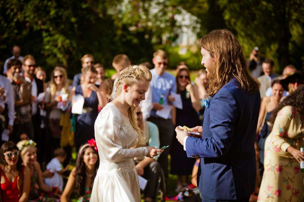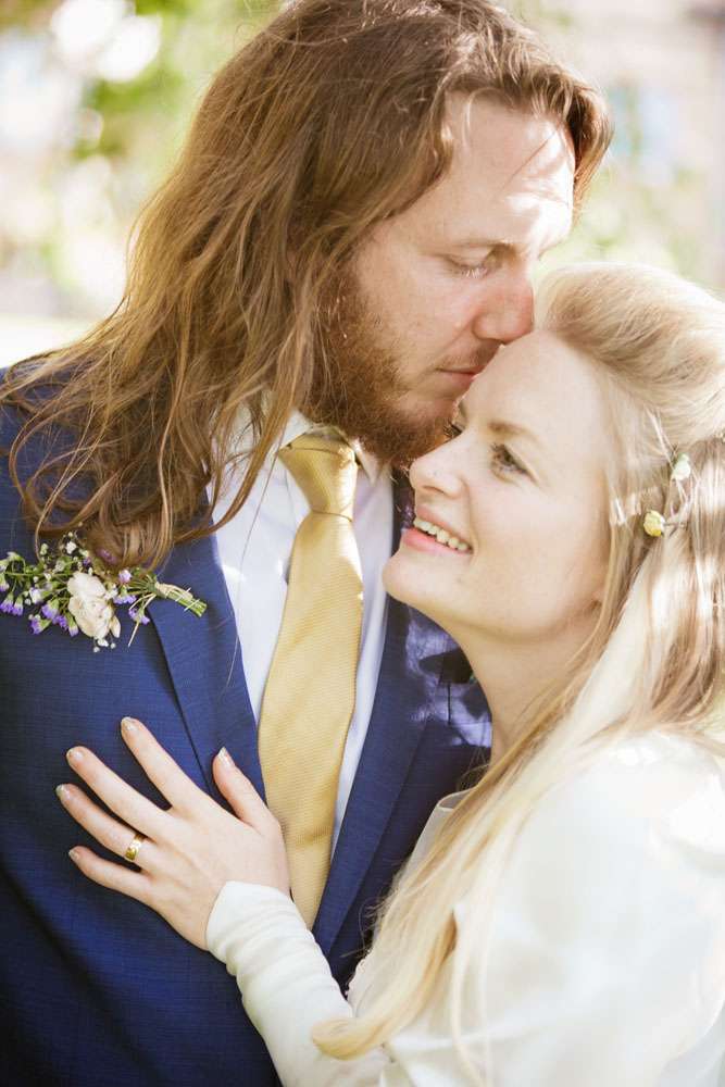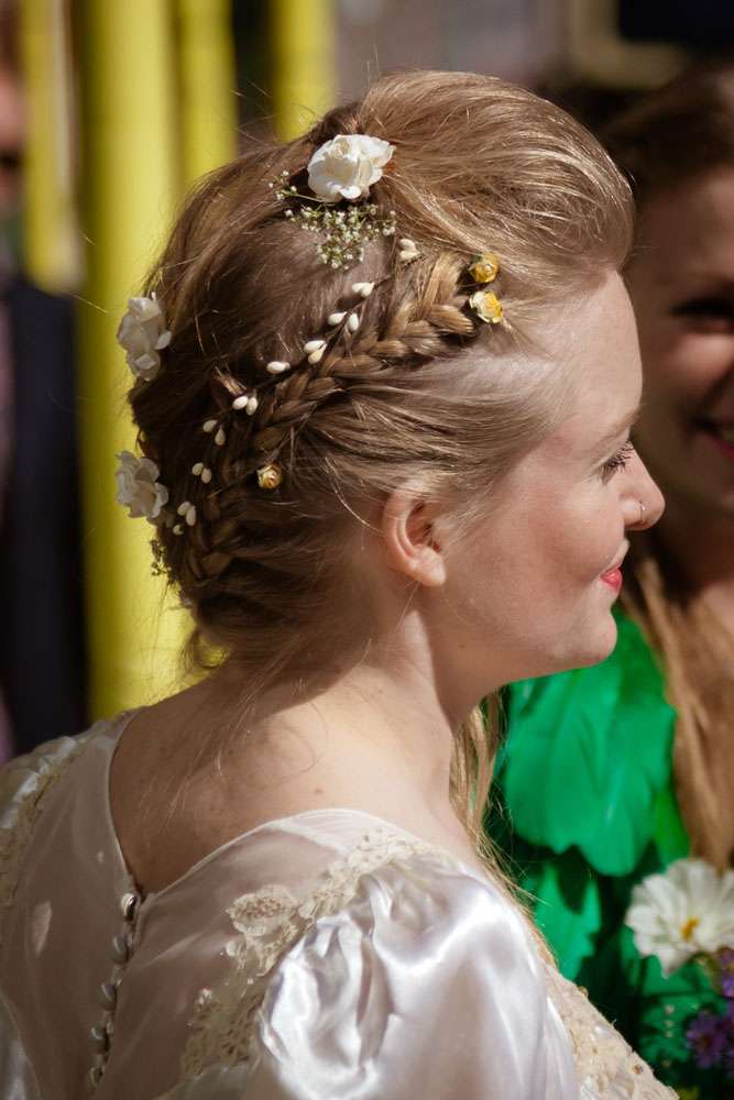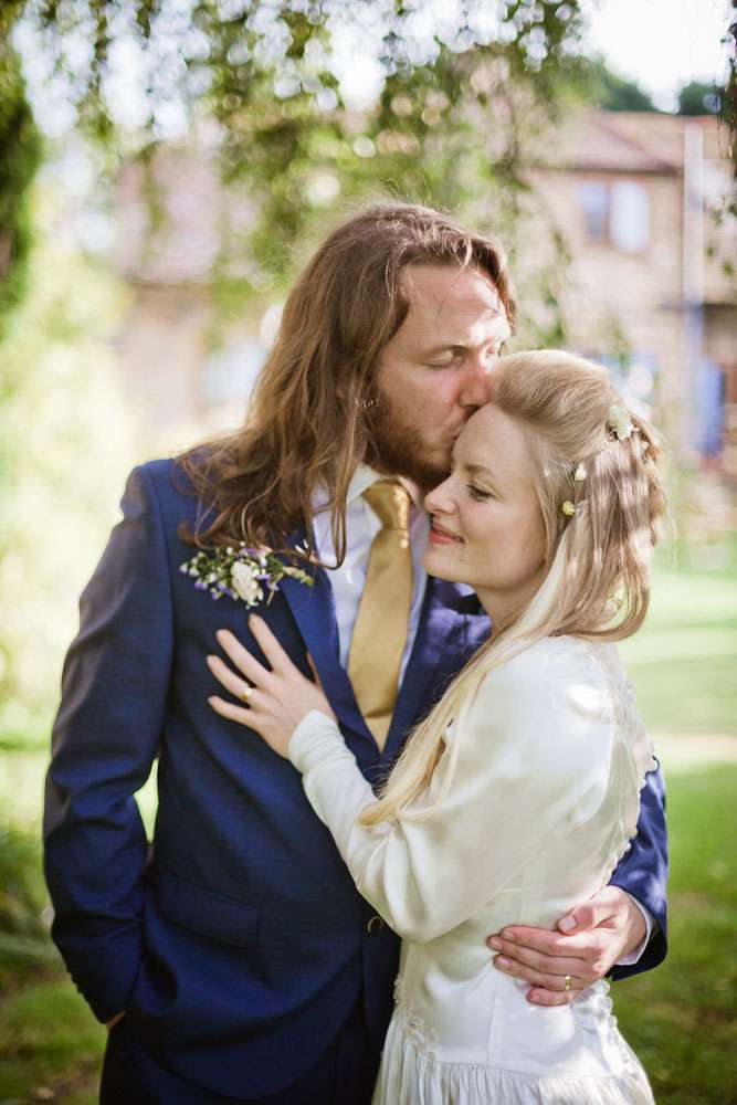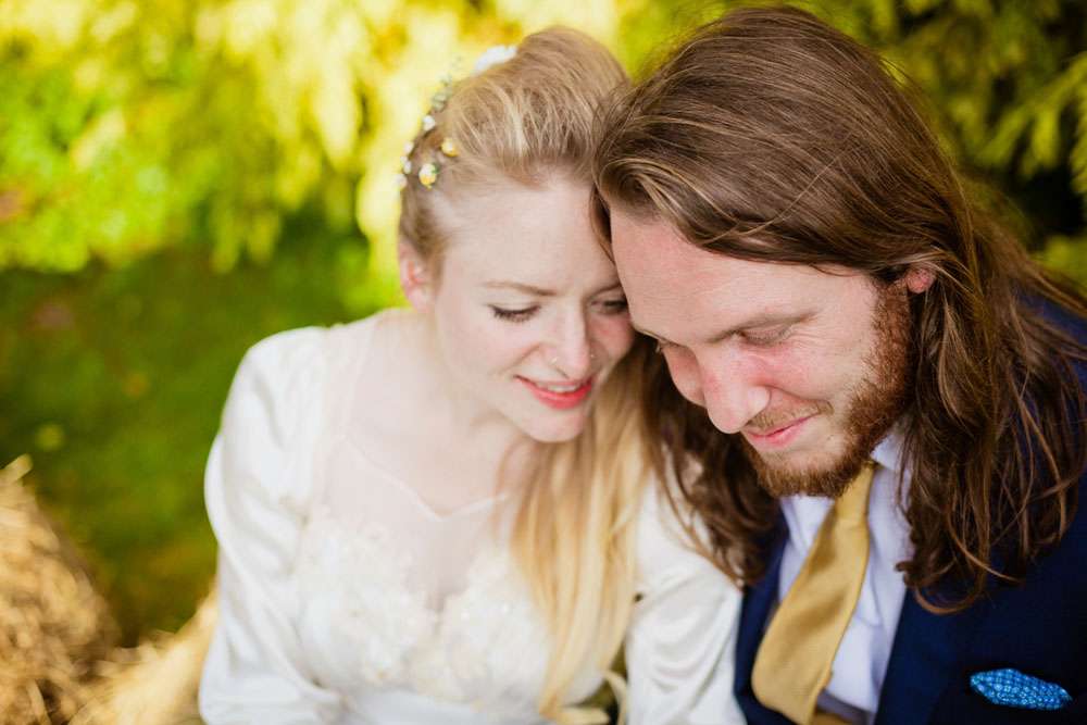 The bride wore a vintage dress that she bought at Secret Garden Party. “I found my dress a Lady Jane’s at Secret Garden Party. My mum was actually already halfway through mocking up my dress (I am a fourth generation seamstress and I had always thought she would make it) but when I tried on this dress I knew it was the one. It was exactly the same as the dress I’d drawn up for my mum to make! I thought I’ll just try it on for fun but it fitted so well and the ladies in the shop were almost crying! My bridesmaids were helping me run my shop next door and came running in, also crying! I knew it was the one. I went and stood out on the grass in front of our shops and people started to stop to congratulate me! One girl came up and held my face and didn’t say anything, just nodded her head at me, her boyfriend had to take her away (I think she was a bit squiffy – ha ha) So I sent my mum a picture and she messaged back in seconds saying ‘BUY IT!!’ I didn’t wait, I just went in and paid cash… it was a dream!”