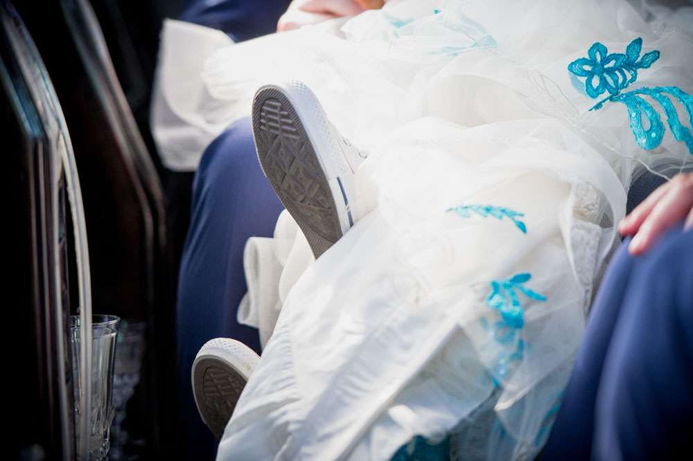 The bride wanted something unusual and colourful for her dress, which she initially found quite tricky in the UAE. “There’s not many places that cater for western wedding dresses – Dubai, maybeeeee, but not in Abu Dhabi. I did some serious research and bought quite a few dresses but after one that was very poorly made, another that I ordered online and when it showed up it wasn’t remotely like the picture, I eventually found out about the only boutique in Abu Dhabi. It was really hidden, on the mezzanine floor of a small building near a pizza joint. The staff were great and very excited! I tried on about 15 dresses and took photos of every one on me, but I instantly fell in love with this one. However, it was all white and I wanted some colour so I went to a material shop and got the perfect turquoise lace. The boutique offered to add it for me. It wasn’t cheap in the end but it was perfect!”
