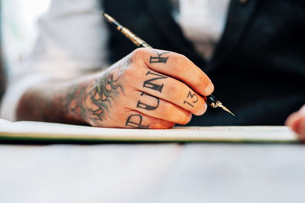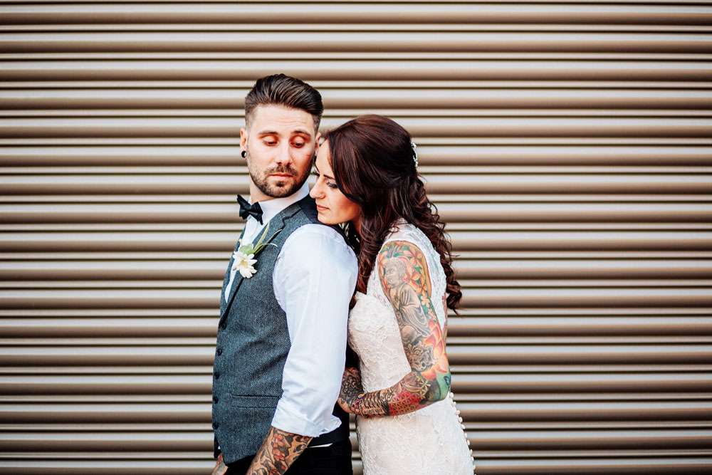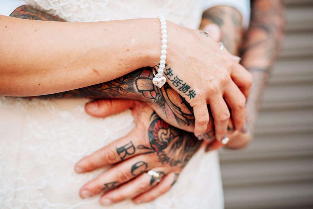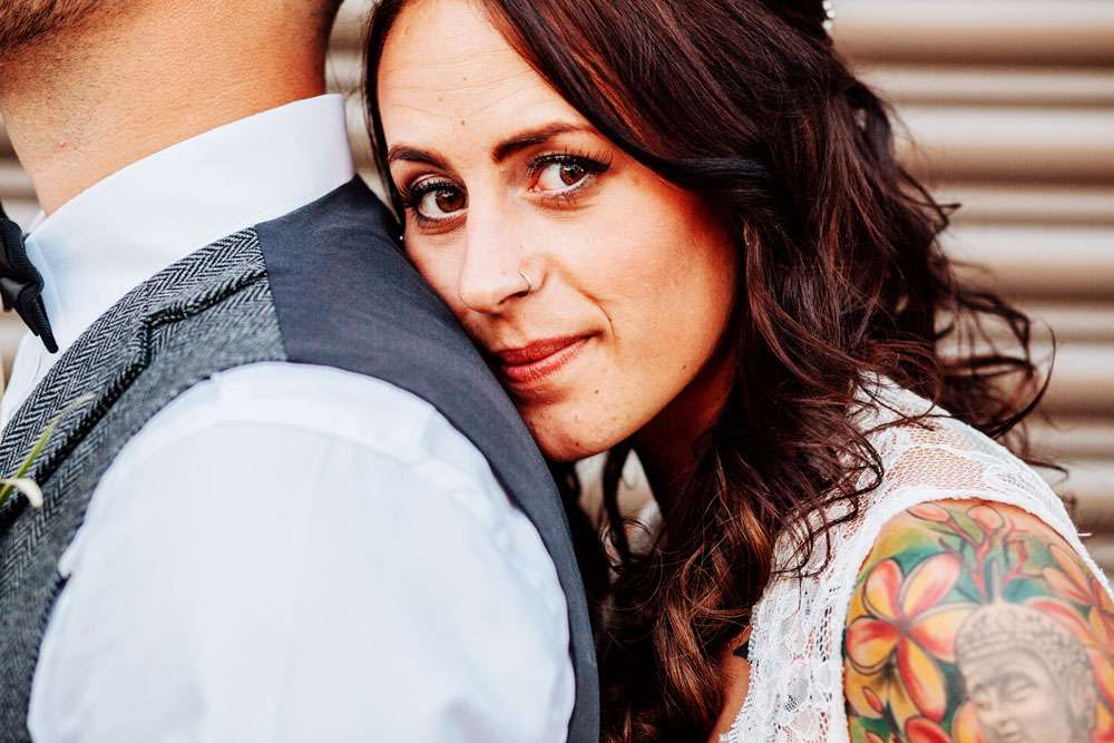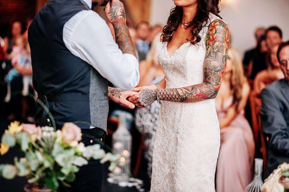 “We both wanted the wedding to be about our guests in a relaxed atmosphere but with a vintage theme (there was lots of browsing on Pinterest!)”, said the bride. “We wanted to express our personality throughout the day, which included little quirky props and all tattoos on show!”