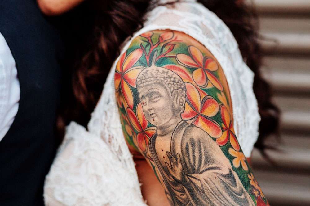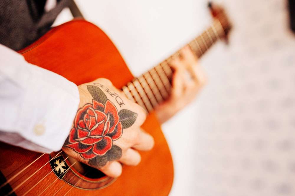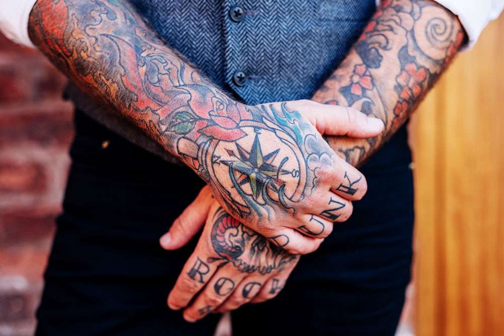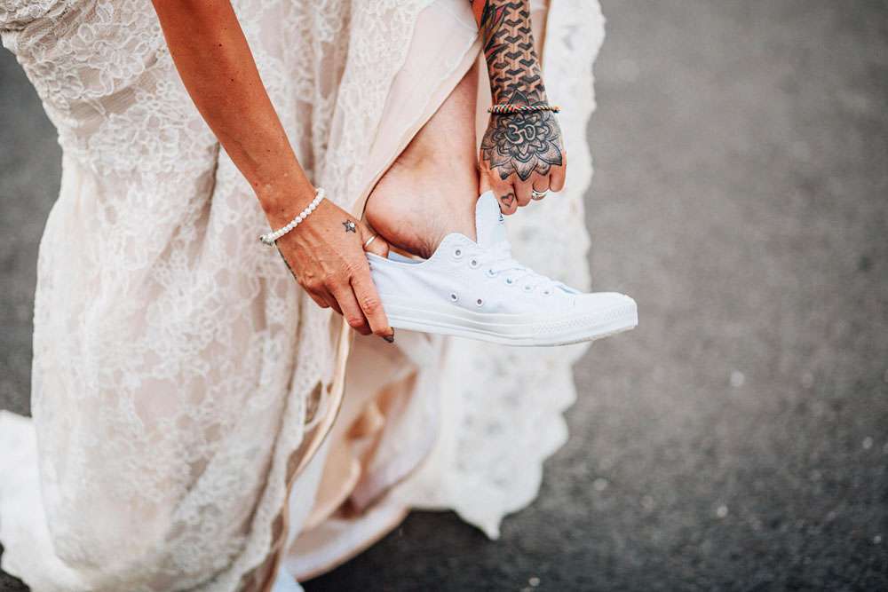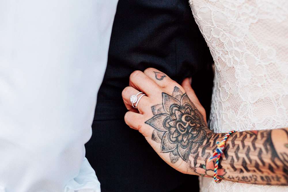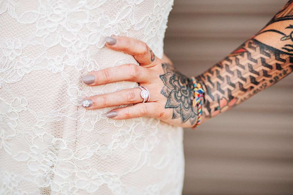“We both wanted the wedding to be about our guests in a relaxed atmosphere but with a vintage theme (there was lots of browsing on Pinterest!)”, said the bride. “We wanted to express our personality throughout the day, which included little quirky props and all tattoos on show!”