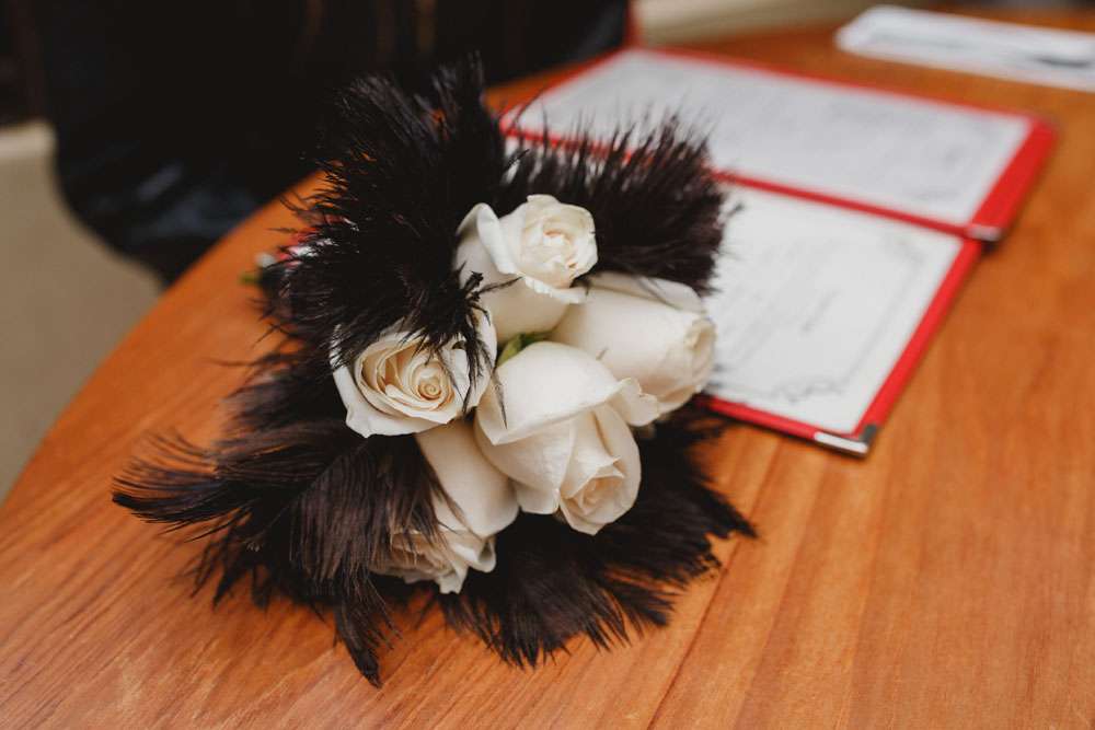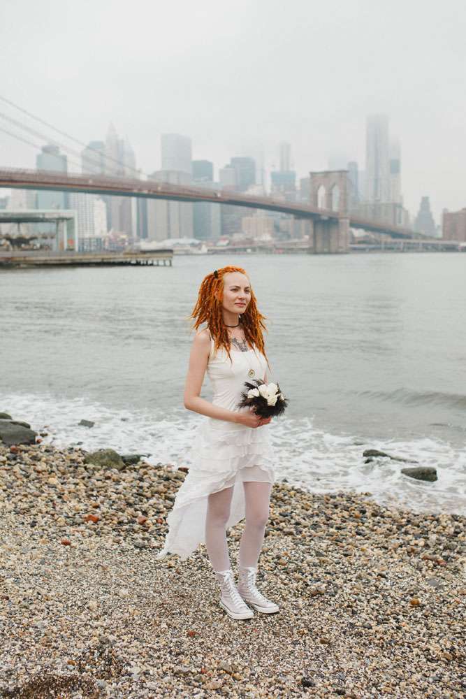 The bride designed her own dress with help from a fashion designer friend. “I designed the dress and a good friend of mine who is the owner of an underground and street-style store in Tel-Aviv, helped me with the final design and the sewing. I also made my own wedding bouquet. I wanted white flowers with black feathers. We thought that it will be easy to find someone who could make it when we arrived in New York but we couldn’t! The white flowers were easy but we couldn’t find anyone that could add the black feathers too. So we improvised. Ayal bought a feather duster from Kmart, took the feathers out and made the bouquet I wanted!”
