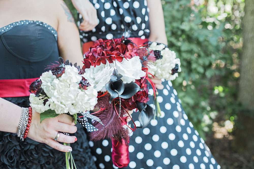 Sarah and Matt’s wedding had a 1950s vibe with both a retro rockabilly and new rocker twist. Their colours were red and black and the bride even wore a striking black gown! “We wanted to tie in our passion for music with a pin up and Rock n Roll theme”, said Sarah. “Matt also loves cars so the theme was perfect.”