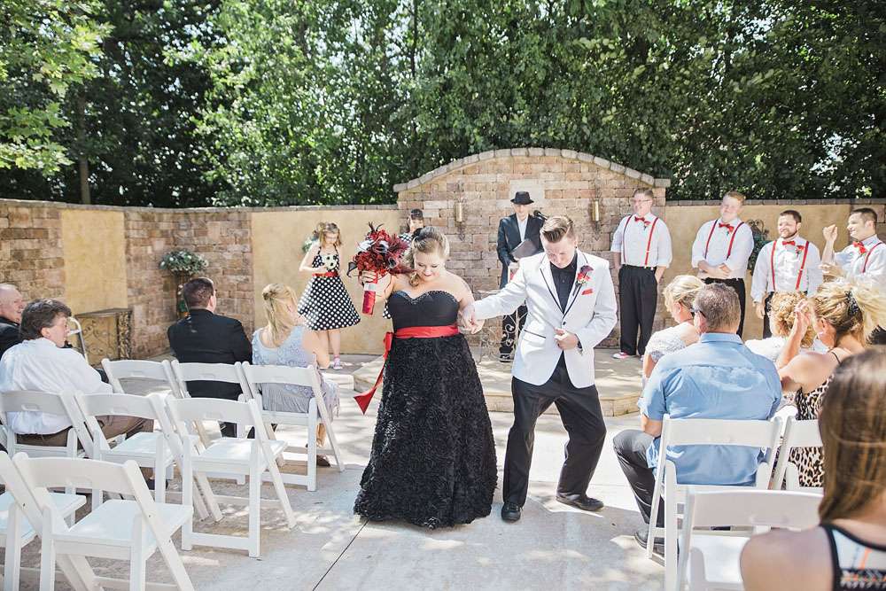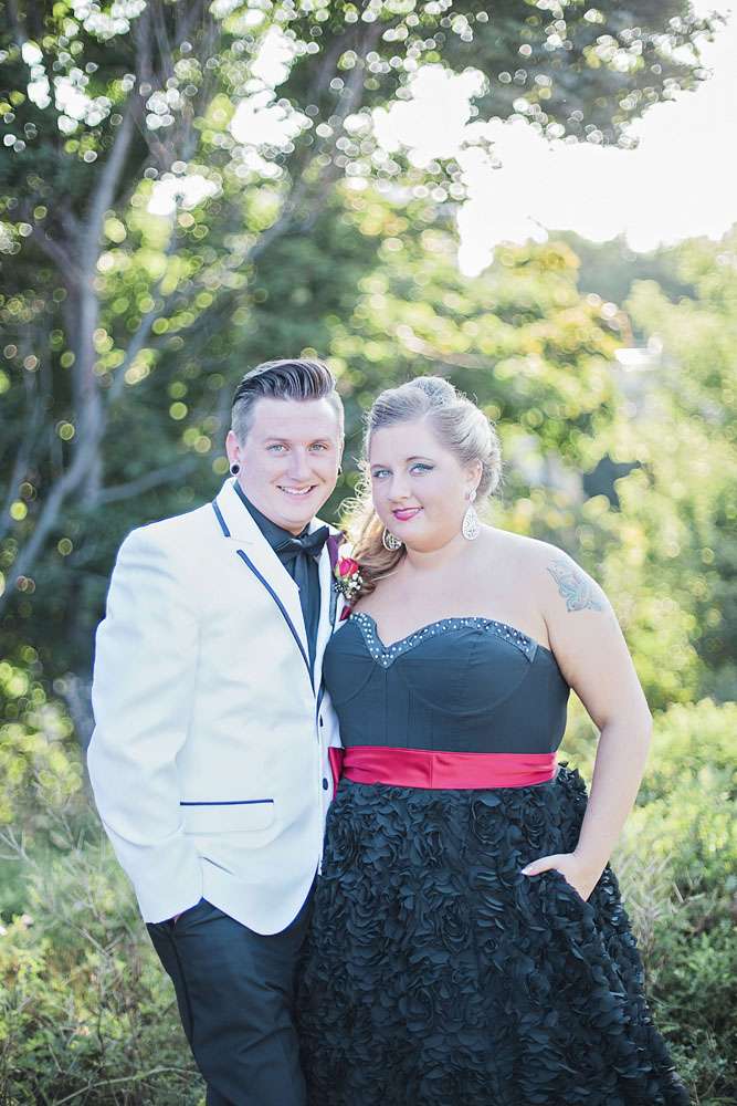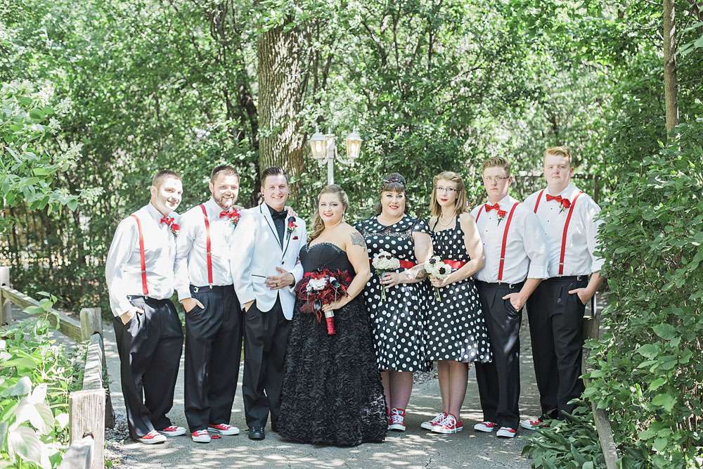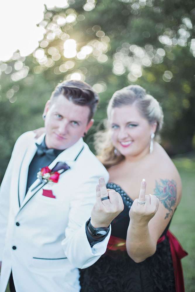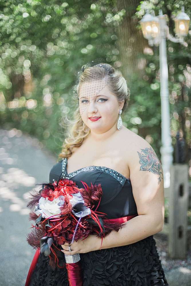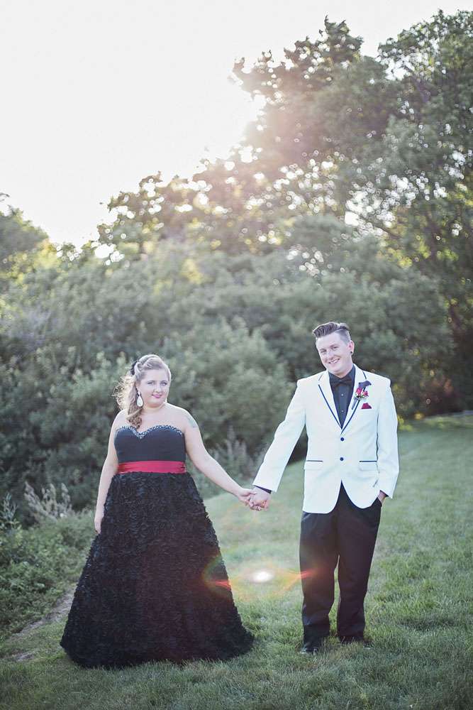 The bride’s dress was a prom dress from David’s Bridal. “Matt and I went and picked out my black dress together. We went together because my bridesmaids both lived out of state and couldn’t make the trip. I tried on many wedding dresses but they didn’t feel right, we both couldn’t see me in white. We decided that the black would signify ’til death do we part’ and give us that rocker vibe we both saw in our theme.”