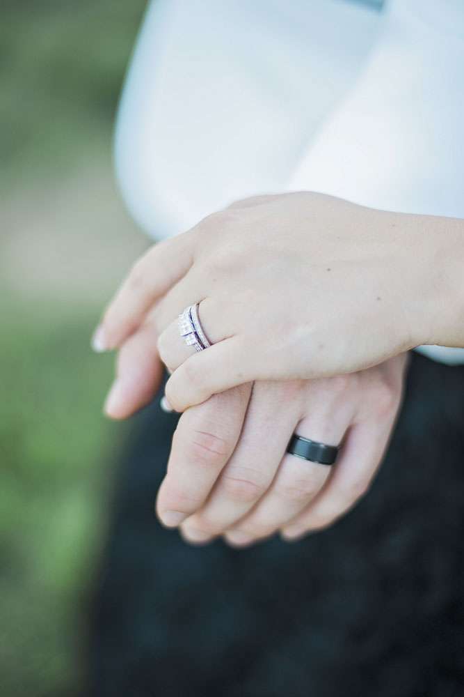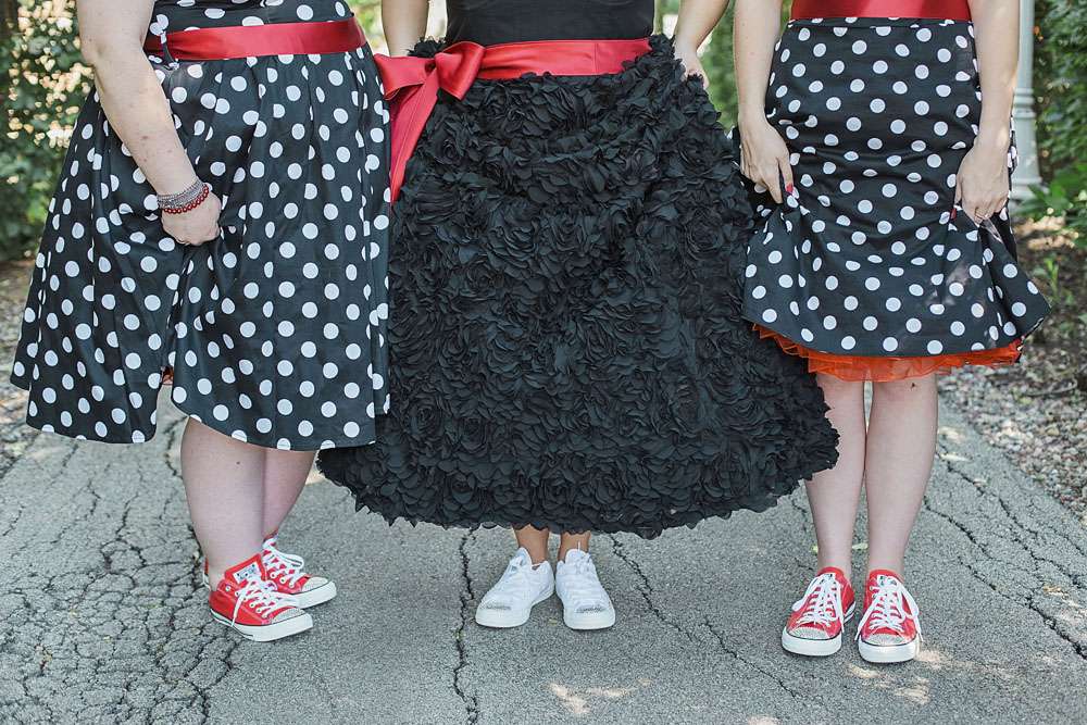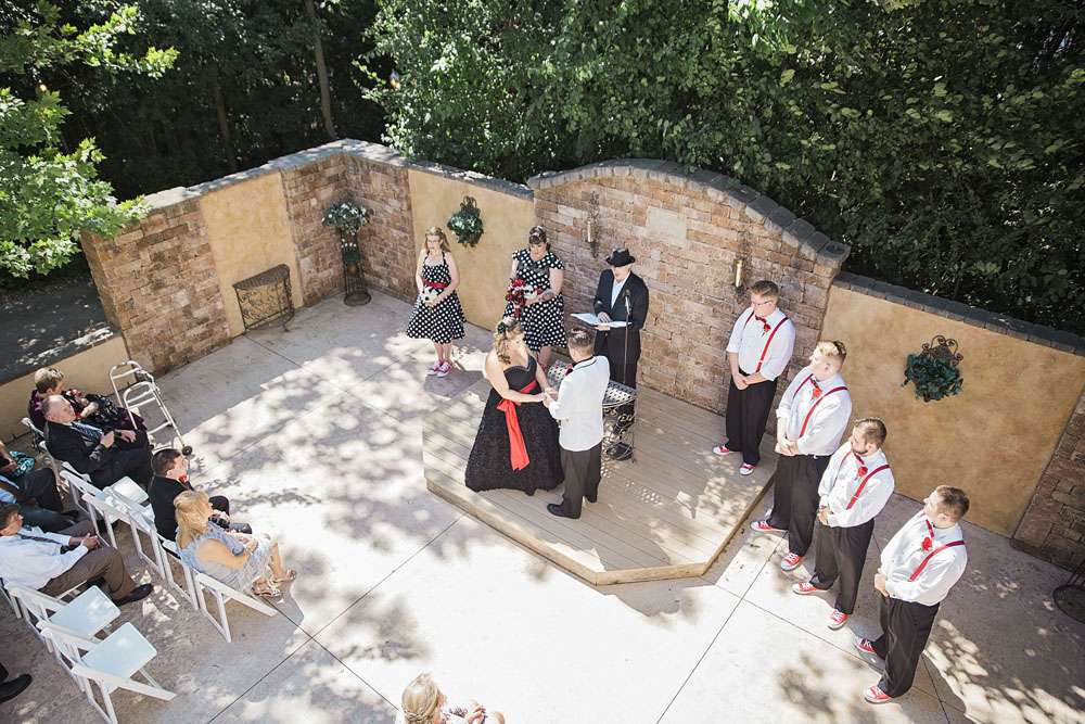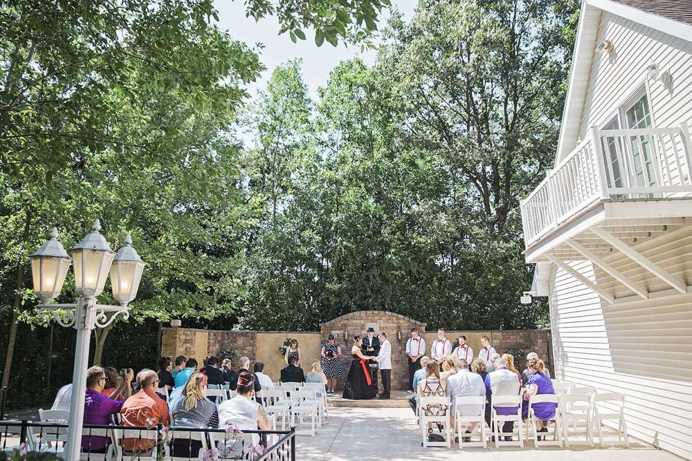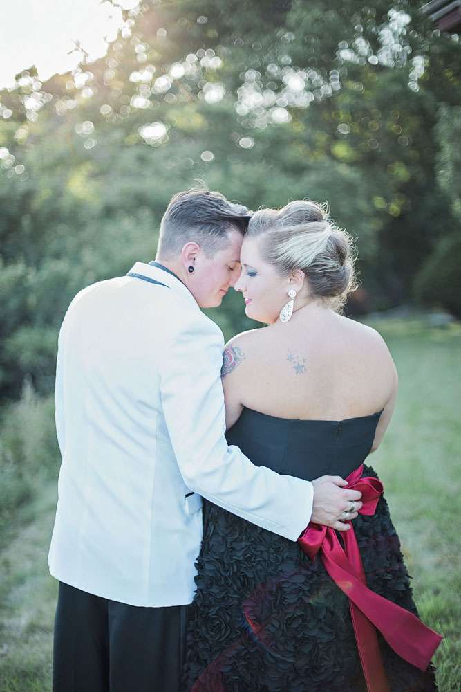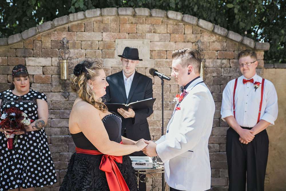 The bride’s dress was a prom dress from David’s Bridal. “Matt and I went and picked out my black dress together. We went together because my bridesmaids both lived out of state and couldn’t make the trip. I tried on many wedding dresses but they didn’t feel right, we both couldn’t see me in white. We decided that the black would signify ’til death do we part’ and give us that rocker vibe we both saw in our theme.”
