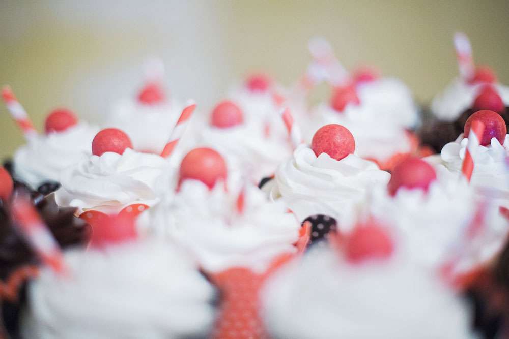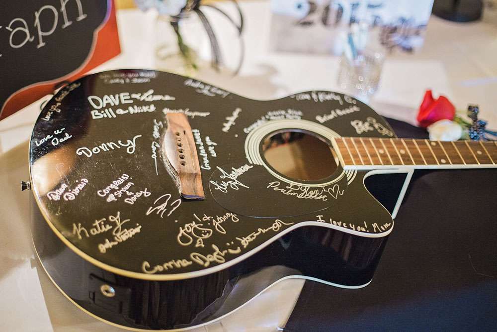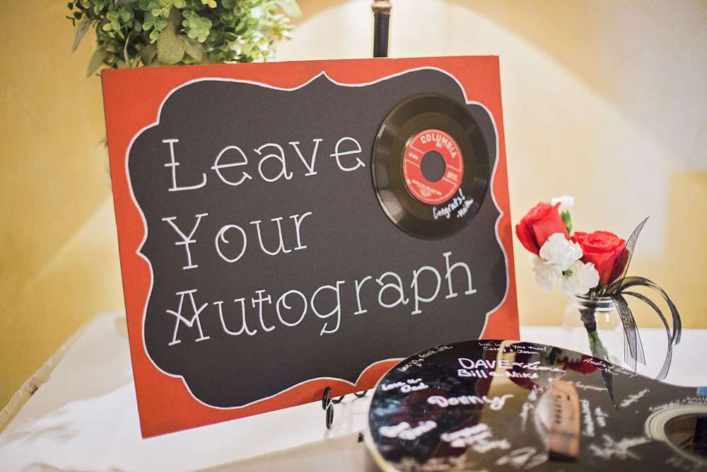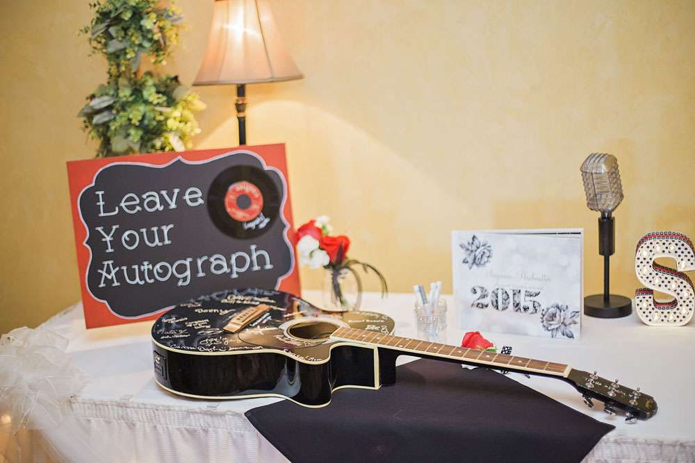 Most of the decor was DIY including the photo booth. “We used records for centrepieces and place mats. The flowers were red and black roses with paper roses made from music note paper. We also made our signs, I made the bridal bouquet, and we had a black Fender acoustic guitar as our guestbook. I thought people would have been more surprised but they all just really enjoyed the details we added. Another different idea we had was to go with cupcakes infused with cheesecake to look like milkshakes, those went over fantastically.”