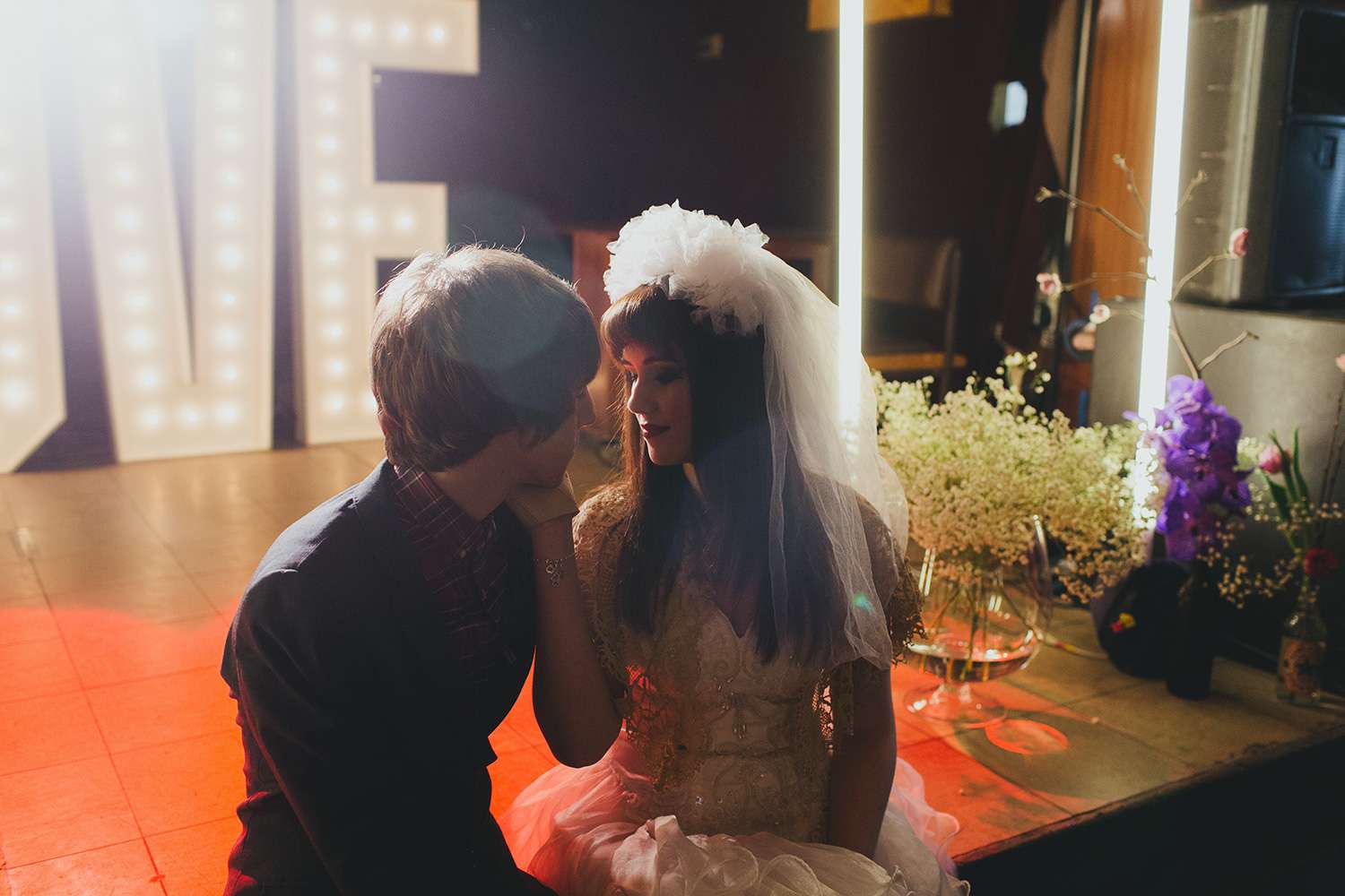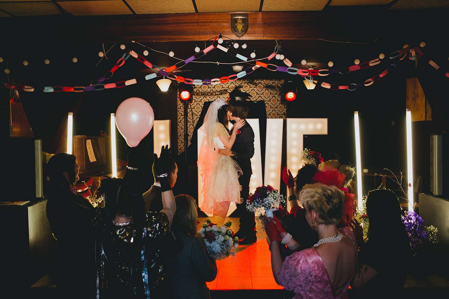 The venue, Earl Haig Hall, was a real working men’s club. “Our photographer, Dale Weeks, approached the styled shoot as if it was real a wedding in a working men’s club in the 80s with lots of flash and candid moments. The finished images all have a retro sheen and faded look to help transport us back 30 years. For the video Wagtail Productions stayed away smooth, tracking shots, instead and using lots of free handheld movement to reflect the casual and relaxed atmosphere.”