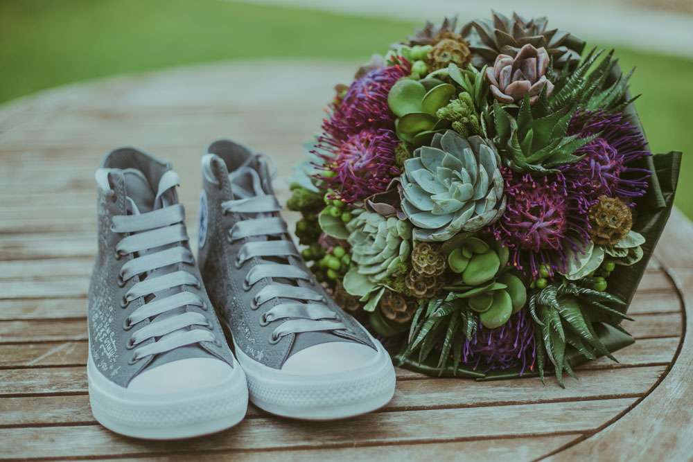 “Our favourite colour purple was the easy choice for the colour theme. We also included skulls as centrepieces because we love them, and succulents everywhere because I collect them.”