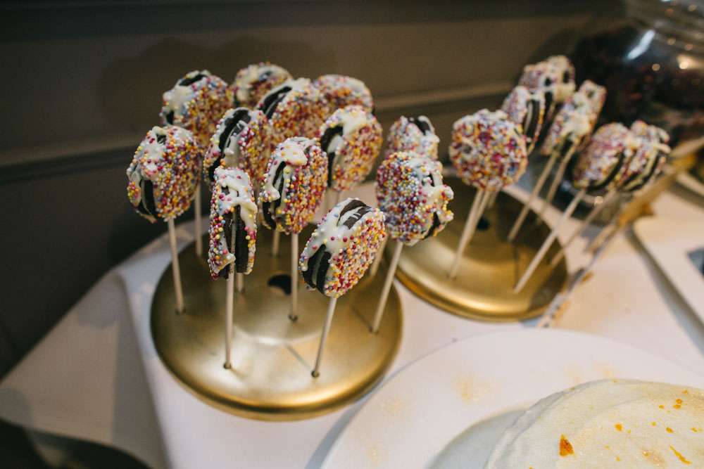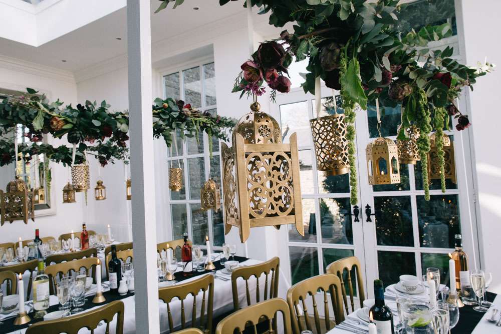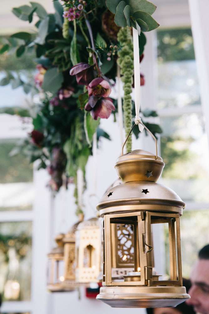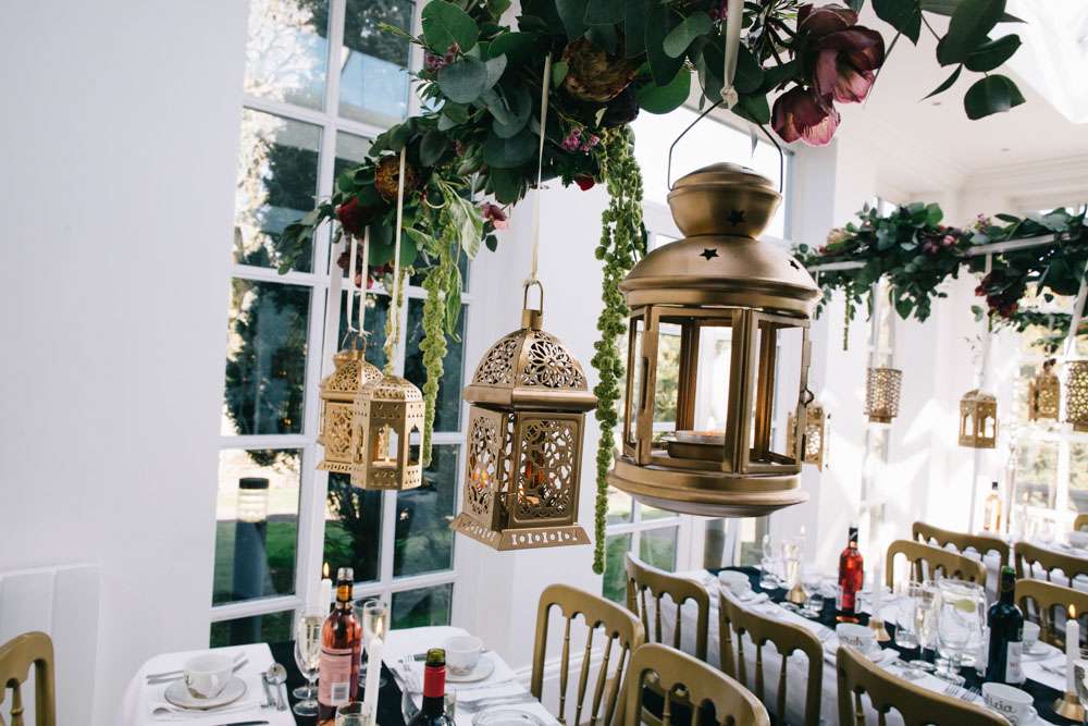 The reception continued the dark floral theme. “Most of the wedding had some sort of DIY element”, she continued. “Gold spray paint became my best friend! We collected lanterns for two years and various candle holders and odds and ends. I also spent months making the wedding favours: gold and white personalised teacups and saucers that doubled as name cards for guests. We also made the embroidery hoop drapery at the entrance and the giant seating plan. If a dessert table counts as well then that too: each of my bridesmaids made a cake and one of them, Stacey, made 21 different recipes in the week before!”