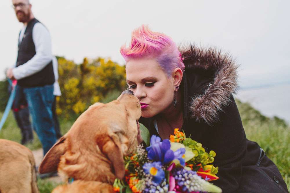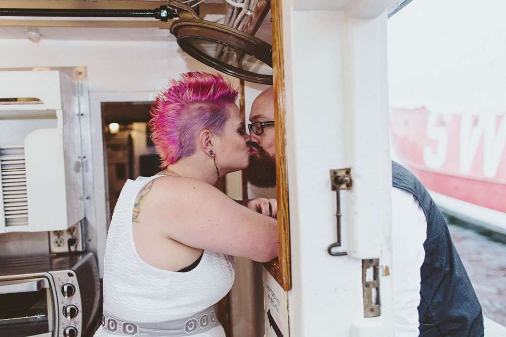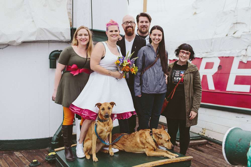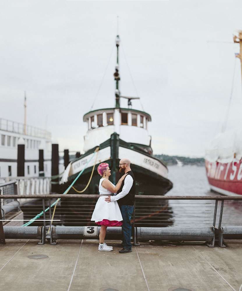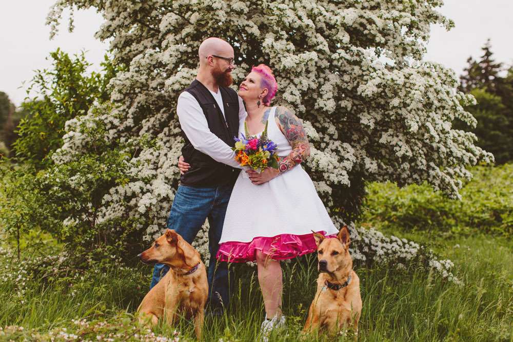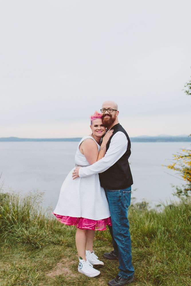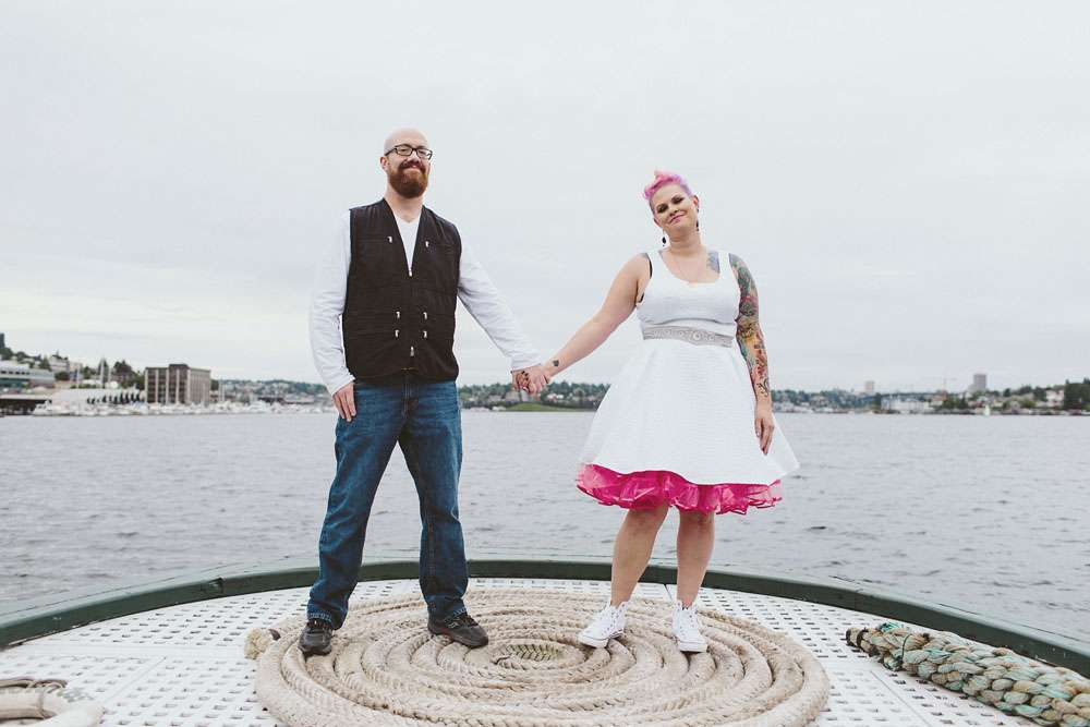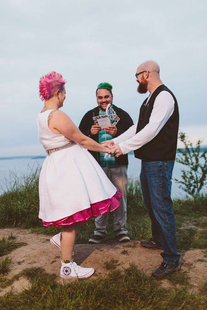 “We were married at sunset on a cliff overlooking Elliot Bay and the Olympic Mountains on the Puget Sound in Washington ,” said the bride. “It was beautiful! Ryan, the officiant, is one of my closest friends. When we asked him to get ordained and wed us, we only had one request – to start it like the clergy in the classic movie The Princess Bride. He did one better and performed the entire ceremony from the movie. He nailed it! We wrote our own vows and just had fun with it.”