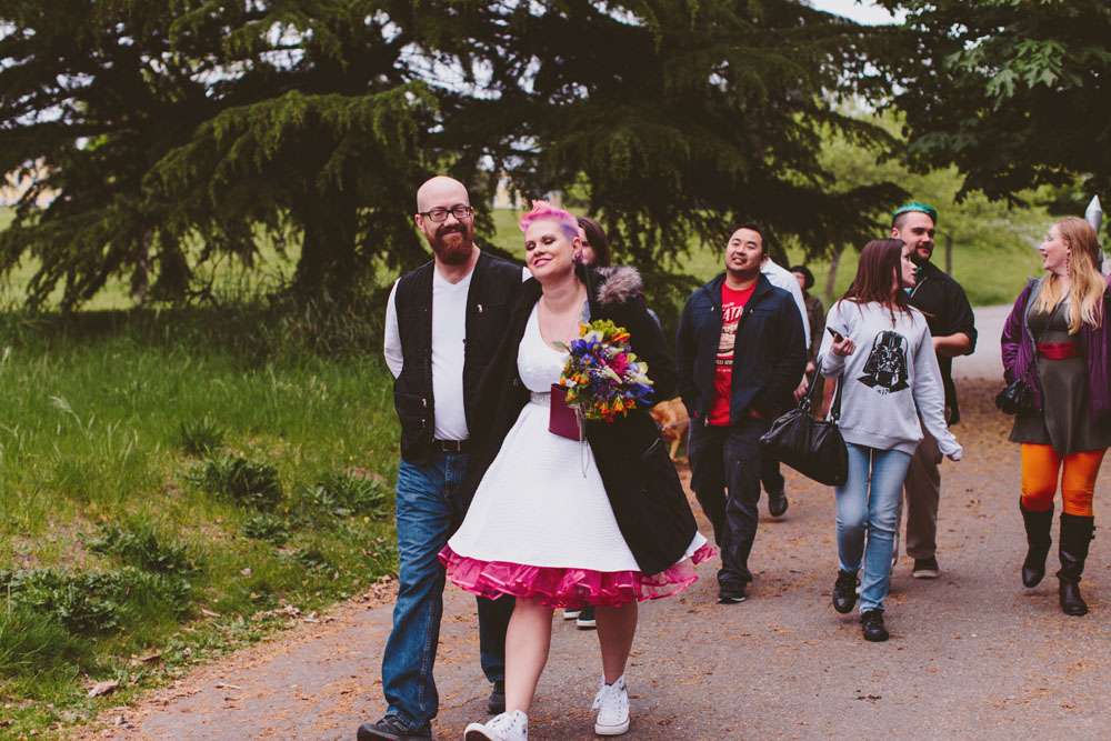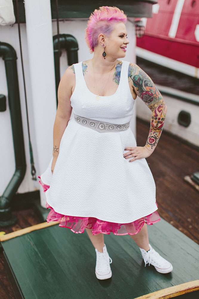 “We only had about a month or so to plan this, we did as much DIY as we could. My bouquet was purchased from the flower market, my best friend made the amazing and delicious Star Wars cake, Tiffany who did my hair was a friend of mine. We wanted to spend as little as possible. We bargain shopped and I lucked out on my dress which was on super clearance!”