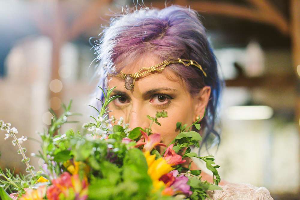 The bride wore a dress made for her by her grandmother. “I chose everything for my dress”, she explained”, I bought the fabric, dyed it with my grandma and helped her sew it.”