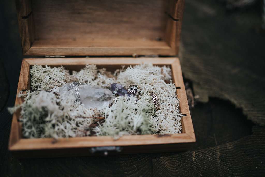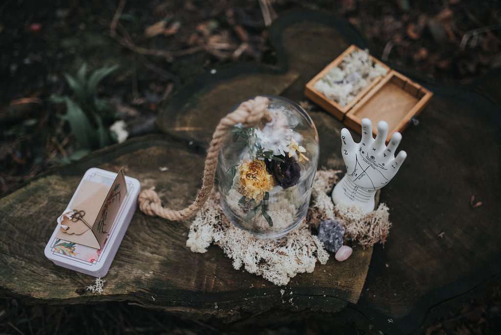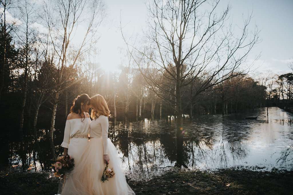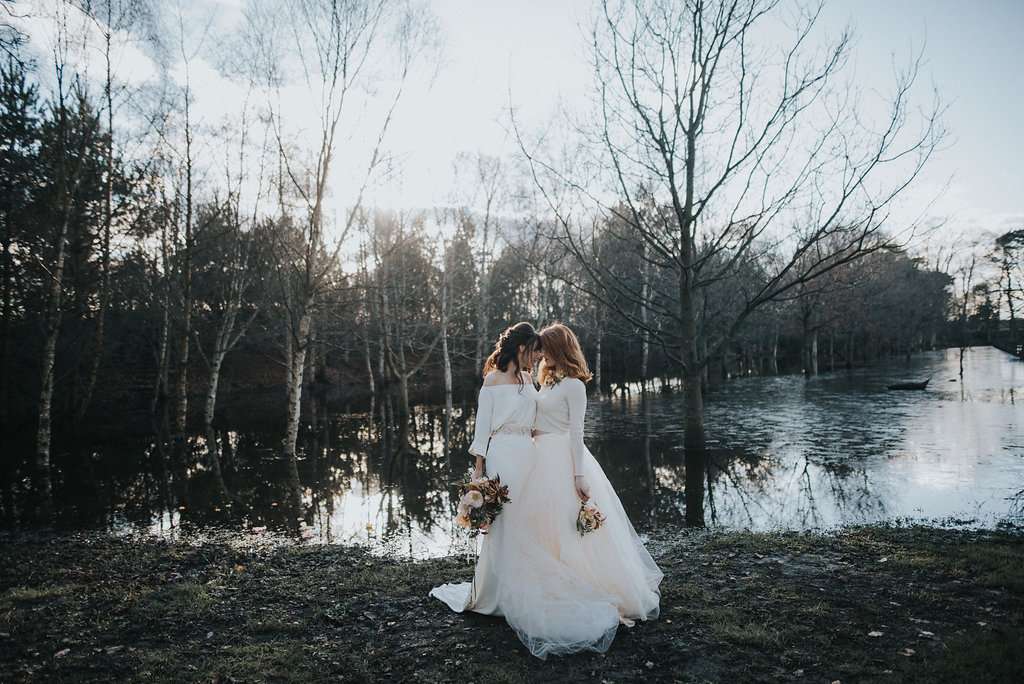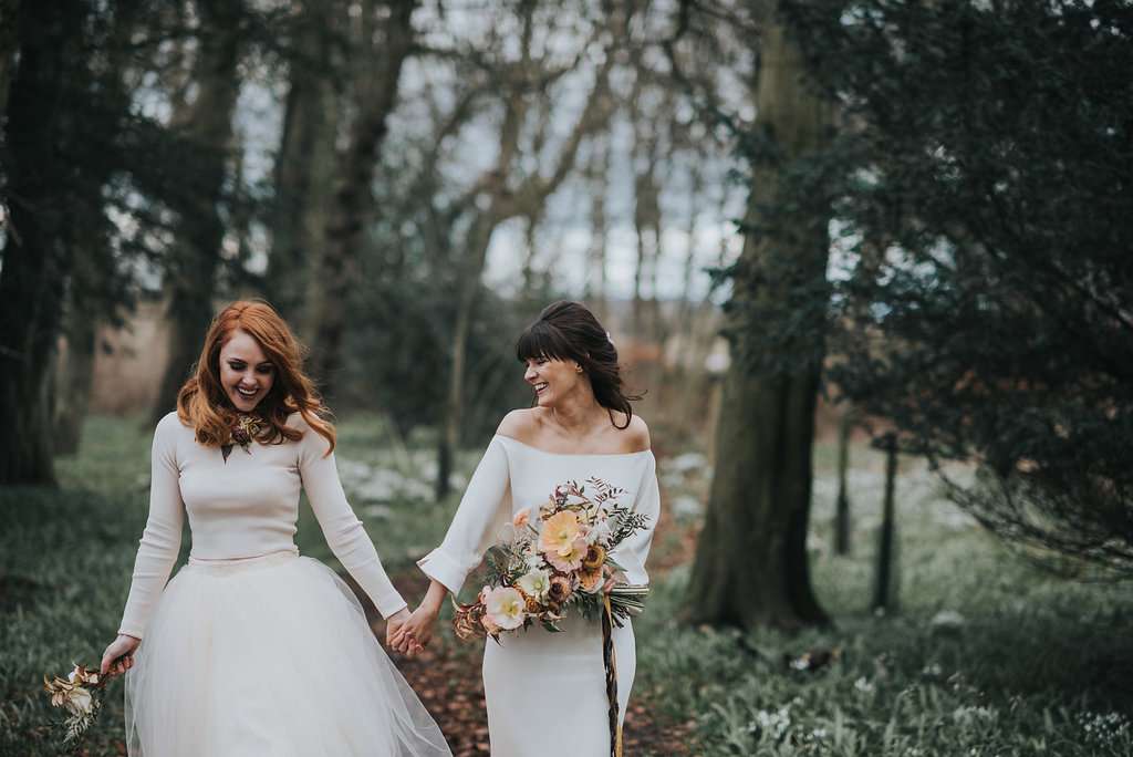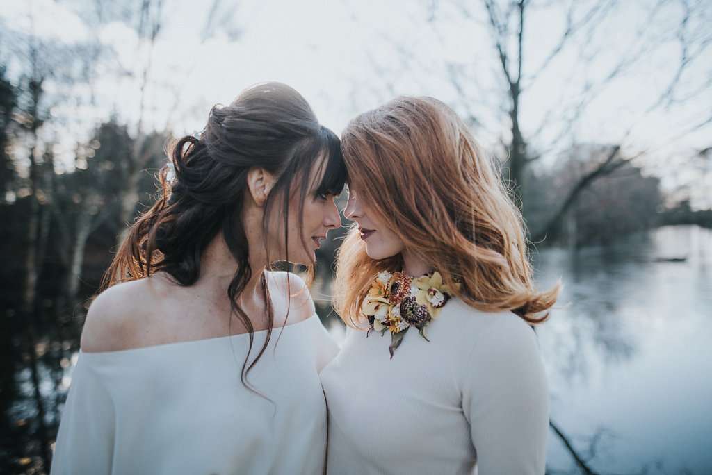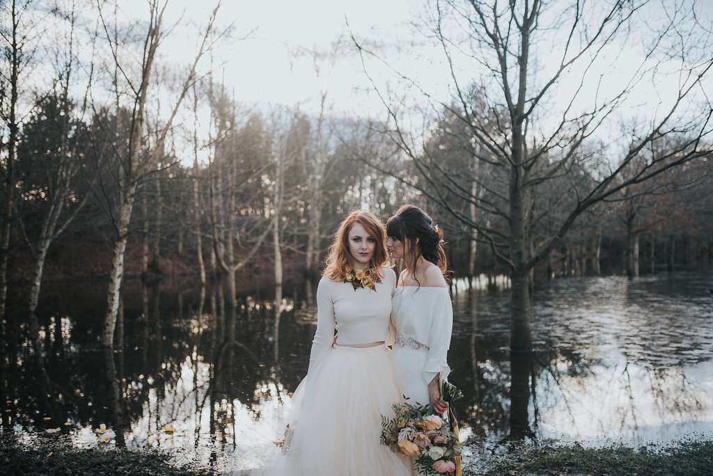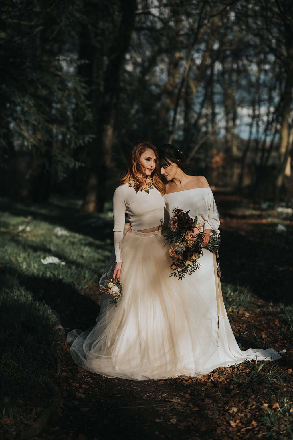 “We wanted to tell the story about two beautiful young brides who have run off to marry one another in their dream woodland setting. We picked two brides instead of a bride and groom as our models because we wanted one to be styled a bit more traditionally (our elegant, bouquet carrying brunette) alongside her edgier partner (our fiery, fierce red head). We felt there have been plenty of styled shoots depicting two ‘brides’ but not really any that focused on the real deal – two gorgeous girls, in love and actually marrying one another.”