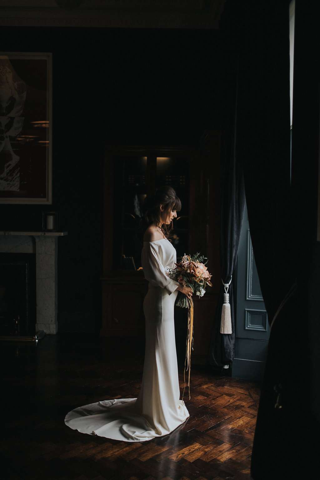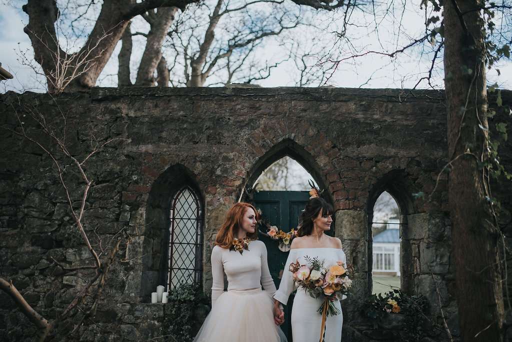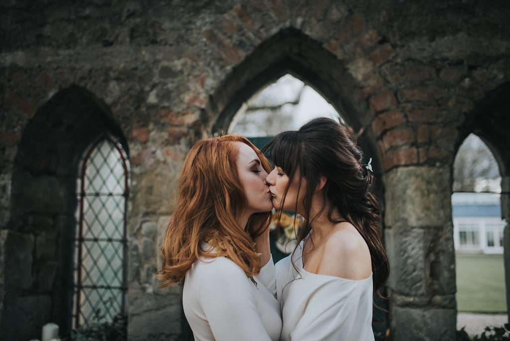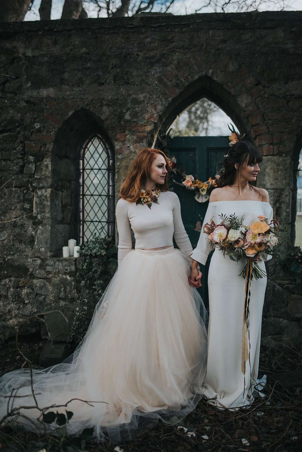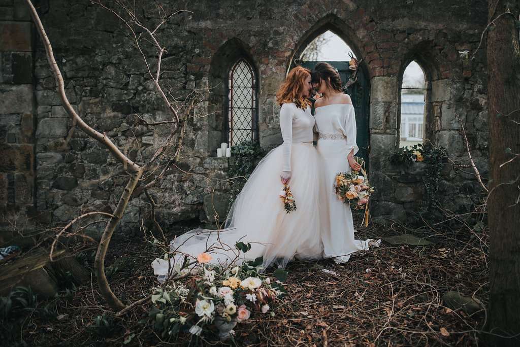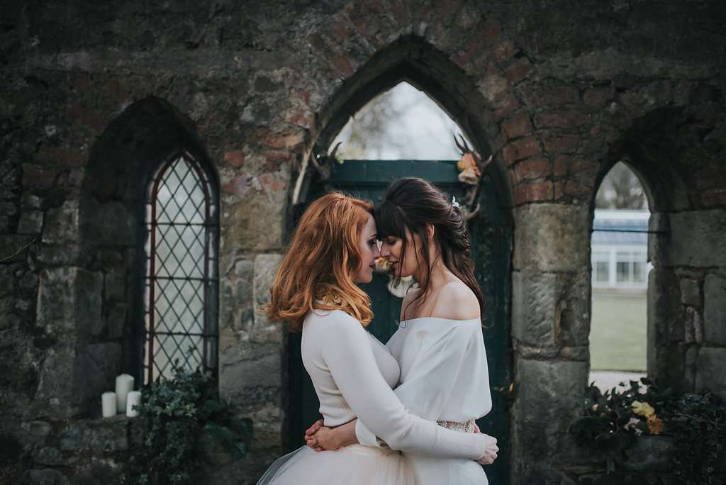 Inspired by pre-Raphaelite paintings, the gothic surroundings of Carlowrie Castle and the juxtaposition between light and dark, florist Lisa Gaston and MUA Laura Gray wanted to put together a shoot that depicted two beautiful brides with very different styles, but very much in love.