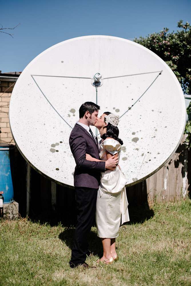 Aaron and Emma’s Australian wedding had a retro tropical theme. “Think a Connery-era James Bond-esque tiki bar plonked in the middle of a leafy oasis during twilight”, explained the bride. “We officially coined it as ‘Sparkly Jungle Chic’.”