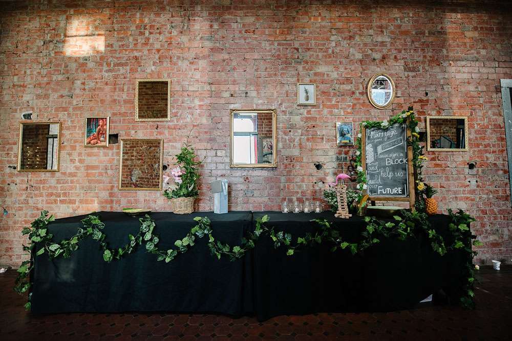 There was plenty of DIY at this decor-heavy celebration. “The biggest project was creating the 30-something centrepieces, which were terrariums featuring random curiosities we collected from vintage markets and via donations from friends”, Emma said. “We included toy dinosaurs, Star Wars figures, jungle critters and (the piece de resistance) a giant, ferocious Tiger Woods, laying waste to an unsuspecting streetscape, all aflame and be-rubbled!”