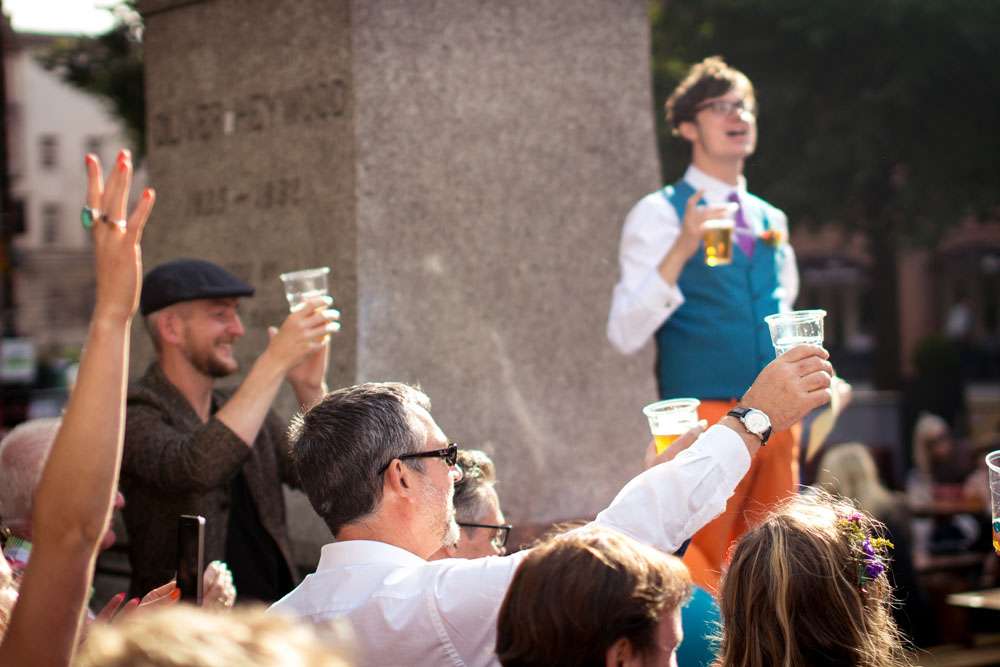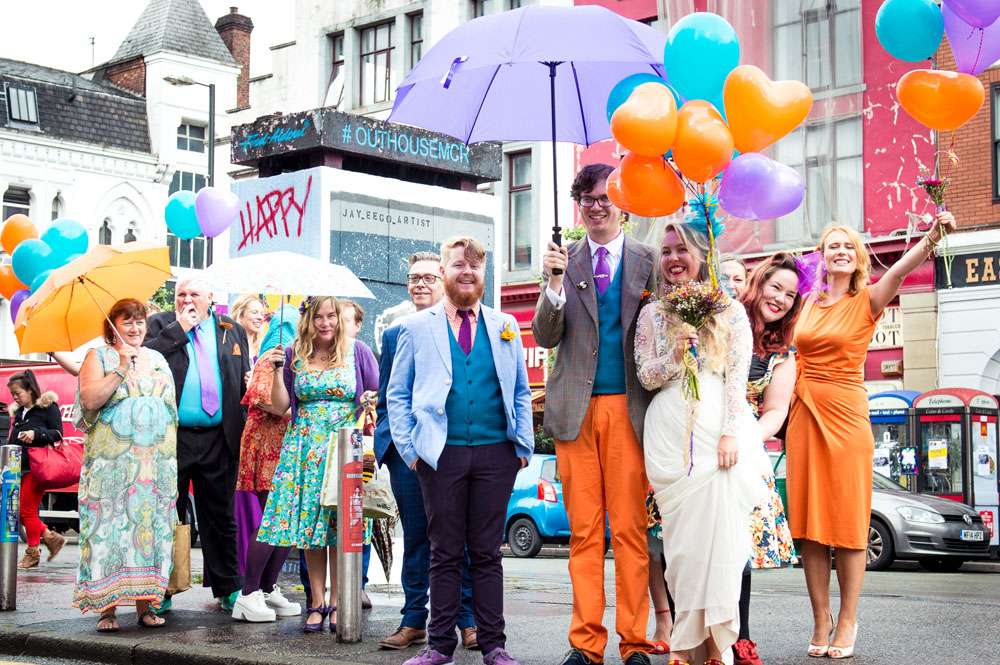 They wanted the day to have a party/festival feel to it so they had all their guests start the day in Manchester Jazz Festival square. “We did our speeches at the foot of one of the monuments with not just our wedding guests as an audience but quite a lot of members of the public too” said Jess, “it was great fun! We also did a wedding parade through the centre of town carrying colourful bunting on sticks, with a sound system playing David Bowie.”