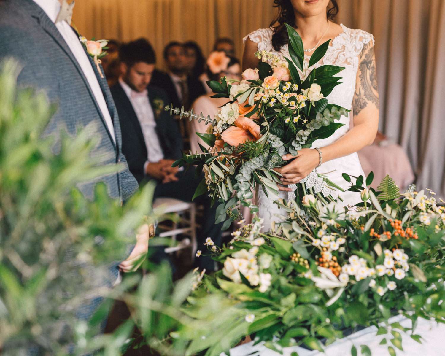 The bridesmaids all wore pink dresses of their own choosing to match the theme and the whole venue was decked out with plenty of flowers and foliage. “I’m Italian and Oli is English so we also want a bit of a English/ Italian theme. We wanted our wedding to reflect us, so we picked all the things we like and threw them in the mix. Our florist helped with this and we had olive trees and wine baskets filled with herbs on the tables. The venue looked and smelt amazing!”