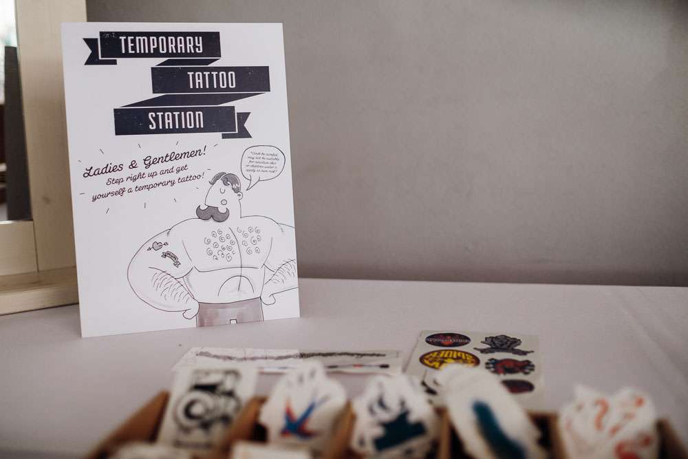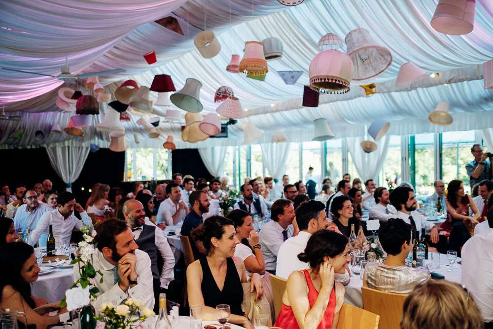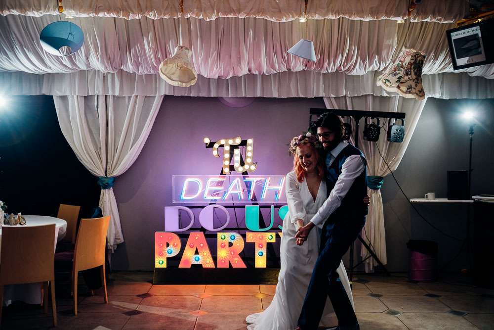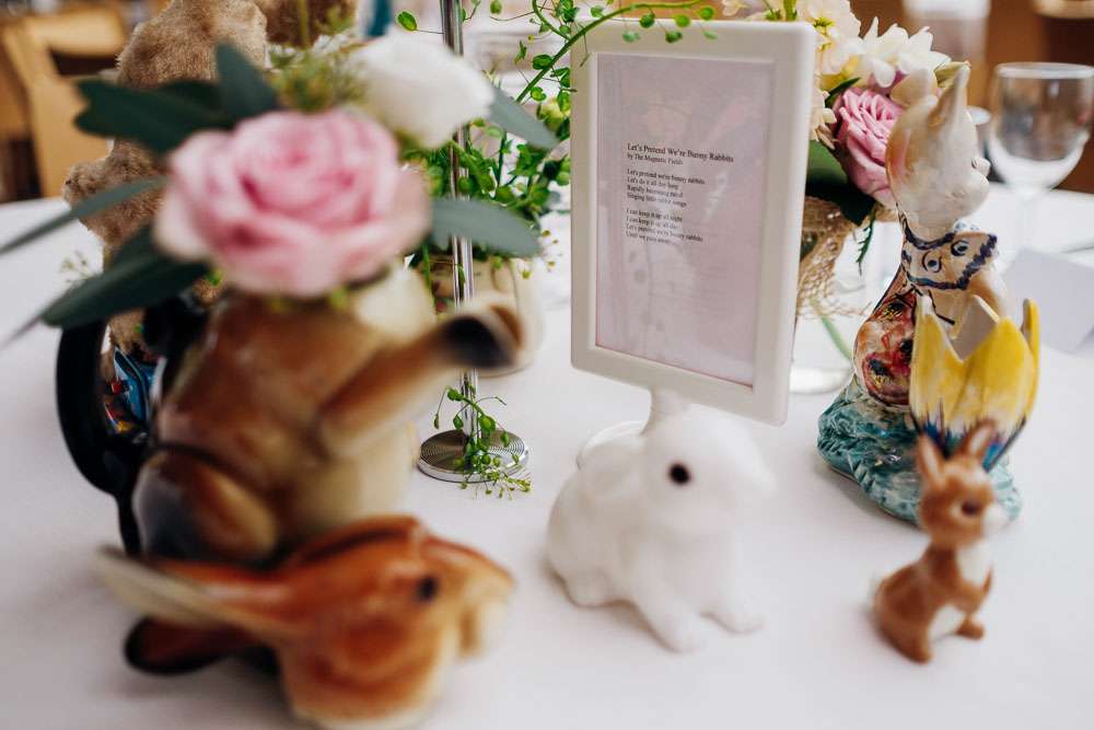 “We didn’t have a particular set theme, but we used a LOT of lampshades in our decorations. We also themed our tables around songs we love, and then bought kitschy bits and pieces from charity shops and car boot sale to fit the songs. For example, one of our tables was Love Cats, which we decorated by loads of cat figurines. We were quite picky about which bits to buy, favouring figurines that made us laugh, so the whole buying process took about a year to complete.”