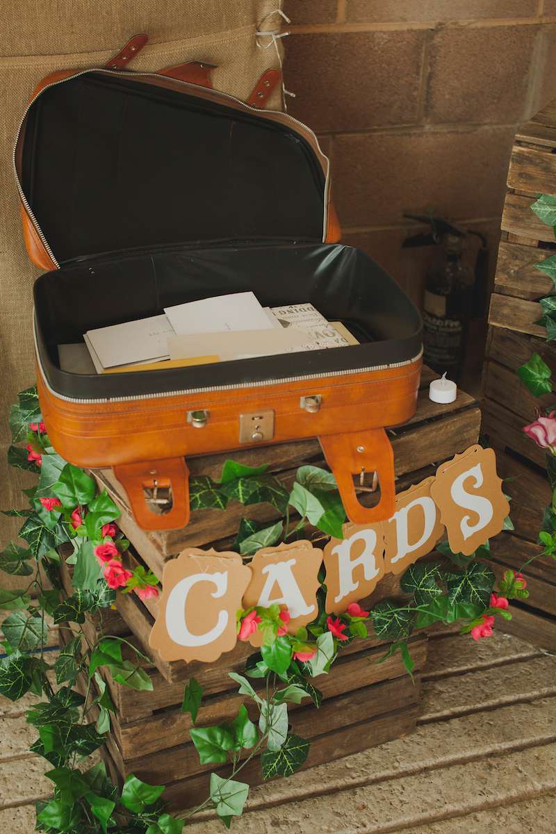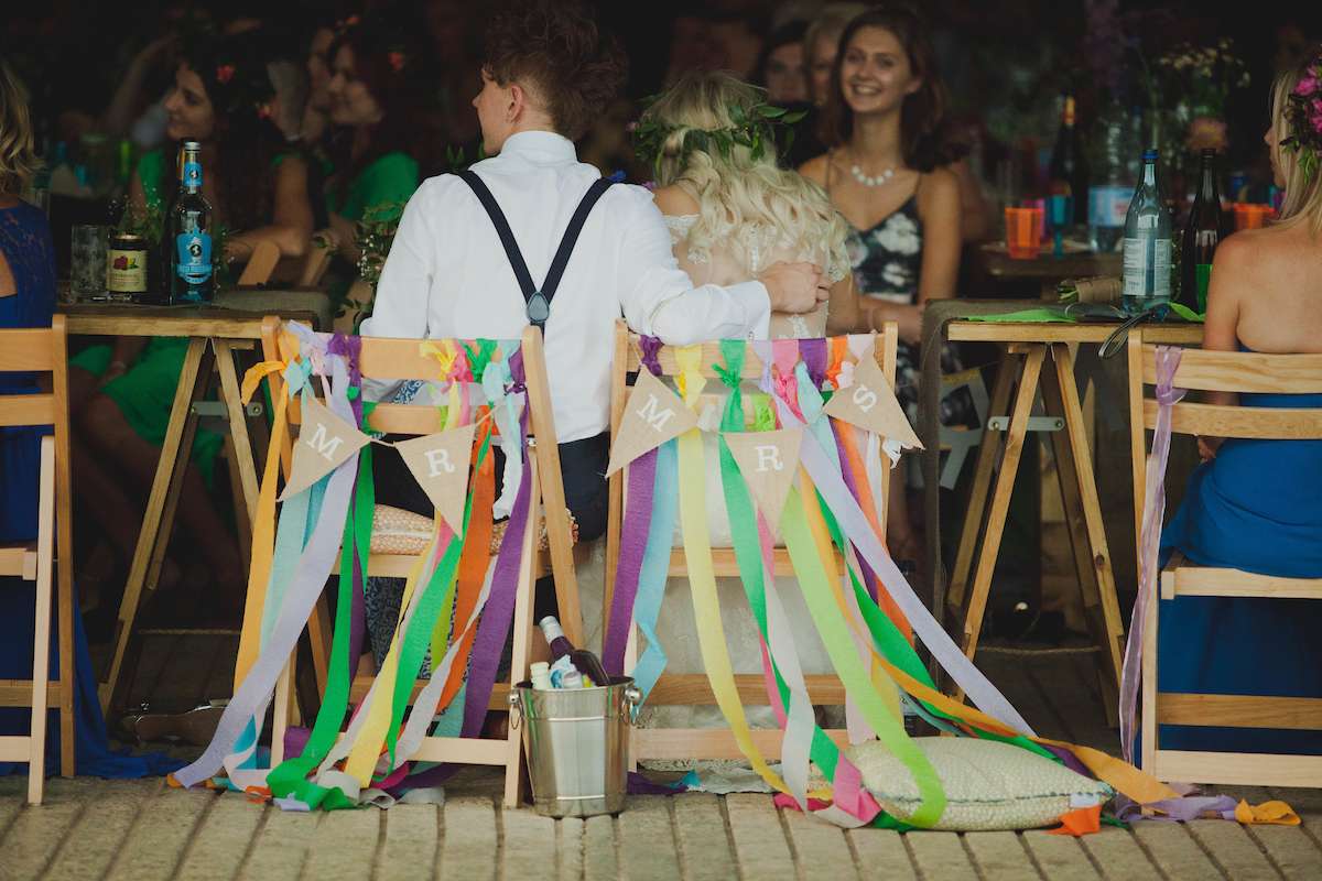 “The decorations and props are what made our wedding. We spent the week running up to it constantly setting up the aircraft hangar, which is usually just a dirty big warehouse, full of mud and oil, some farming machinery and a small aeroplane. Cory’s mum, Sarah, knitted bunting and creating all sorts of crafty decorations that we streamed and hung around the massive building. We bought hundreds of multi-coloured streamers online and hung these over the seating area. We hung pom-poms, umbrellas, lanterns and festoon lights above the dance floor. We used hessian to cover up some of the walls and used fake ivy and greenery to fill areas and make photo booths. All our friends saved up glass bottles and jars which we filled with flowers and to put on the tables and scatter around the room.”
