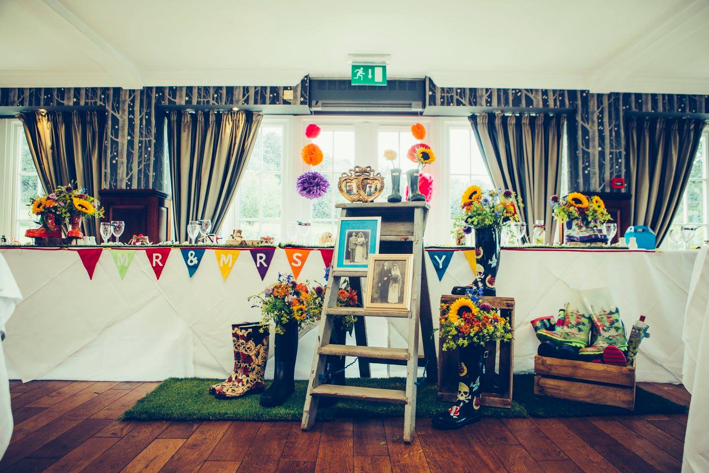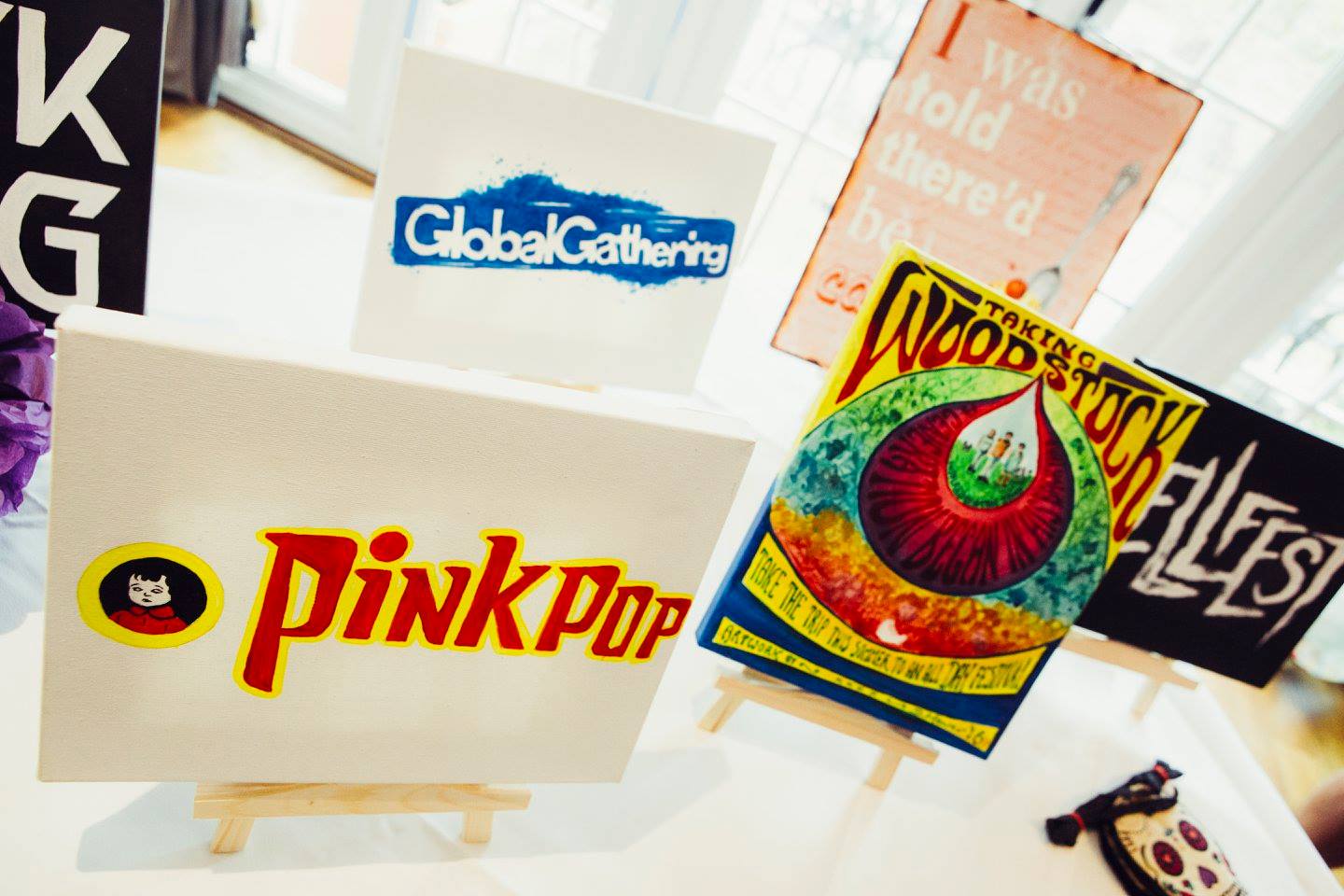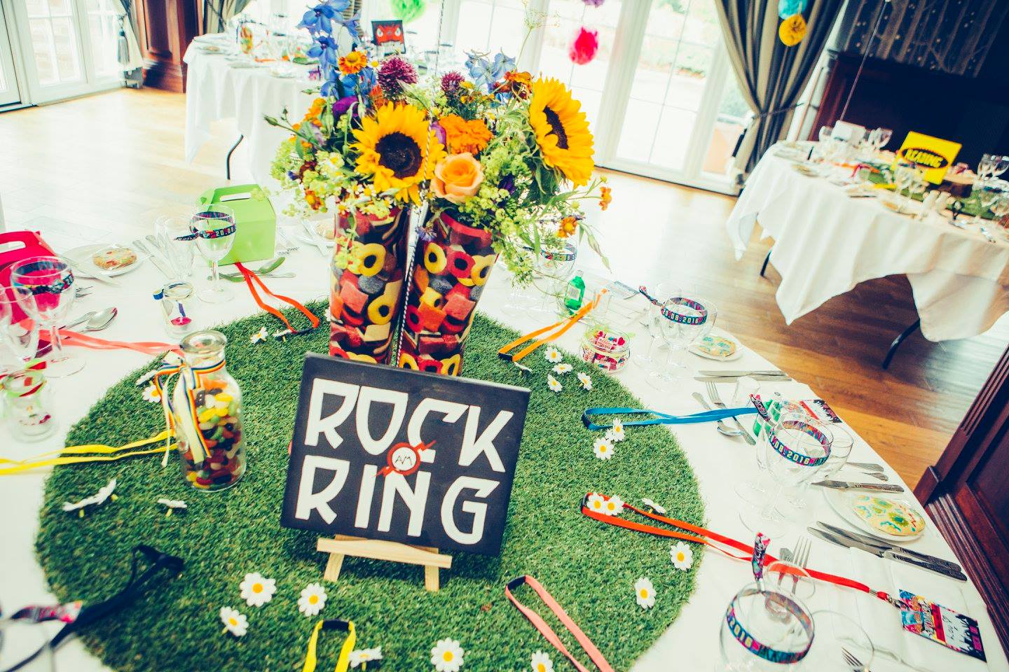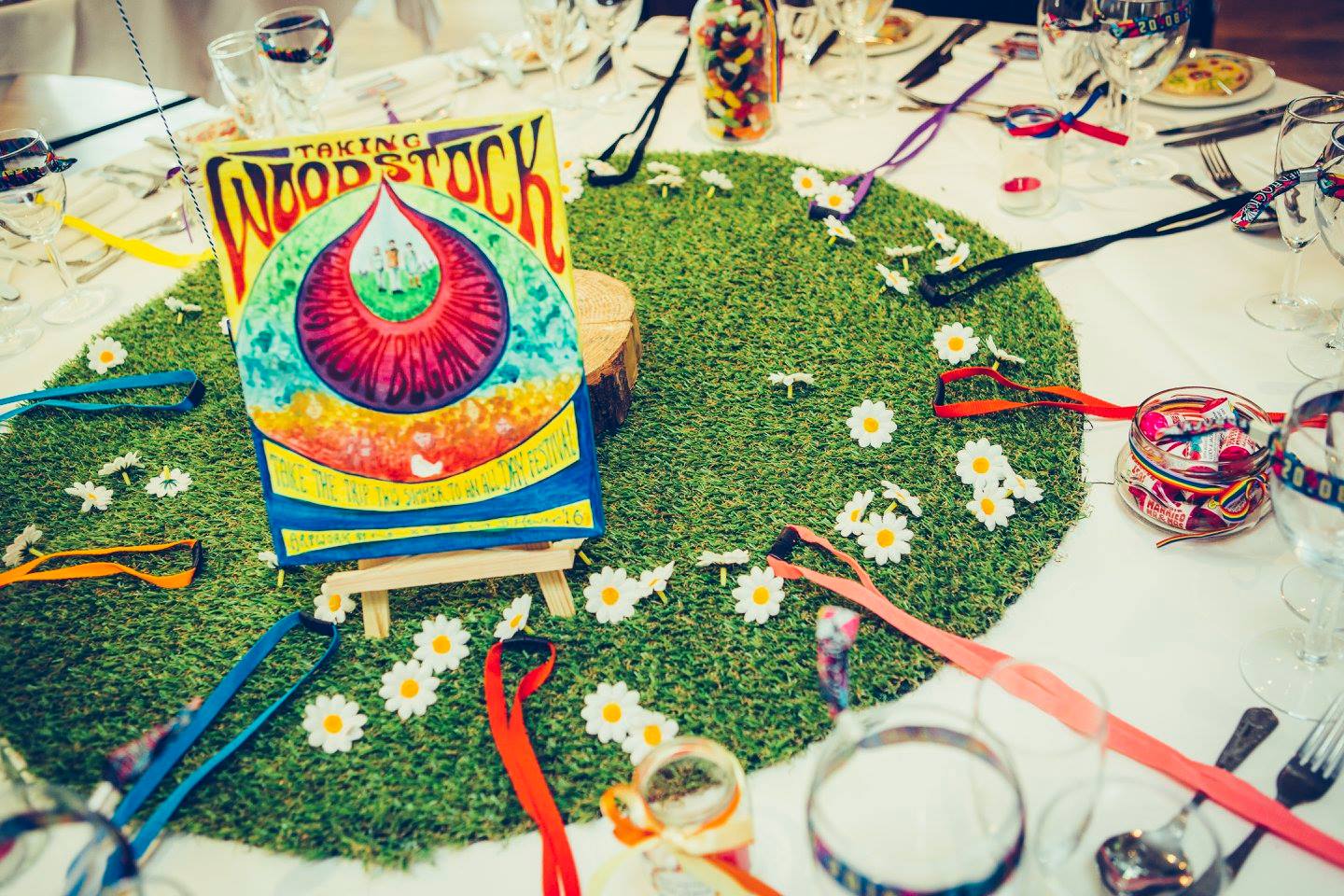 “For the tables, we wanted them to have a festival field look to them, so we had a piece of astroturf in the centre, scattered with daisies, and wellies filled with flowers sitting on a tree stump on top. We also had our friend Daniel Hewer paint the table names which were festival logos. We decided not to have a colour scheme; we just wanted everything as bright as possible. It made things so much easier; we didn’t have to think about what went with what, if it was bright and it rocked, we went with it.”