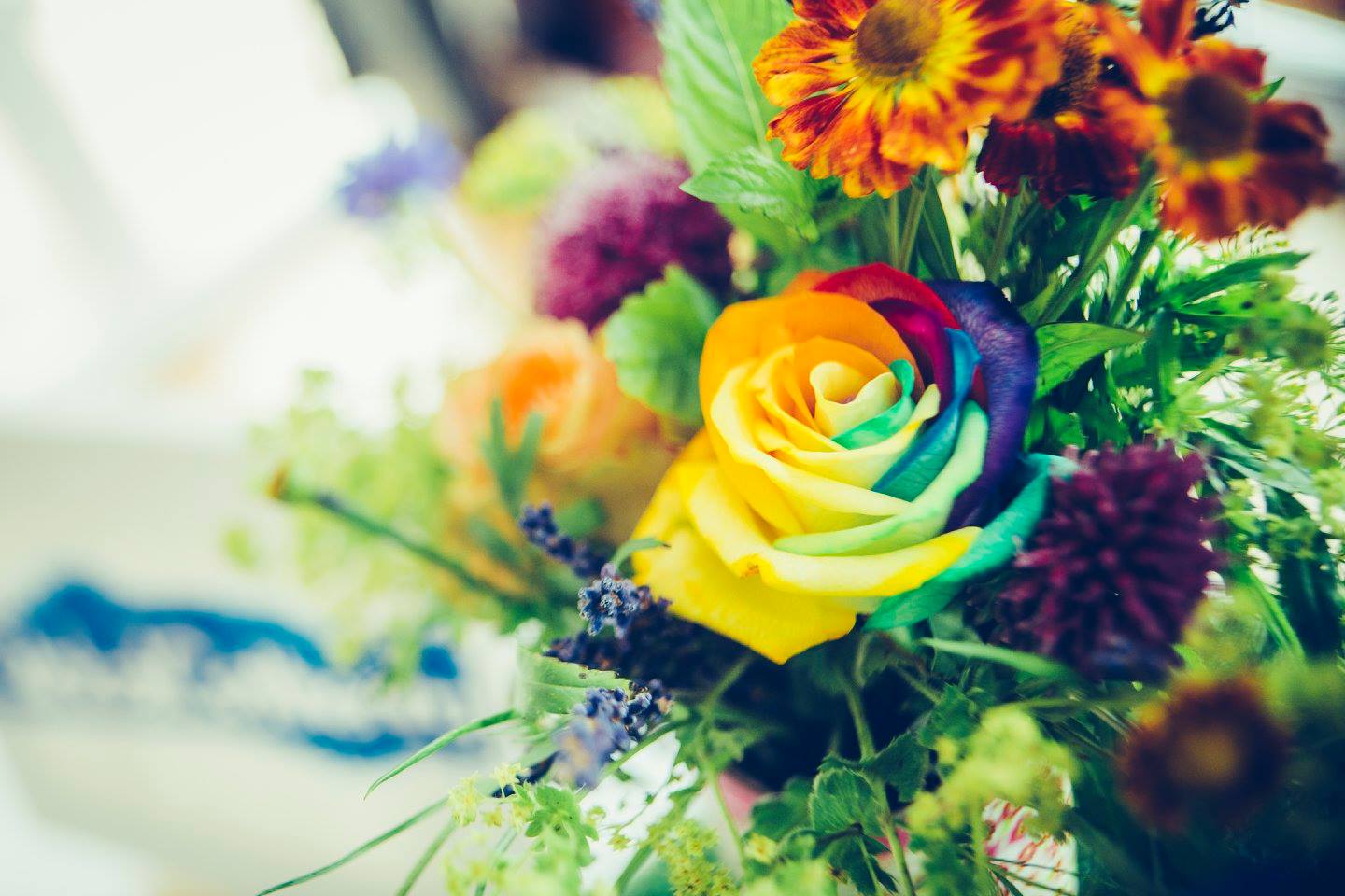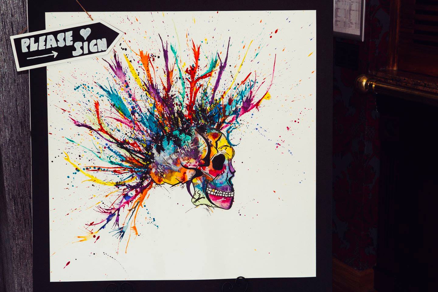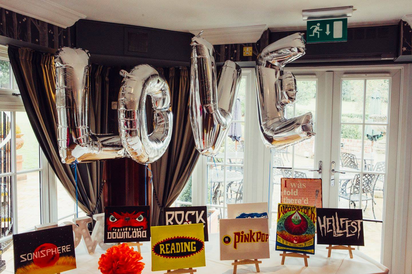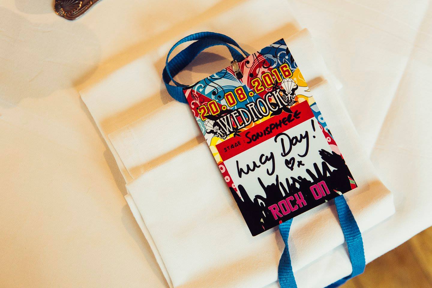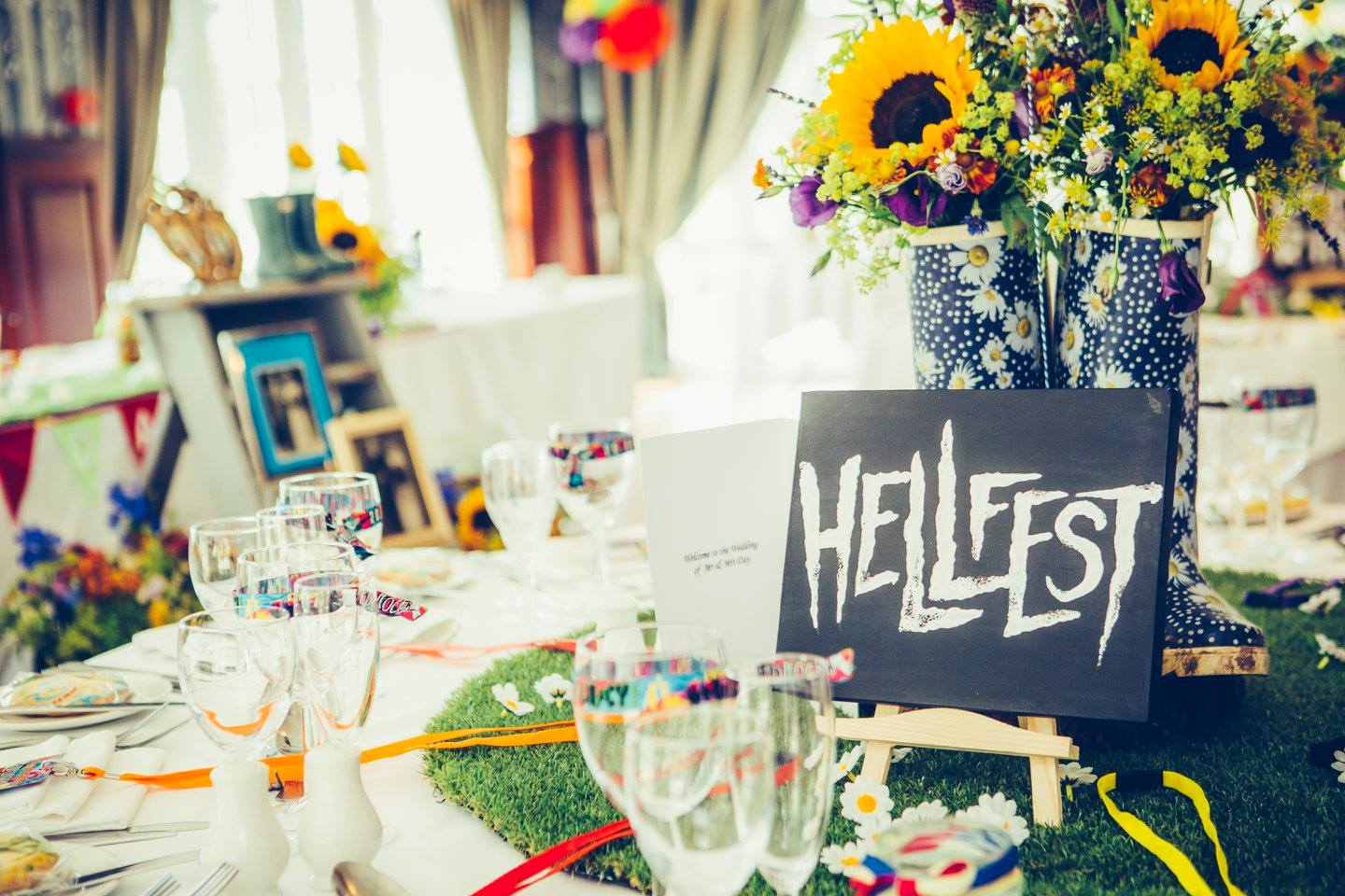 “For the tables, we wanted them to have a festival field look to them, so we had a piece of astroturf in the centre, scattered with daisies, and wellies filled with flowers sitting on a tree stump on top. We also had our friend Daniel Hewer paint the table names which were festival logos. We decided not to have a colour scheme; we just wanted everything as bright as possible. It made things so much easier; we didn’t have to think about what went with what, if it was bright and it rocked, we went with it.”