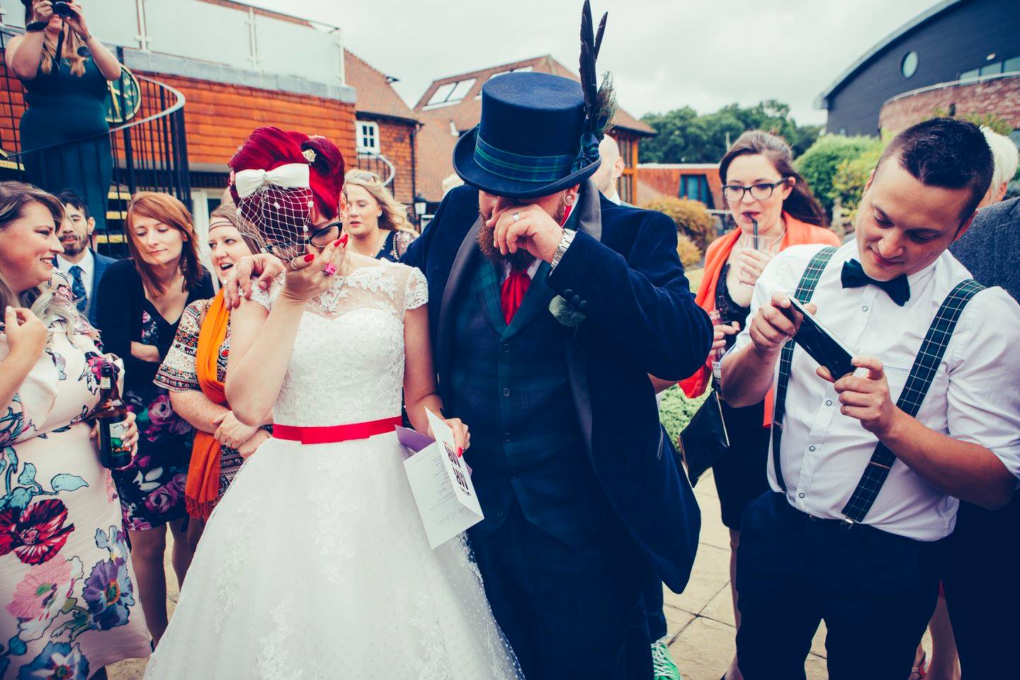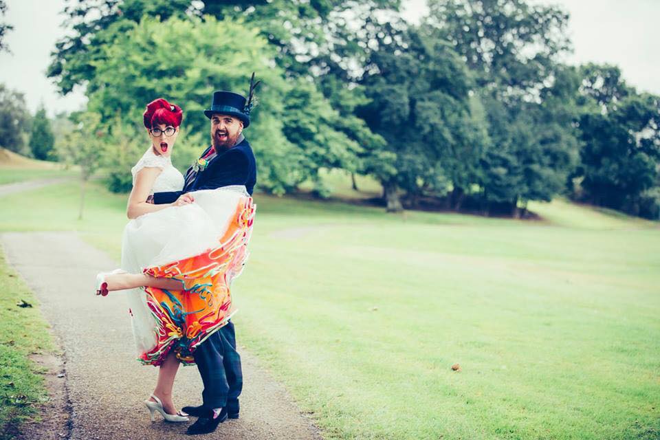 Lucy and Jack wanted their wedding to have a music festival vibe, but indoors. They hired Old Thornes Hotel in Liphook and were married in August. “We called our wedding WedRock” said the bride. “It was a celebration of us, our love of rock and metal music, and just having a good time with our family and friends. Music was a huge inspiration. Jack and I have been to so many gigs and festivals together, we’ve literally lived our lives to music. It was important to us that it featured all of the songs we love that hold memories of some very special times we’ve spent together.”