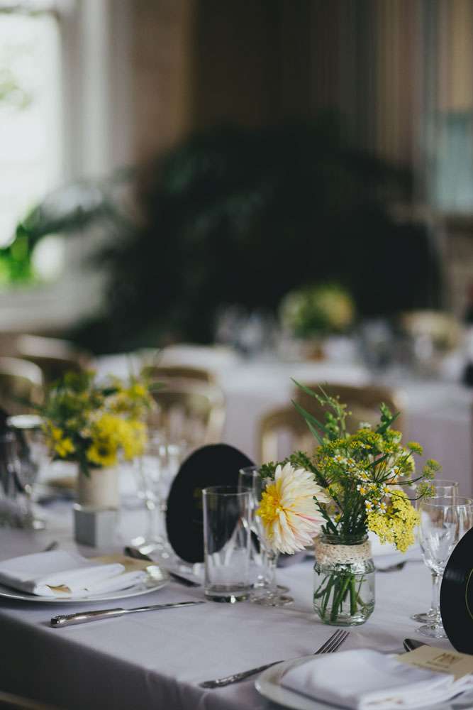 “For flowers we kept it simple, I told our florist it would be rude to not have daisies given it’s my name, and said I like the colour yellow. That was pretty much it! My friend lent me loads of jam jars, we wrapped some lace and string around them and that was that.”