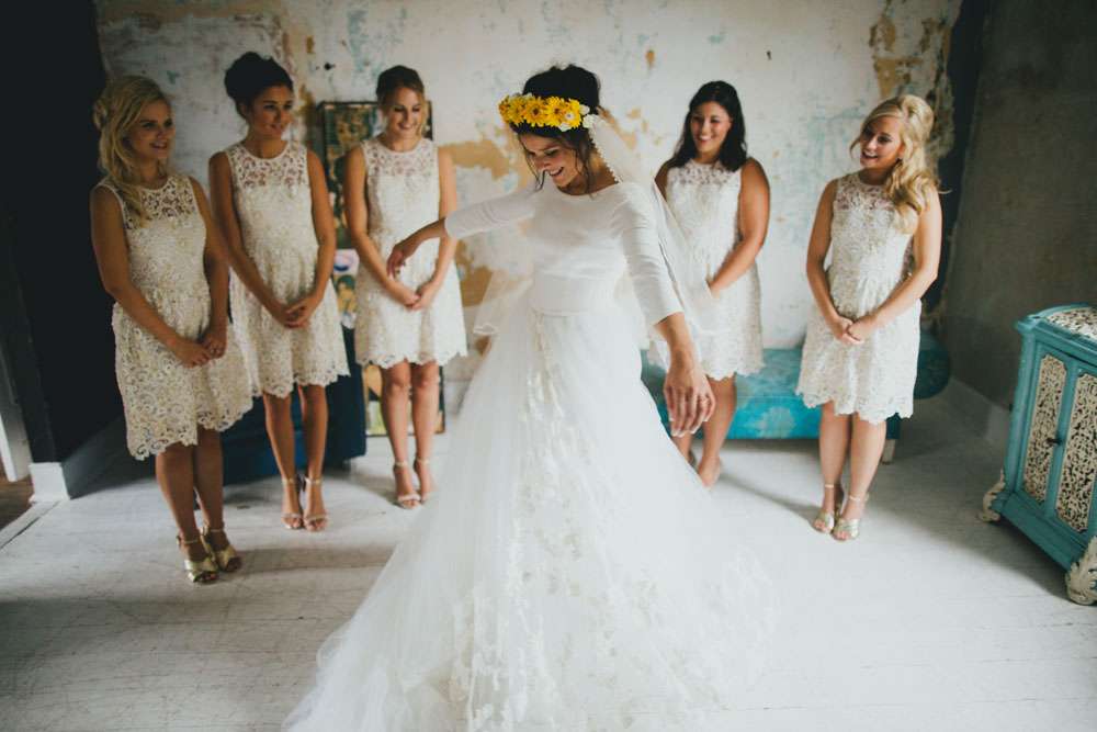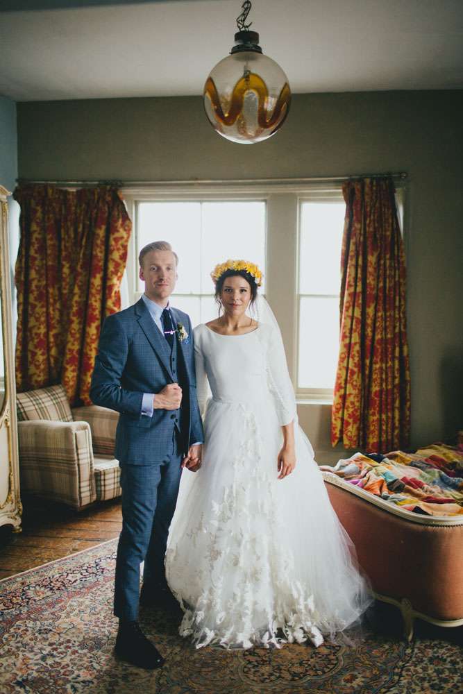 The bride wore a dress she’d fallen in love with online. She took the risk and ordered it from BHLDN who are based in the US. “When I was initially looking for a wedding dress, I was thinking something very simple – straight, bit floaty and plain” she explained. “Well, I definitely didn’t go down that route on the day! I’d fallen in love with a dress from New York which was inspired by Olivia Palermo’s wedding skirt and top combo. It had a plain long sleeve top with a low back, and a big tulle skirt with embroidery going up the middle in a point. I’d found it on Pinterest, pinned it, and couldn’t stop going back to look at it.”