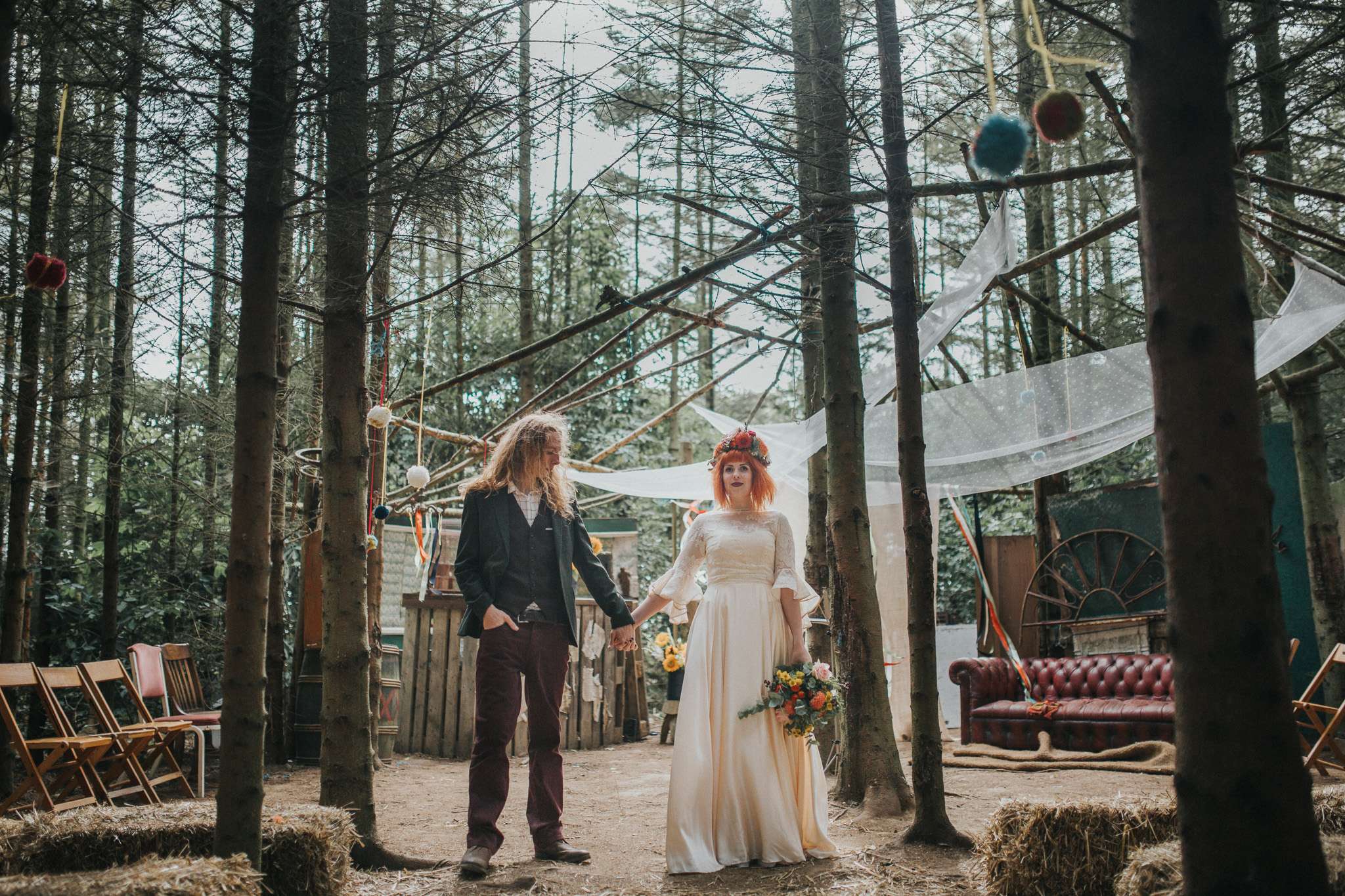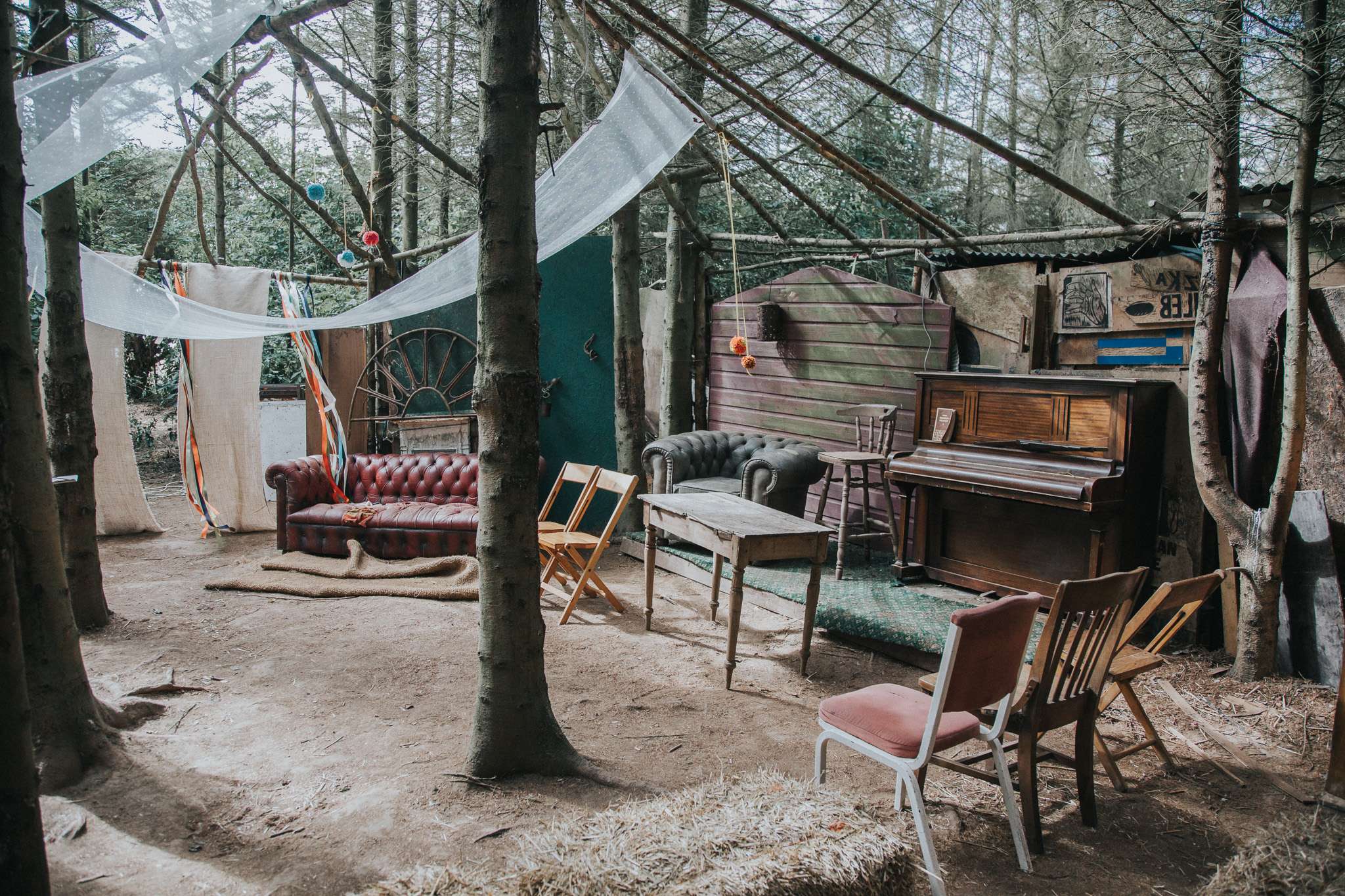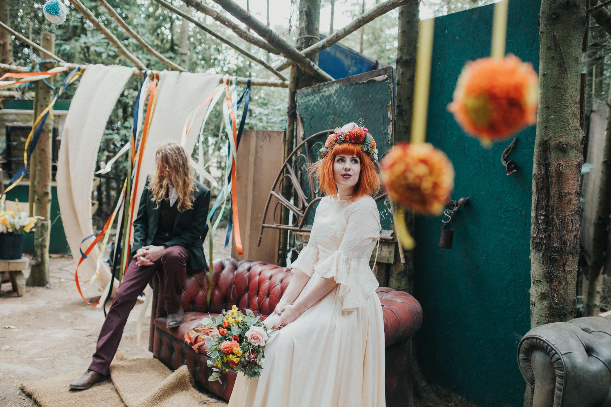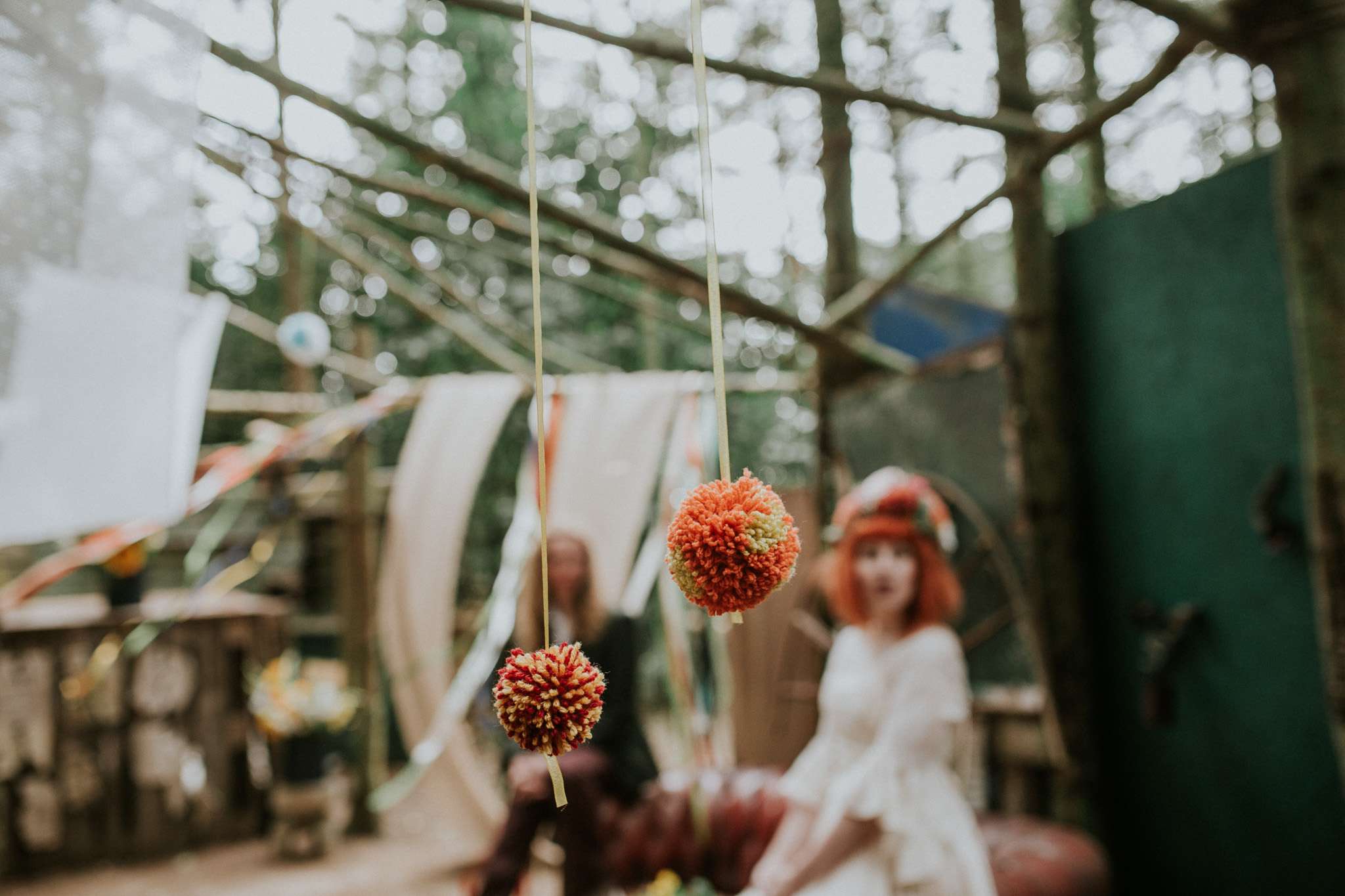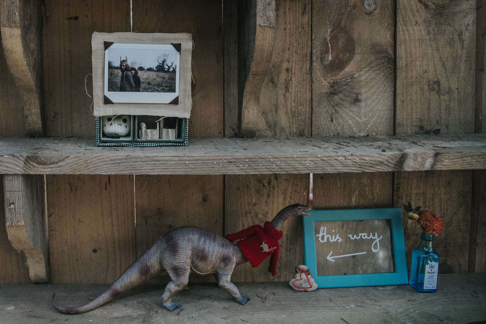 The whole space had a kind of indoor/ outdoor feel with lots of furniture set up around the woods. They had sofas, wardrobe, doors… even an old piano! “We were really lucky that the annual Smugglers Festival took place a week before our wedding at the same site, so we were able to use a lot of existing decor including old chesterfield sofas, old pianos, tents and straw bales for the ceremony. We just added lots of mini dinosaur figures and pompoms!”