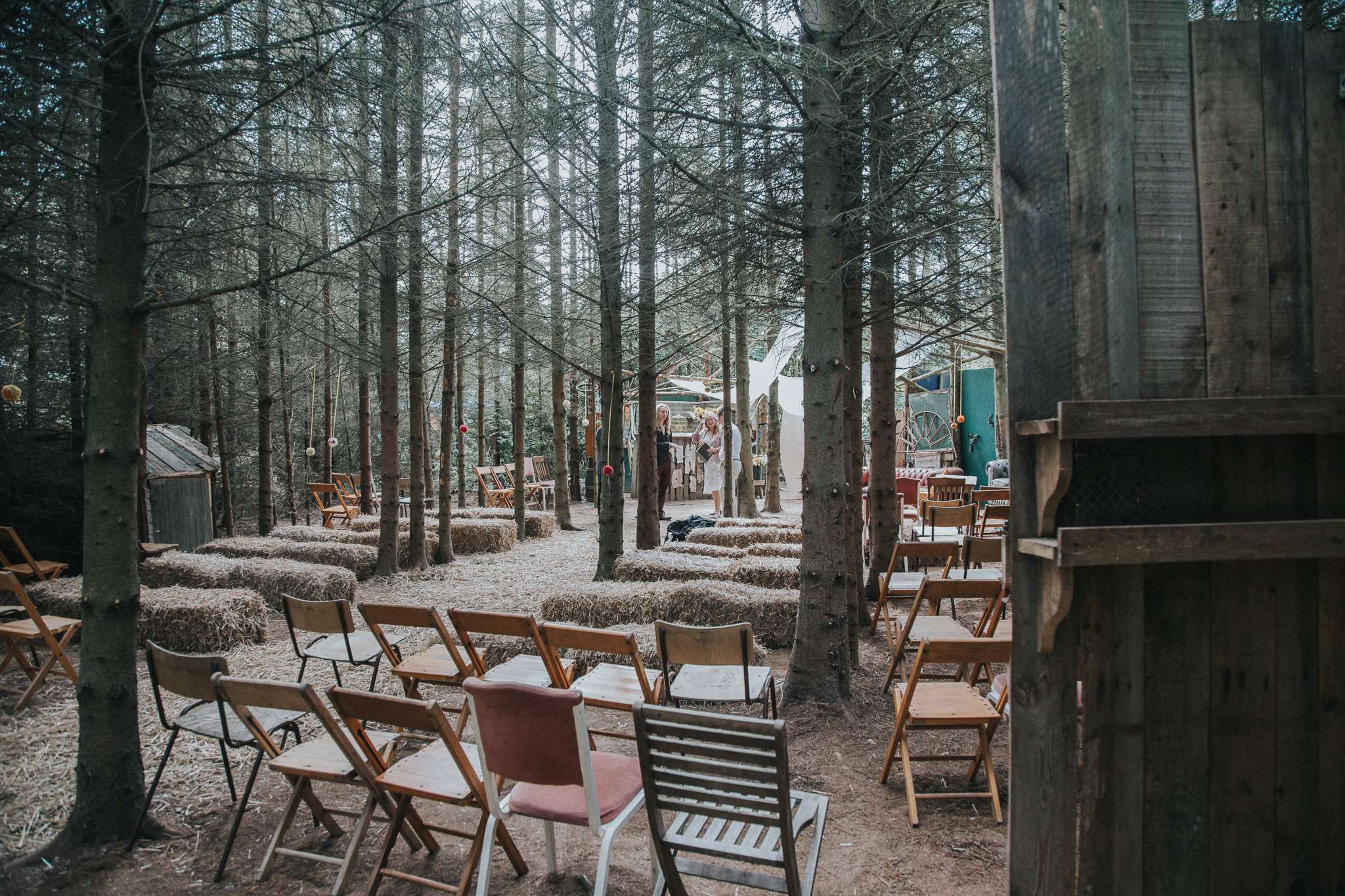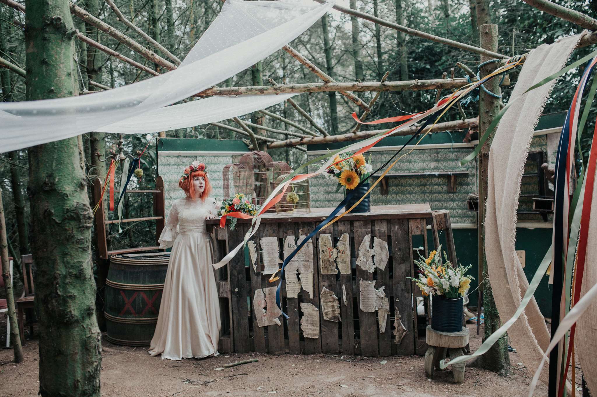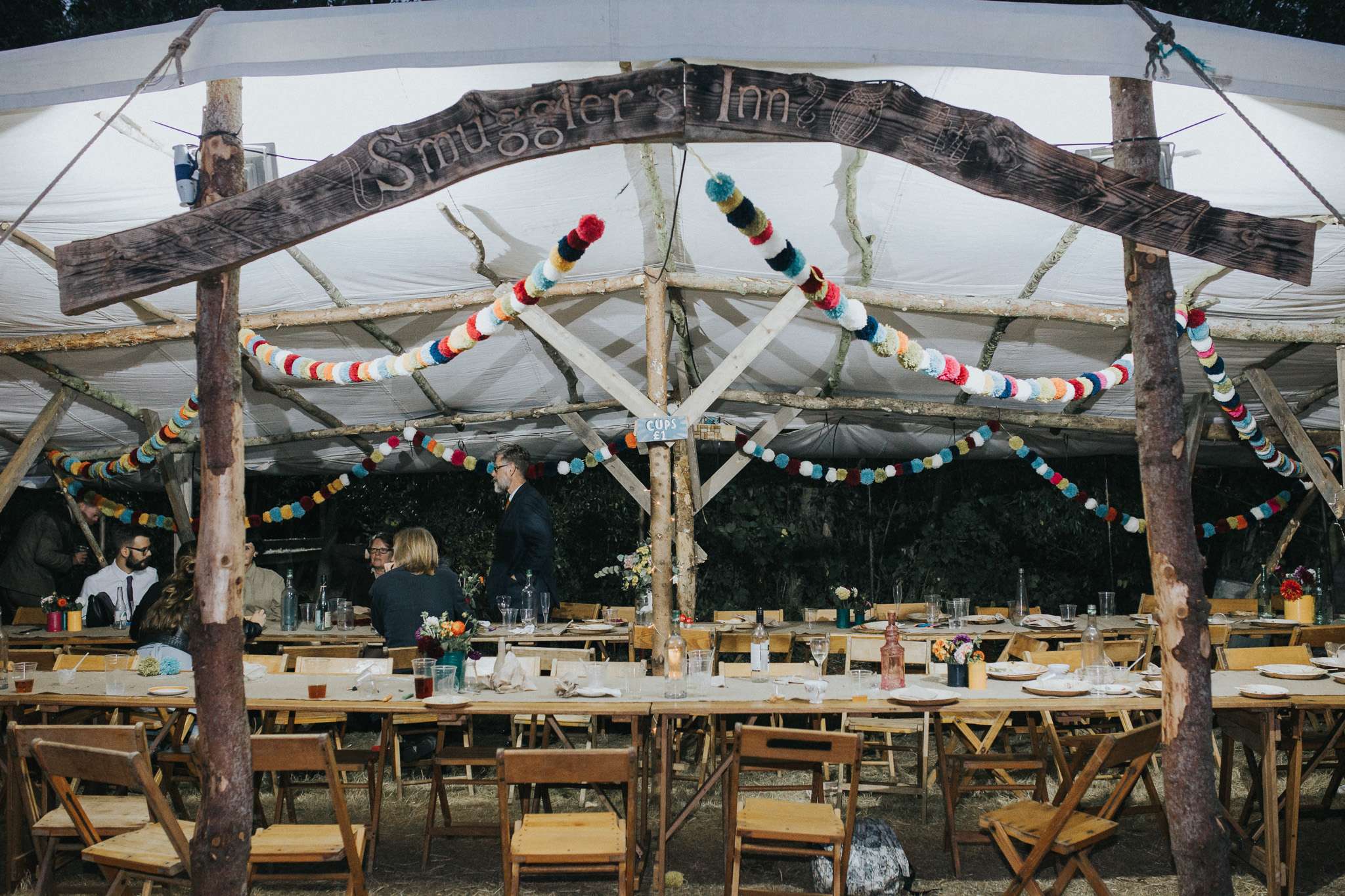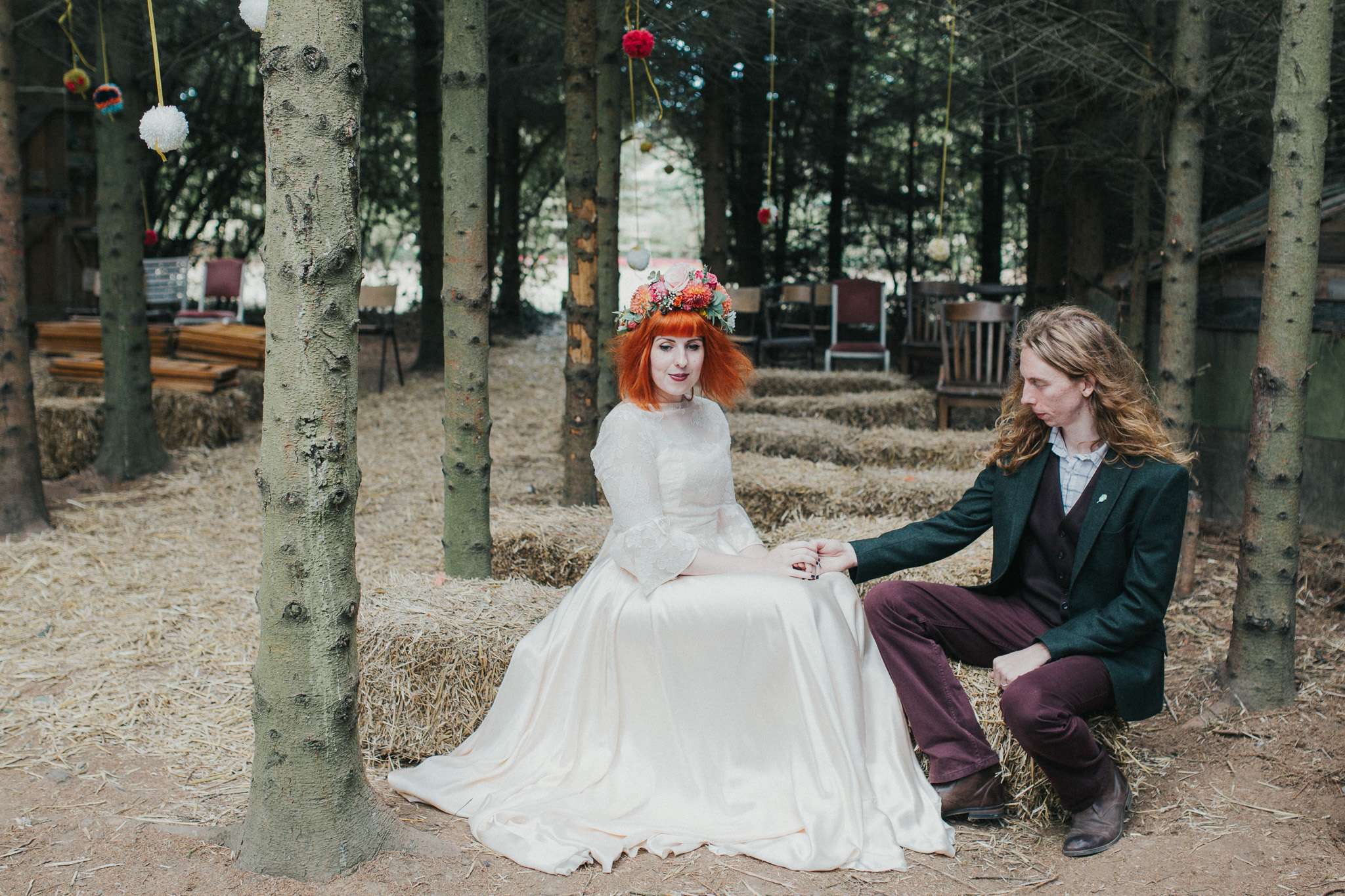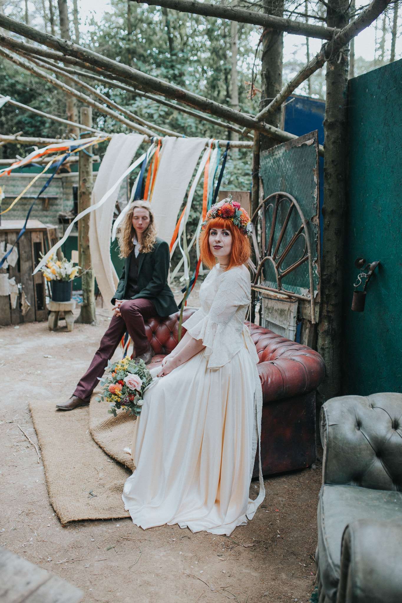 The whole space had a kind of indoor/ outdoor feel with lots of furniture set up around the woods. They had sofas, wardrobe, doors… even an old piano! “We were really lucky that the annual Smugglers Festival took place a week before our wedding at the same site, so we were able to use a lot of existing decor including old chesterfield sofas, old pianos, tents and straw bales for the ceremony. We just added lots of mini dinosaur figures and pompoms!”