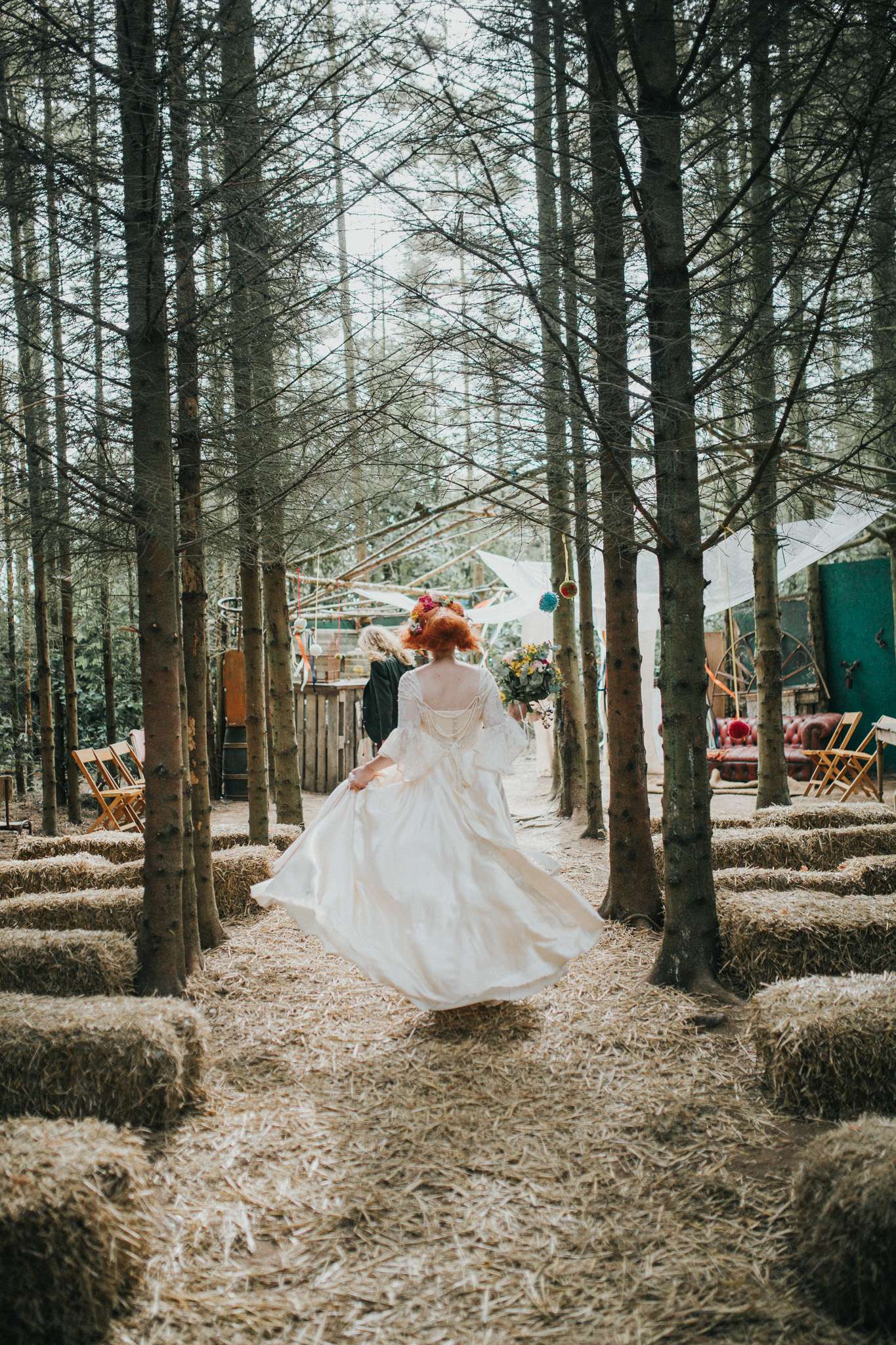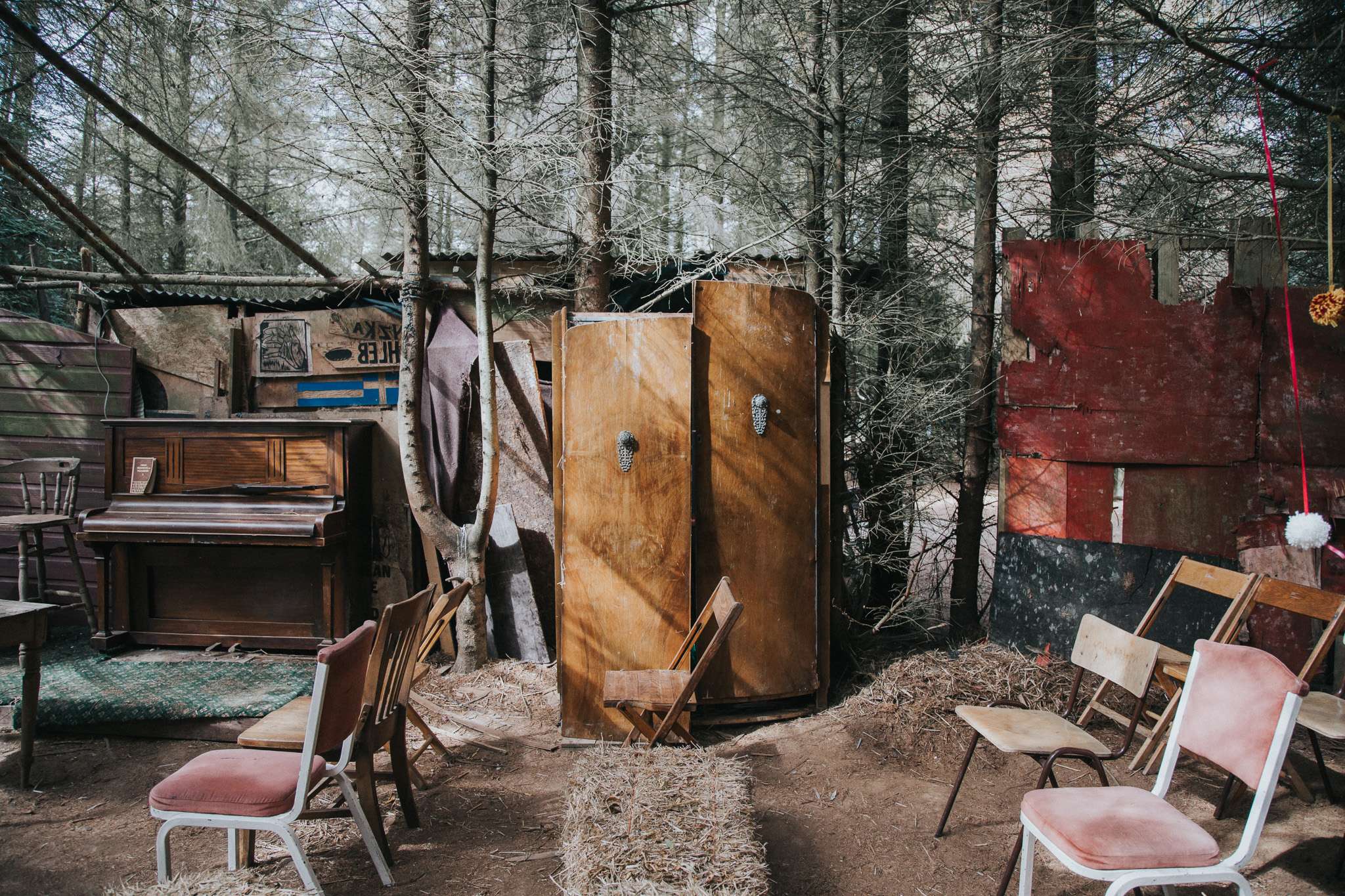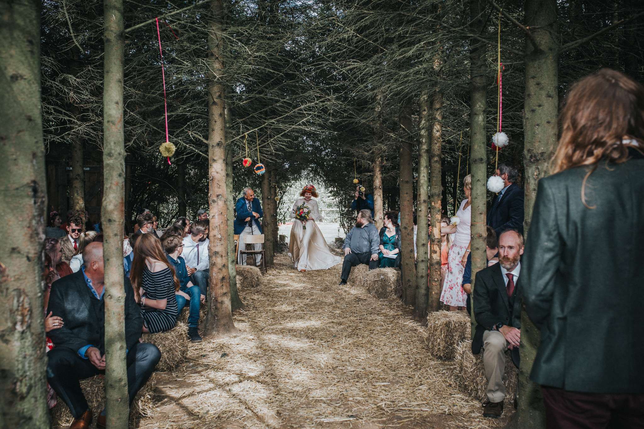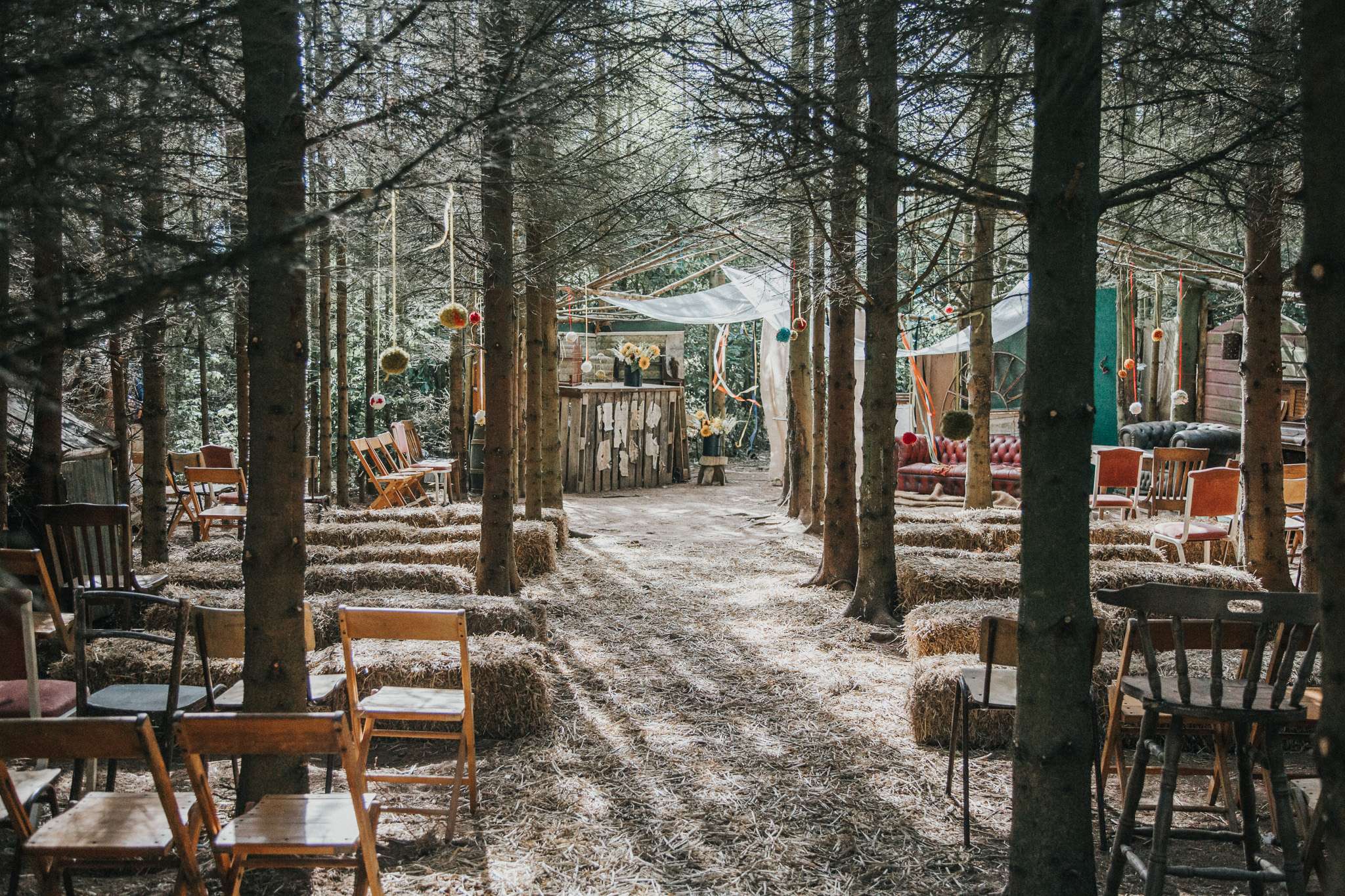 The whole space had a kind of indoor/ outdoor feel with lots of furniture set up around the woods. They had sofas, wardrobe, doors… even an old piano! “We were really lucky that the annual Smugglers Festival took place a week before our wedding at the same site, so we were able to use a lot of existing decor including old chesterfield sofas, old pianos, tents and straw bales for the ceremony. We just added lots of mini dinosaur figures and pompoms!”